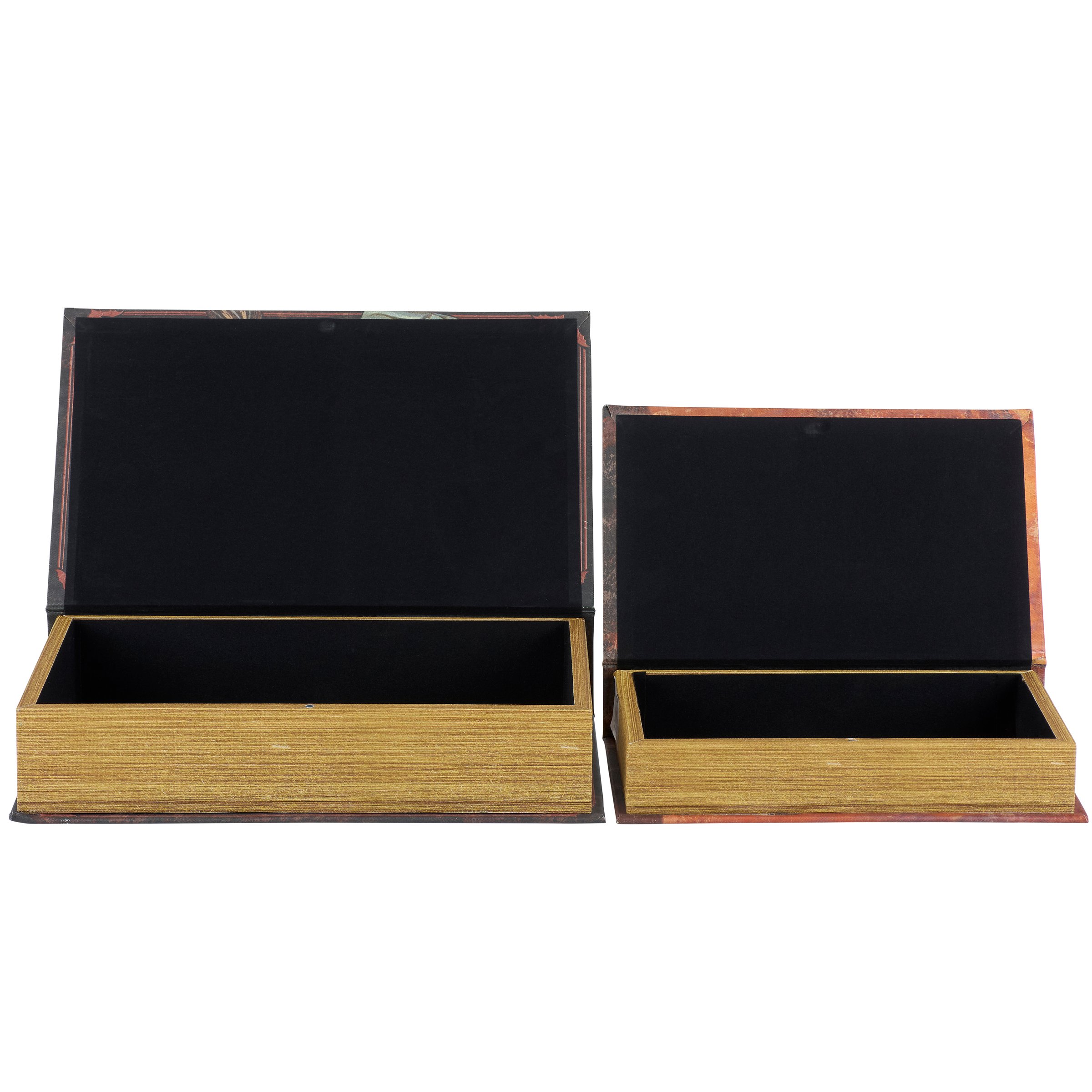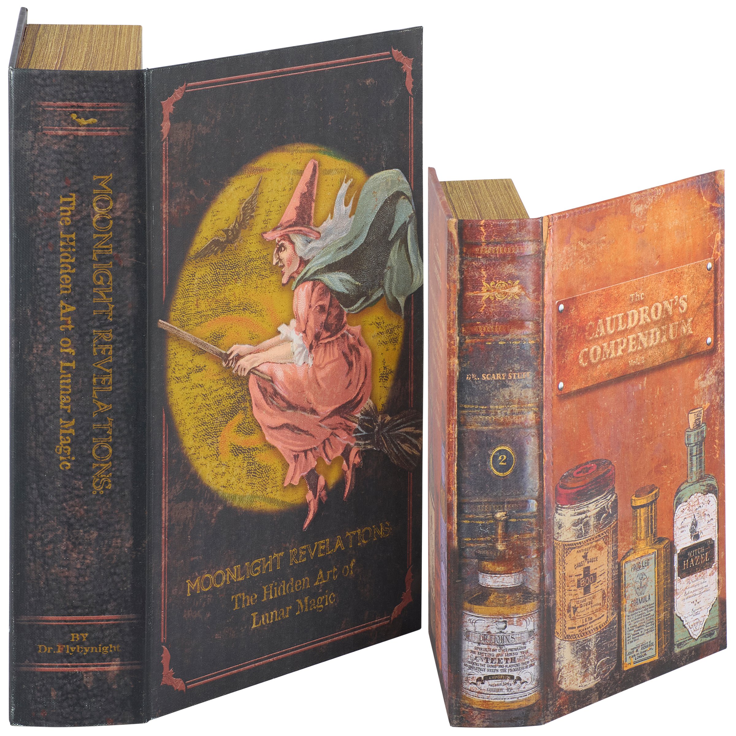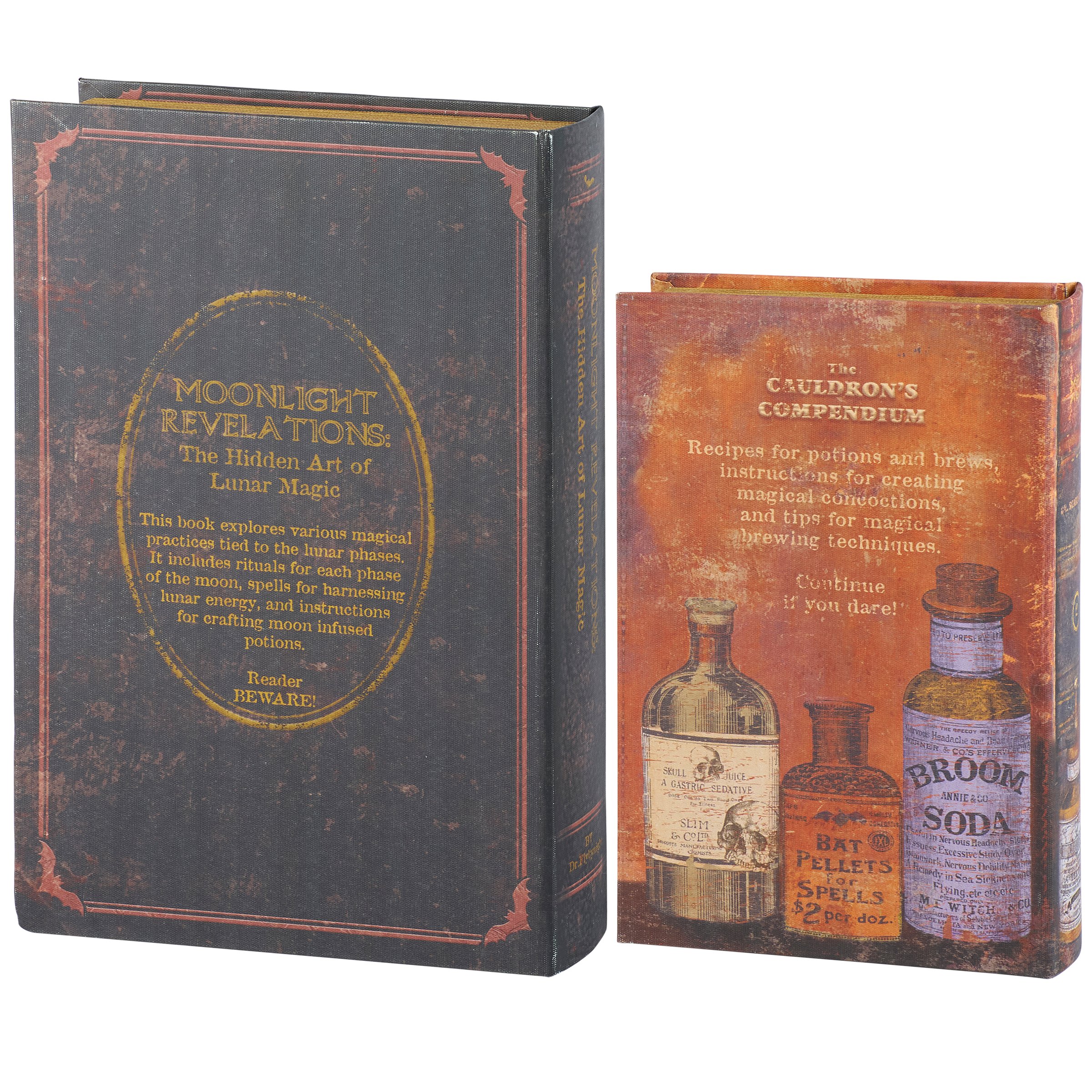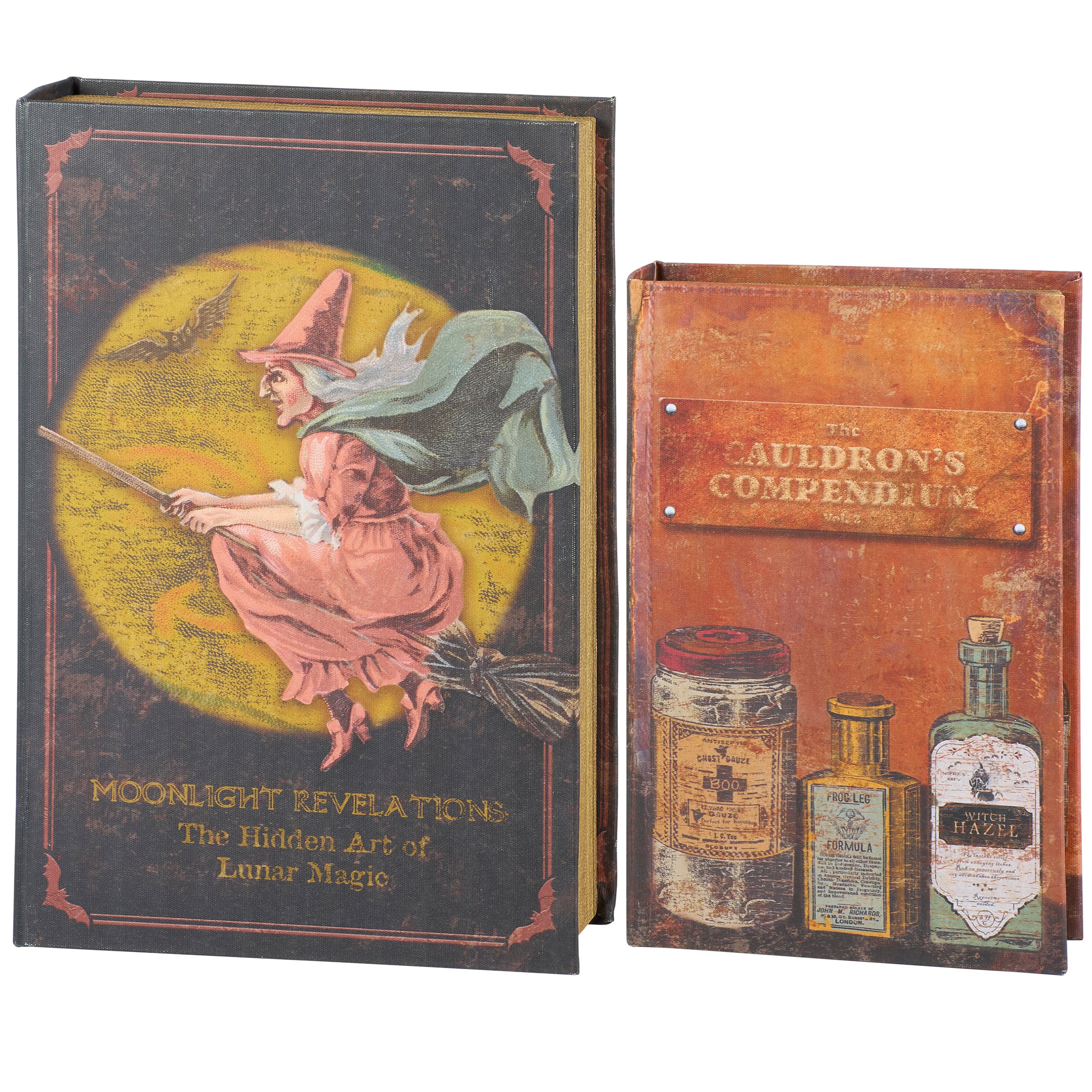 A set of 2 decorative boxes from our Halloween Collection displaying coordinating book designs in different sizes inspired by cottagecore home décor. Each Halloween book box features a textured canvas wrap displaying the exterior of a vintage book with distressed details and witch themed designs as well as titles including "Moonlight Revelations - The Hidden Art of Lunar Magic" and "The Cauldron's Compendium." This set of vintage witch book boxes also display coordinating title designs on the side to give the appearance of a book spine when on a shelf and a synopsis on the back for each book. The front covers open to reveal a velvet lined space for storing items with a magnet closure for secure storage when standing up. Our Art Of Lunar Magic book box set can be used upright on a bookshelf or laid flat with the cover open displaying decorative accents inside. A set of witch themed home accents perfect for storing keepsakes in style or for decorating vintage Halloween displays.