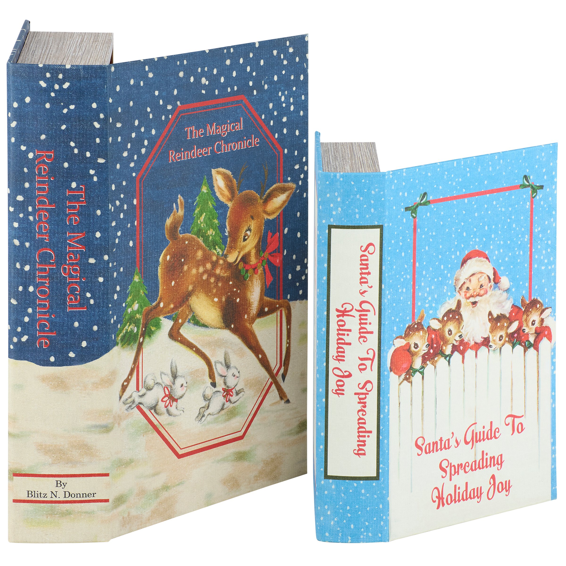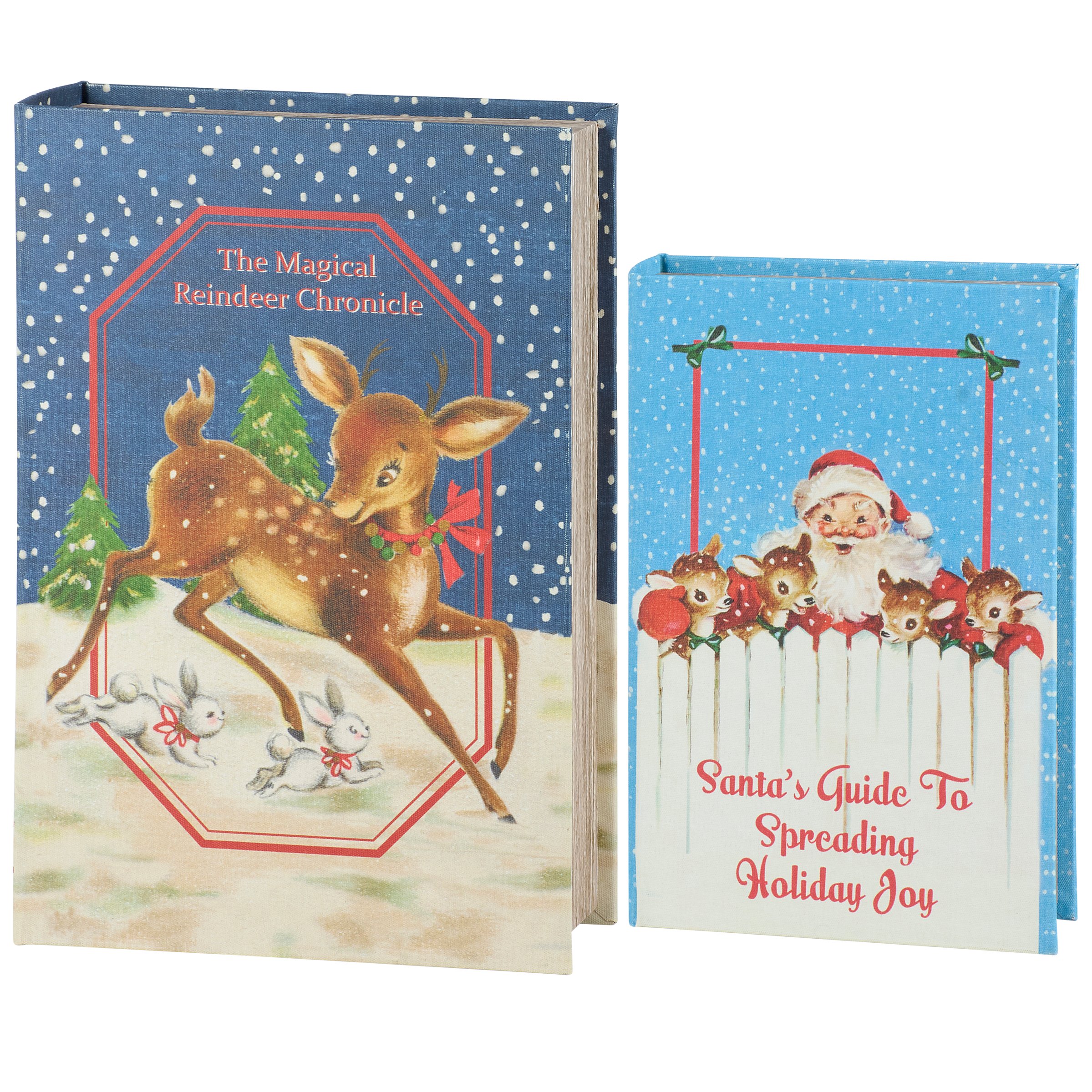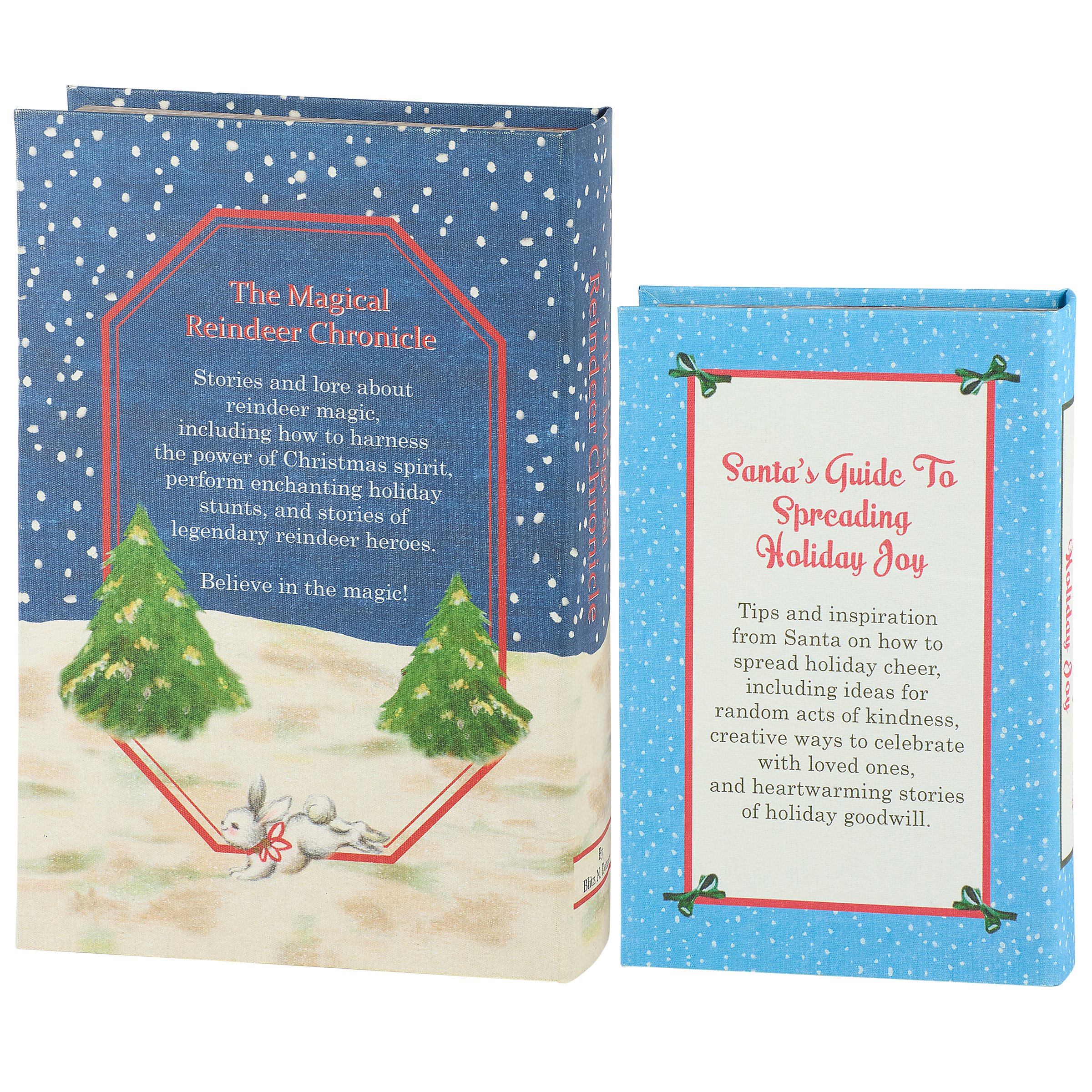 A set of 2 decorative boxes from our Christmas Collection displaying coordinating book designs in different sizes inspired by retro Christmas home décor. Each Christmas book box features a textured canvas wrap displaying the exterior of a vintage book with distressed details and colorful reindeer designs as well as titles including "The Magical Reindeer Chronicle" and "Santa's Guide To Spreading Holiday Joy." This set of retro Christmas book boxes also display coordinating title designs on the side to give the appearance of a book spine when on a shelf and a synopsis on the back for each book. The front covers open to reveal a velvet lined space for storing items with a magnet closure for secure storage when standing up. Our Magical Reindeer Chronicle book box set can be used upright on a bookshelf or laid flat with the cover open displaying decorative accents inside. A set of reindeer themed home accents perfect for storing keepsakes in style or for decorating retro Christmas displays.