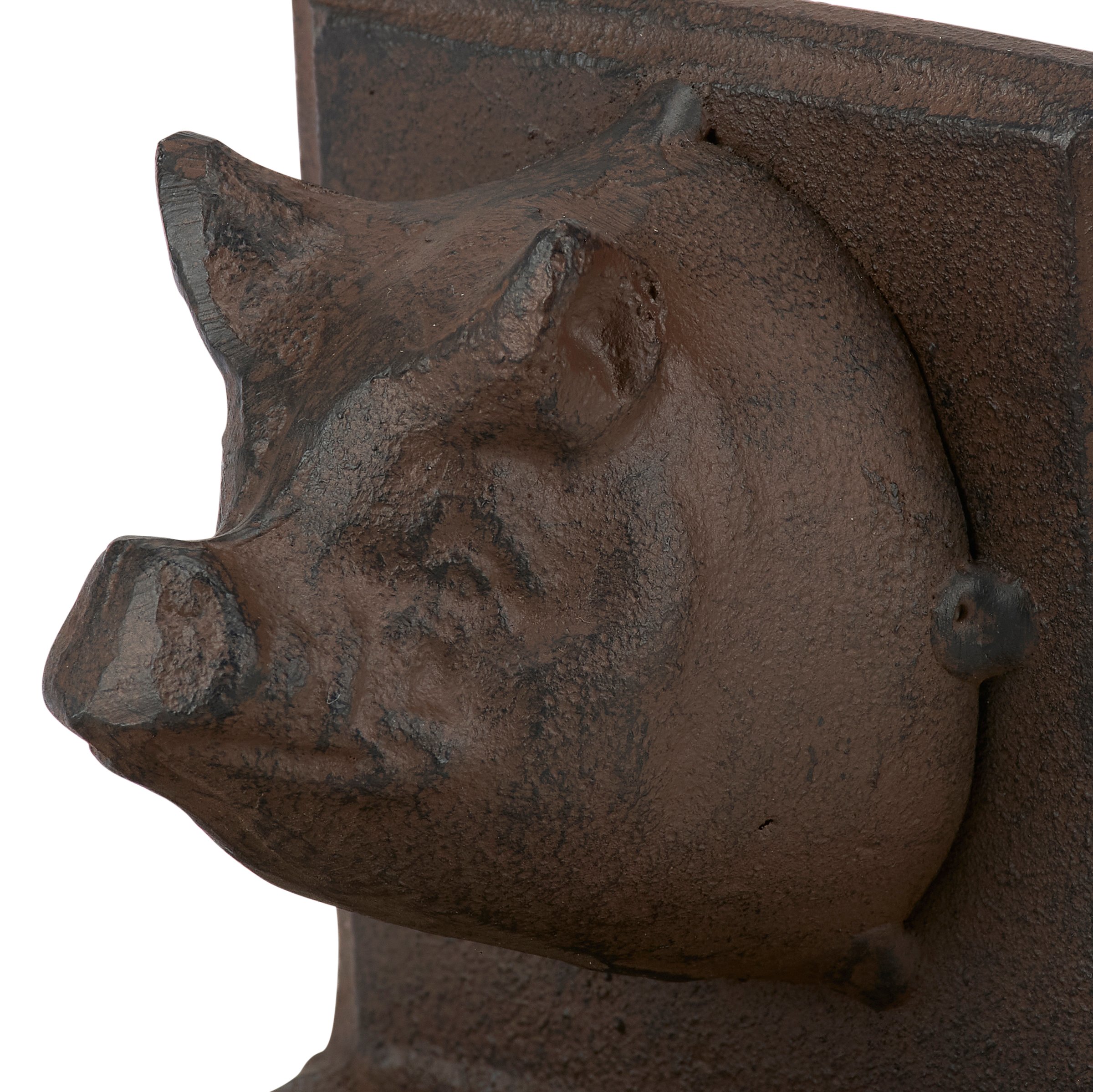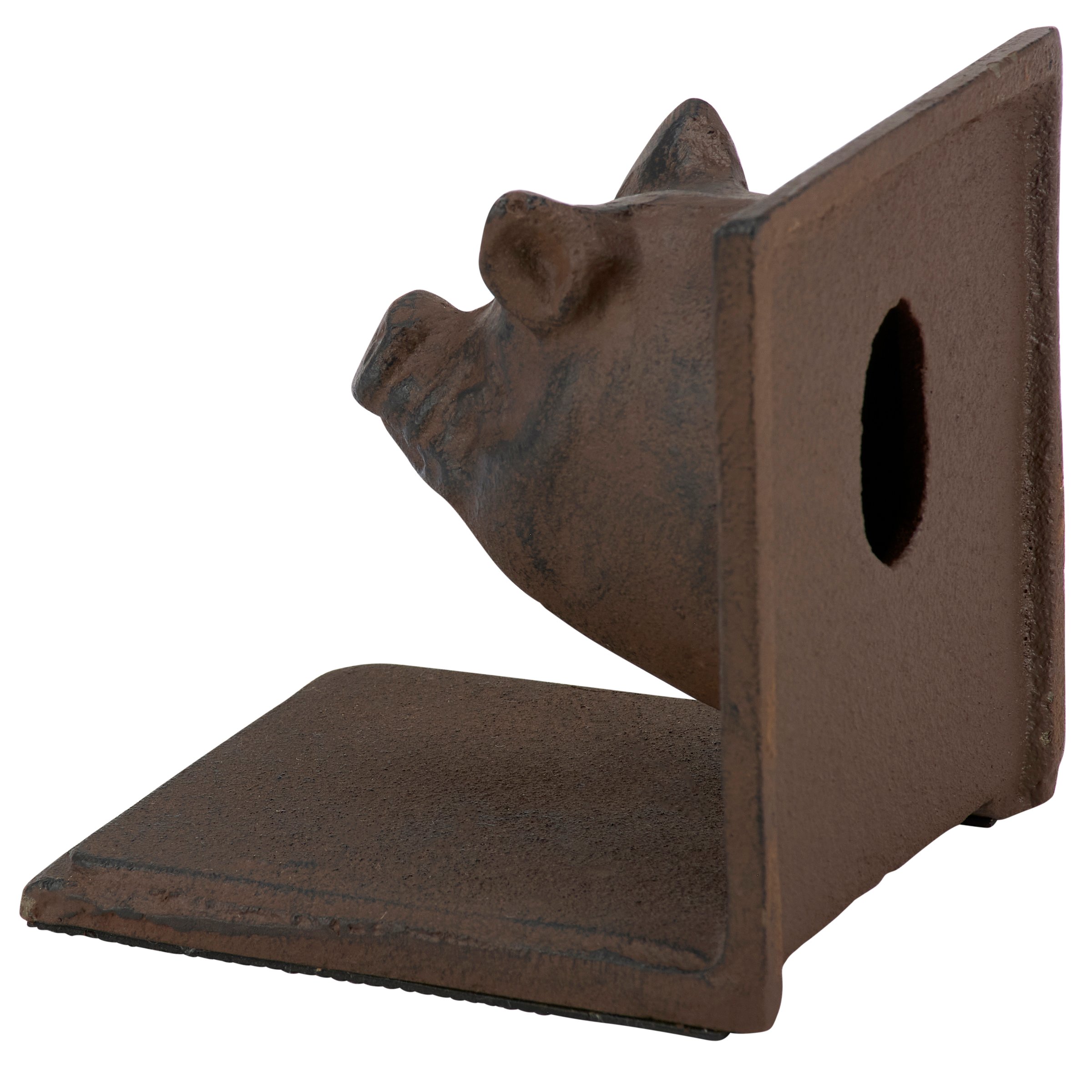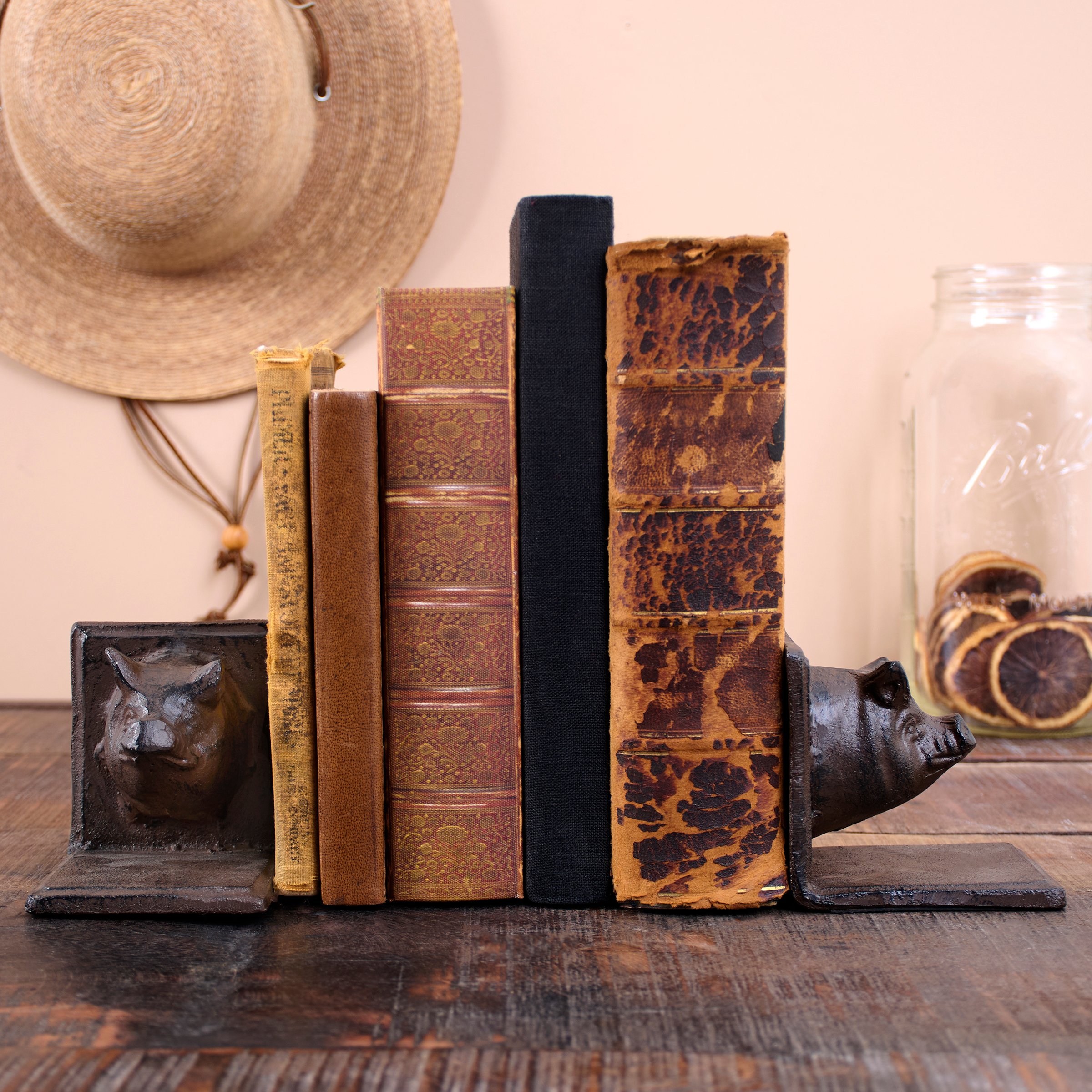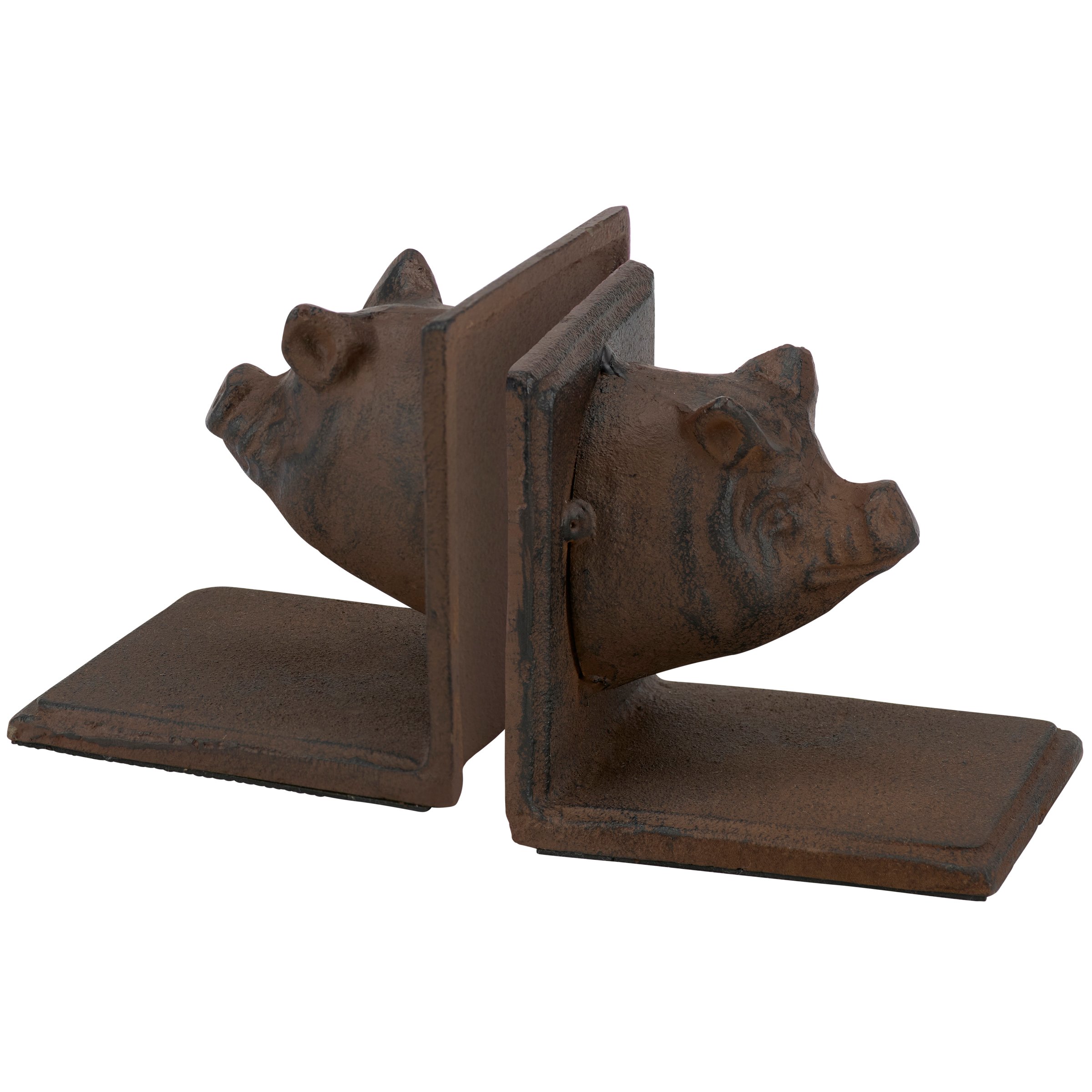 A set of coordinating metal bookends from our Farmhouse Collection displaying a rustic design inspired by farmhouse home decor. Each bookend features sculpted pig head designs with antique finish and a sturdy base. Our Pig bookends are packaged together with tied white cotton tape making it great for gifting. A set of rustic home accents perfect for adding farmhouse style to any bookshelf.