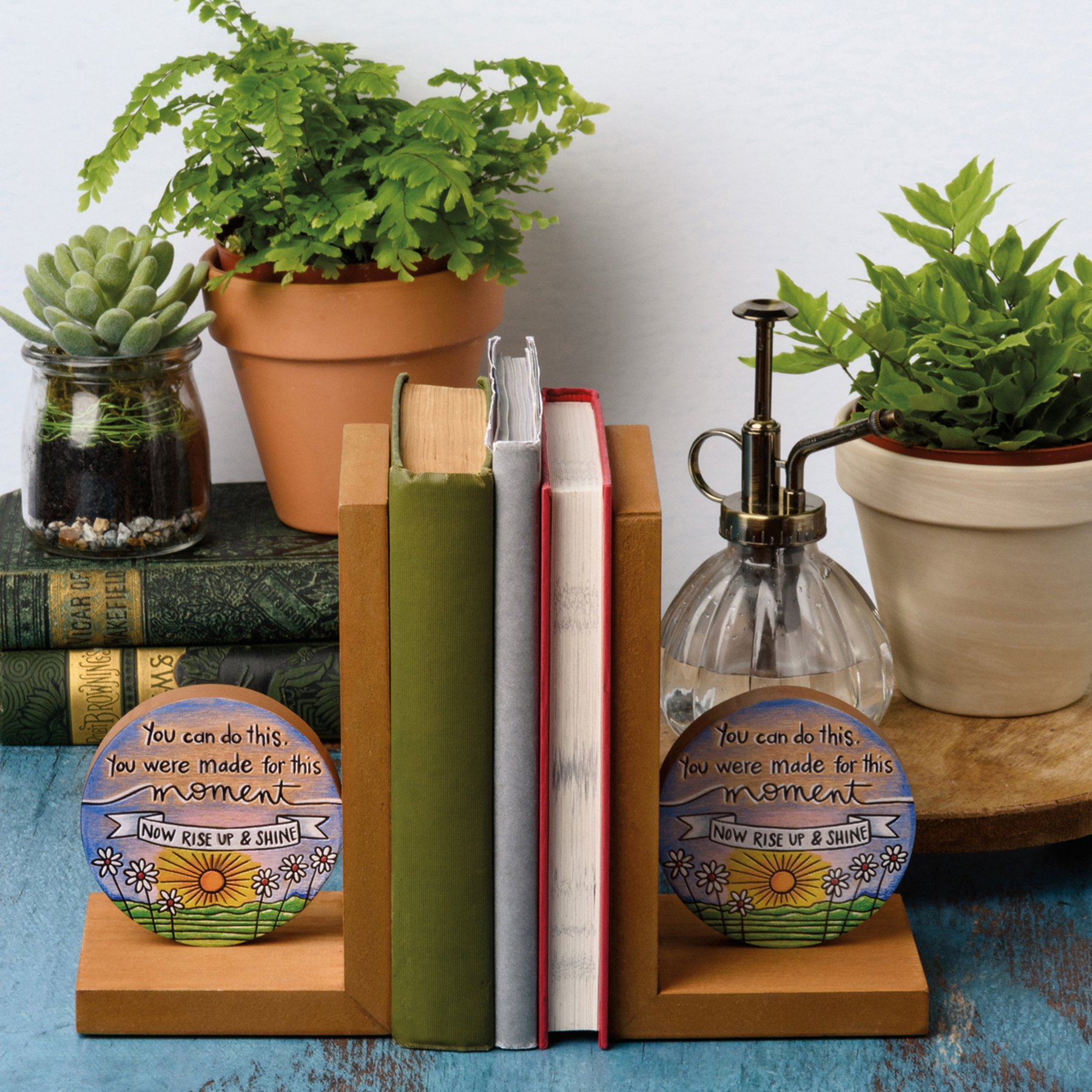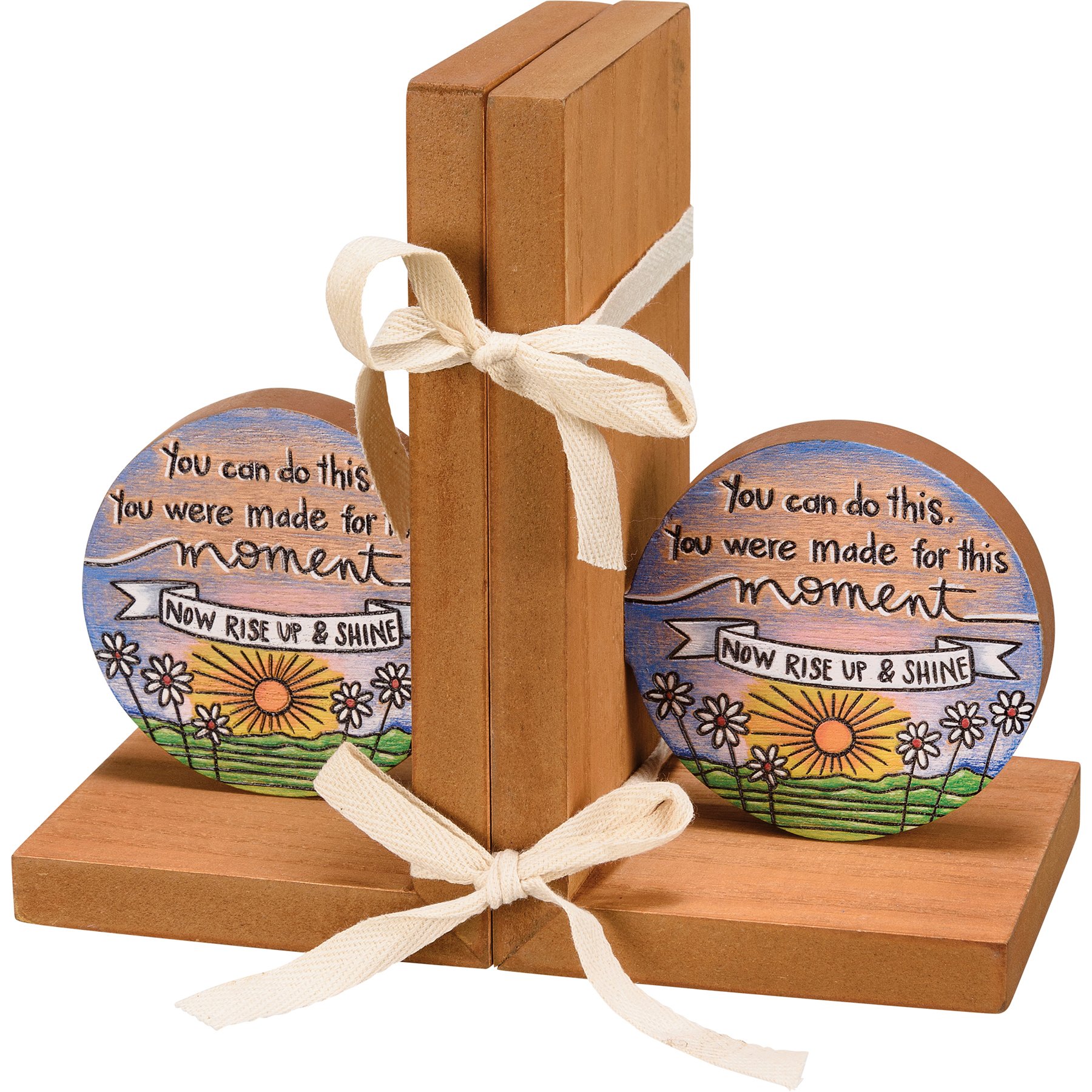 Add personality and character to any bookshelf or desk with these bookends featuring "You Can Do This You Were Made For This Moment Now Rise Up & Shine" sentiment with colorful wood burned designs. Our You Were Made For This Moment book ends contain bottom rubber feet to hold in place on any surface.