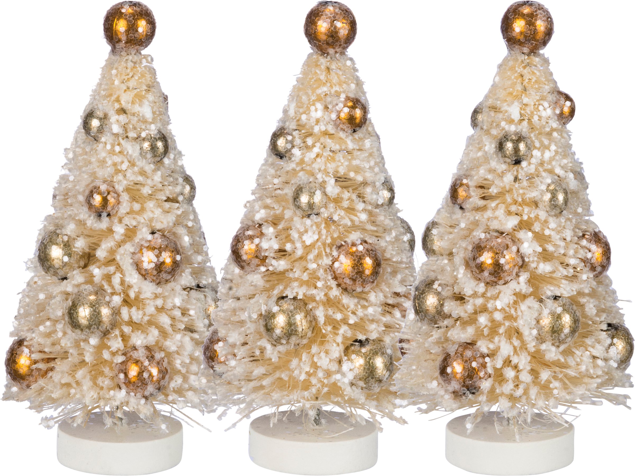 A set of three standing Christmas tree decorations, lending bulb ornaments with glittered bristles. Contains circular bottom post to stand alone.