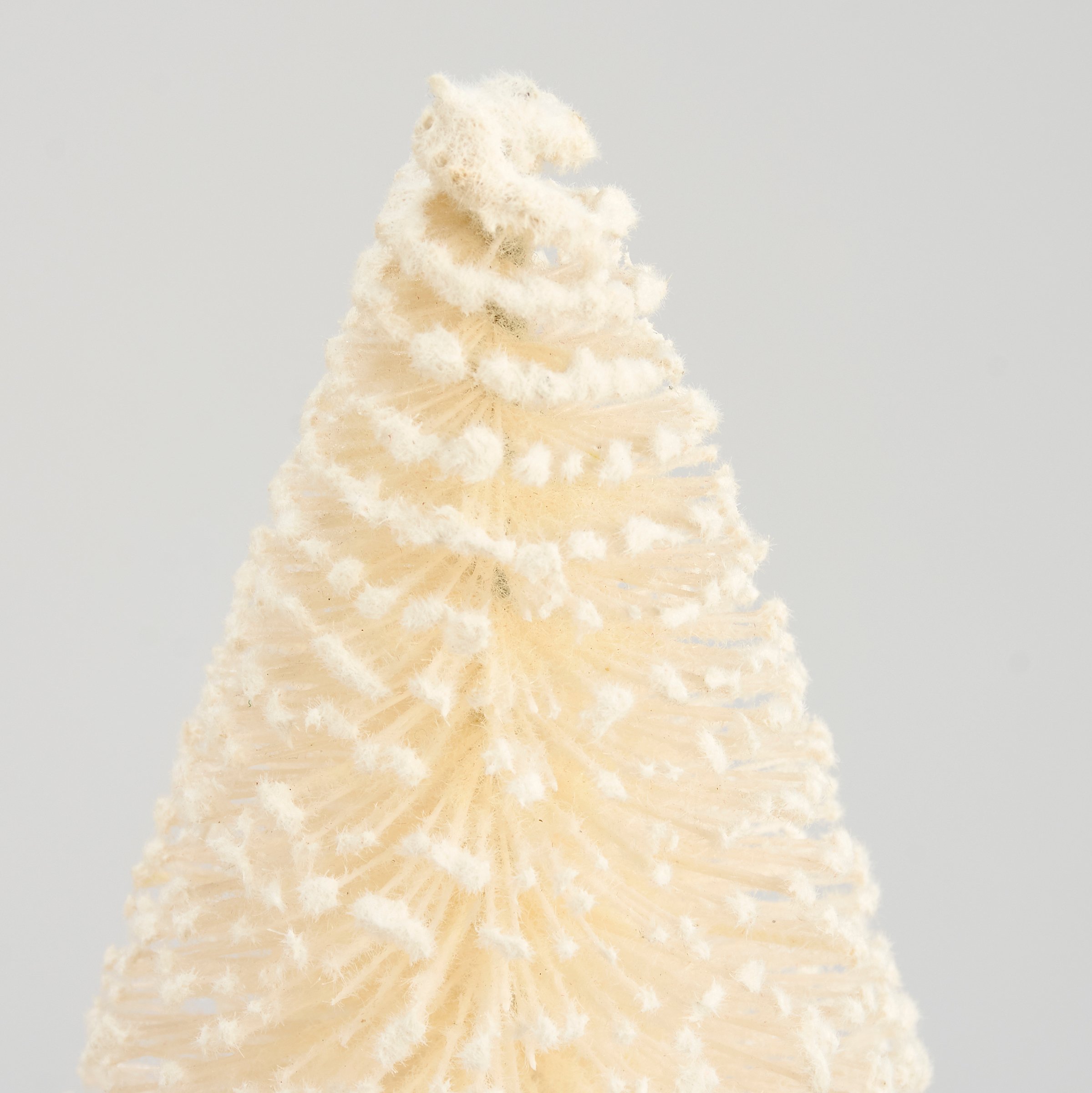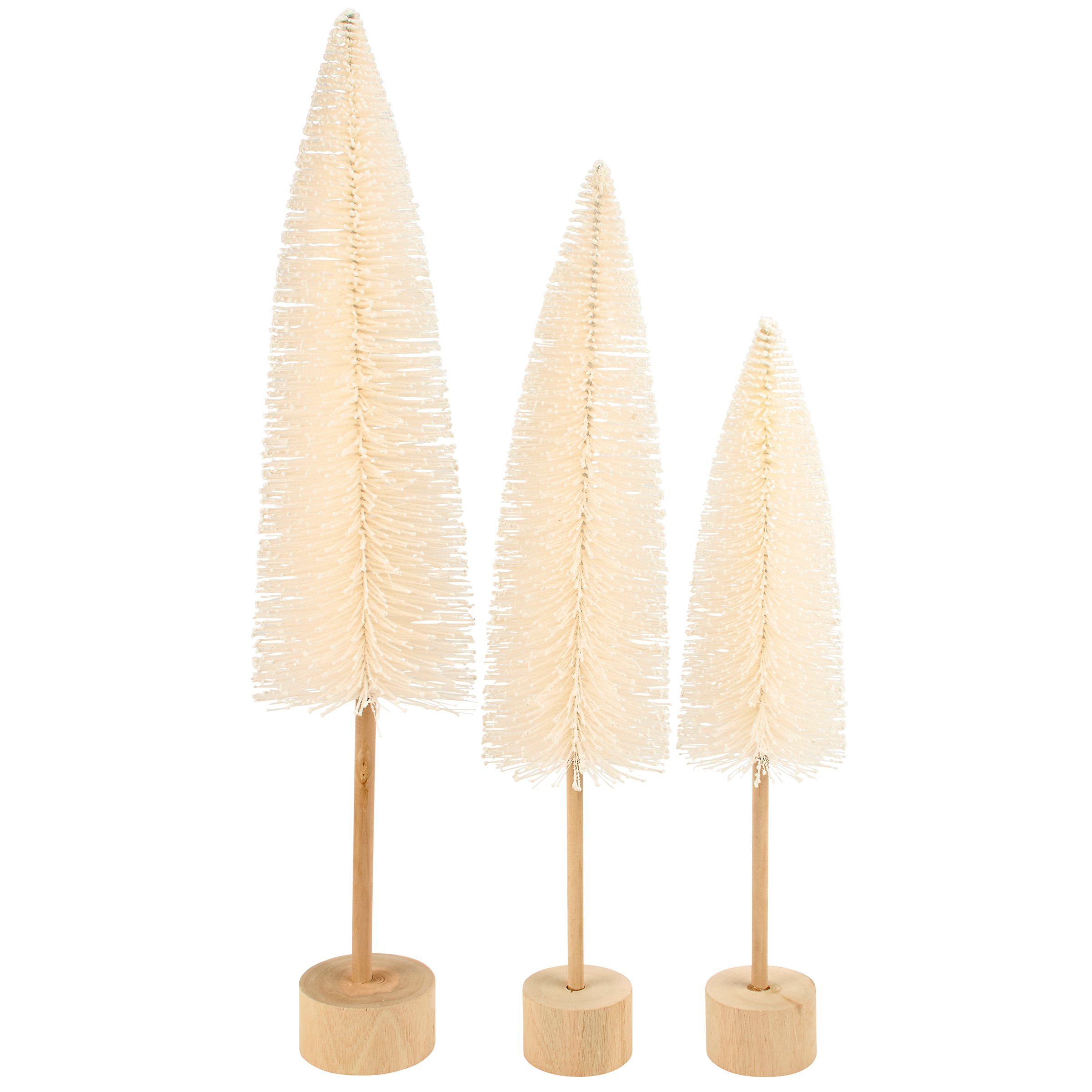 A set of 3 bottle brush trees in assorted sizes displaying a natural white color. Featured in our Christmas Collection, these neutral bottle brush tree colors coordinate well with a variety of seasonal décor. Our white bottle brush trees are attached to natural wood disc bases to free-stand on flat surface for display. A set of neutral seasonal home accents with a variety of display options.