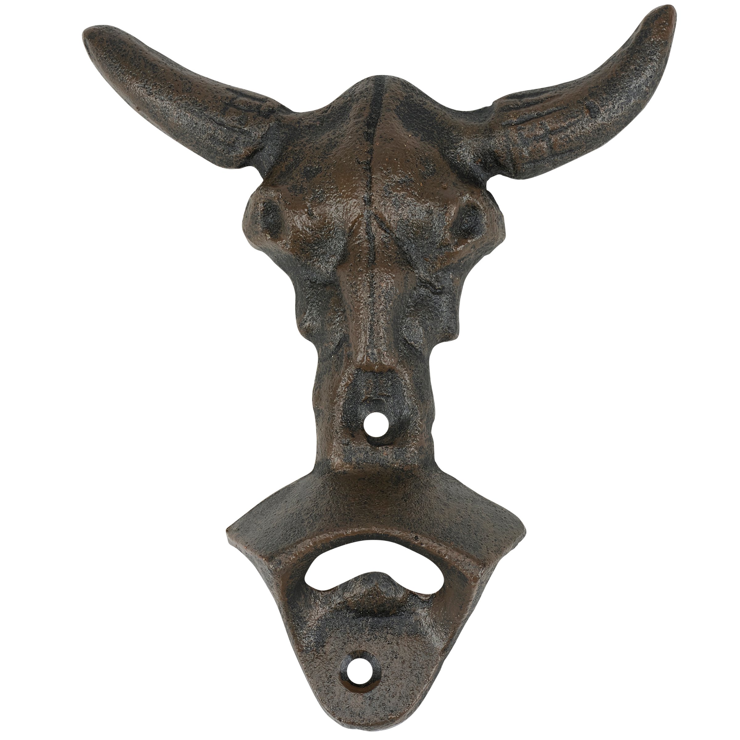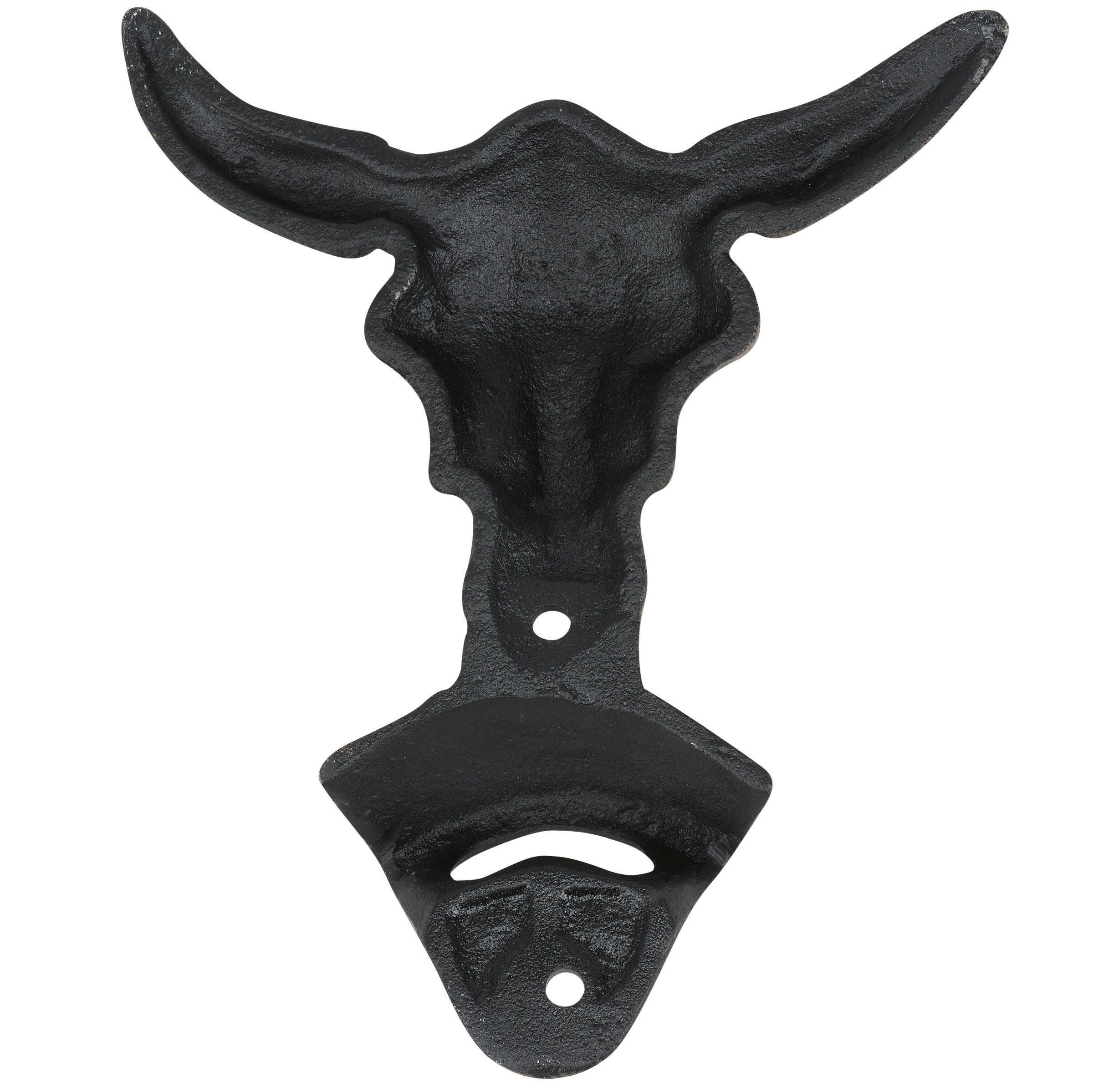 A metal bottle opener from our Western Collection displaying a rustic design inspired by western home décor. This sturdy metal bottle opener features a sculpted bull skull design with antique finish and space underneath to remove bottle caps. Our Bull Skull bottle opener is easy to hang for display and use via predrilled holes. A western home accent that adds functional style to any indoor or outdoor space.