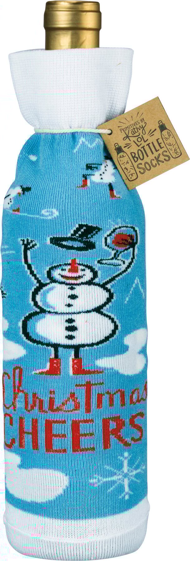A creative alternative for a traditional gift bag, a washable and re-useable "Christmas Cheers" knit bottle sock with drinking and playing snowmen designs.