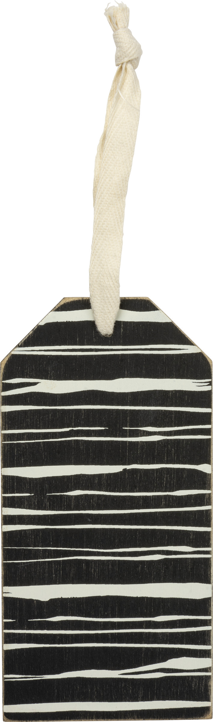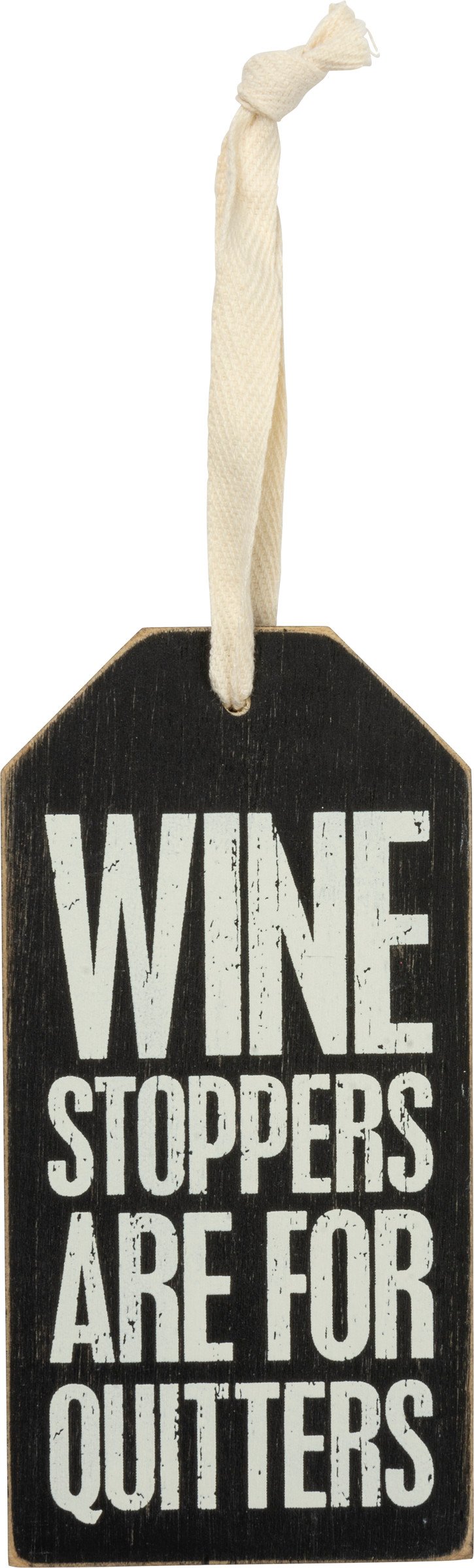 A classic black and white bottle tag featuring a distressed "Wine Stoppers Are For Quitters" sentiment, reverse stripe designs, and top fabric loop for attaching to a bottle of wine.