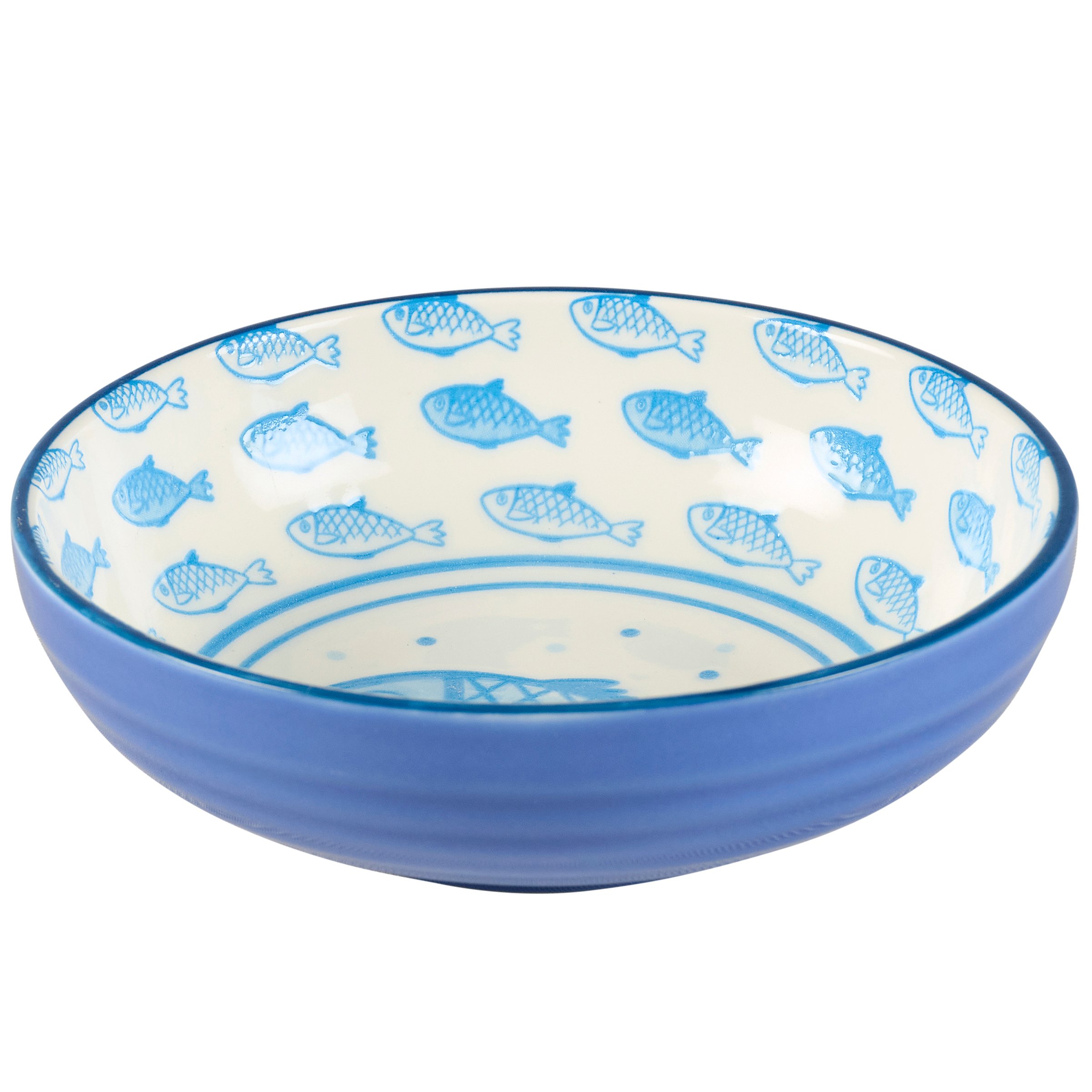 A durable stoneware bowl from our Beach Collection displaying an ocean blue glaze finish on the outside with hand illustrated fish designs on the inside and bottom of the bowl. Inside fish designs feature a pattern of swimming fish around a large fish design in the middle. Our Blue Fish bowl is conveniently microwave, oven, dishwasher, and food safe for easy use. A piece of fun dishware perfect for beach-themed tablescapes.