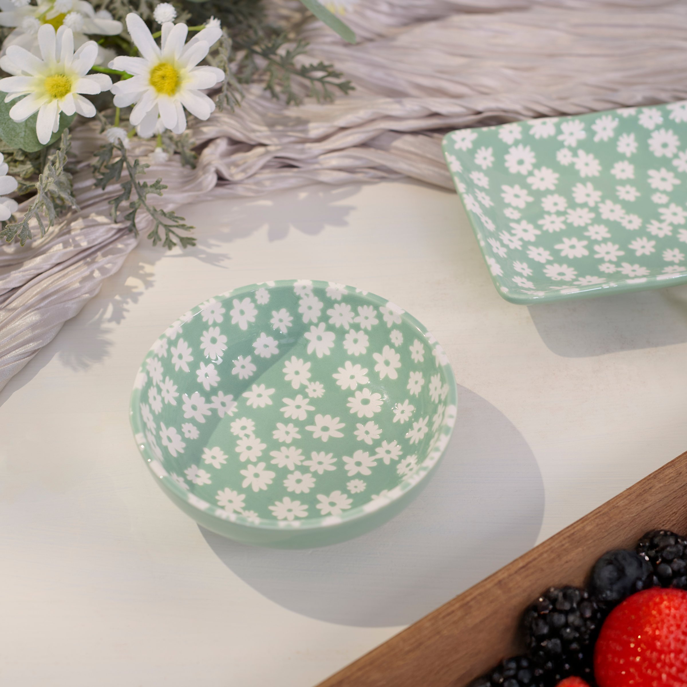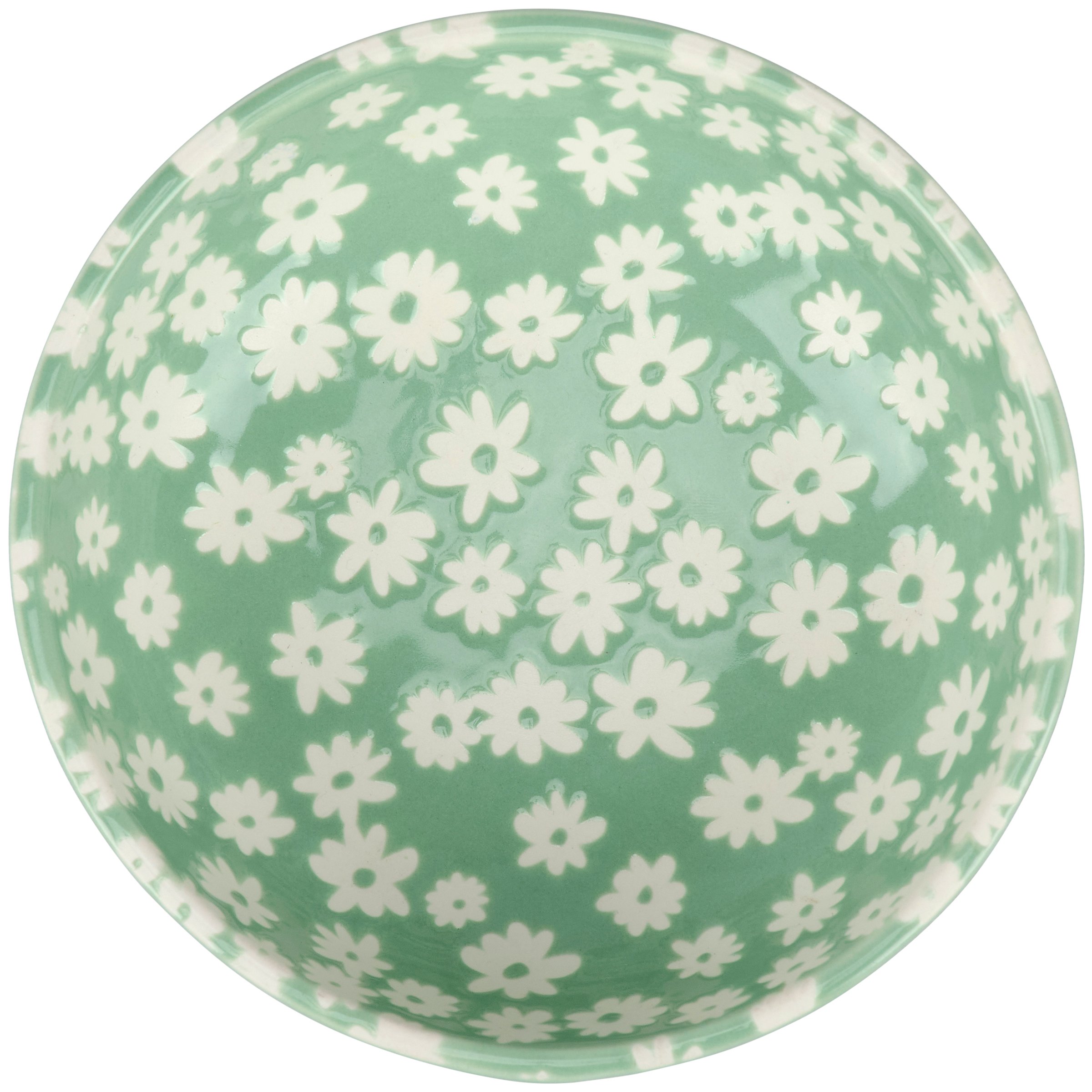 A durable stoneware bowl from our Garden Collection displaying a nature green glaze finish with a delightful daisy pattern debossed on the inside of the bowl. Our Daisy bowl is conveniently microwave, oven, dishwasher, and food safe for easy use. A piece of daisy themed dishware perfect for garden inspired tablescapes.