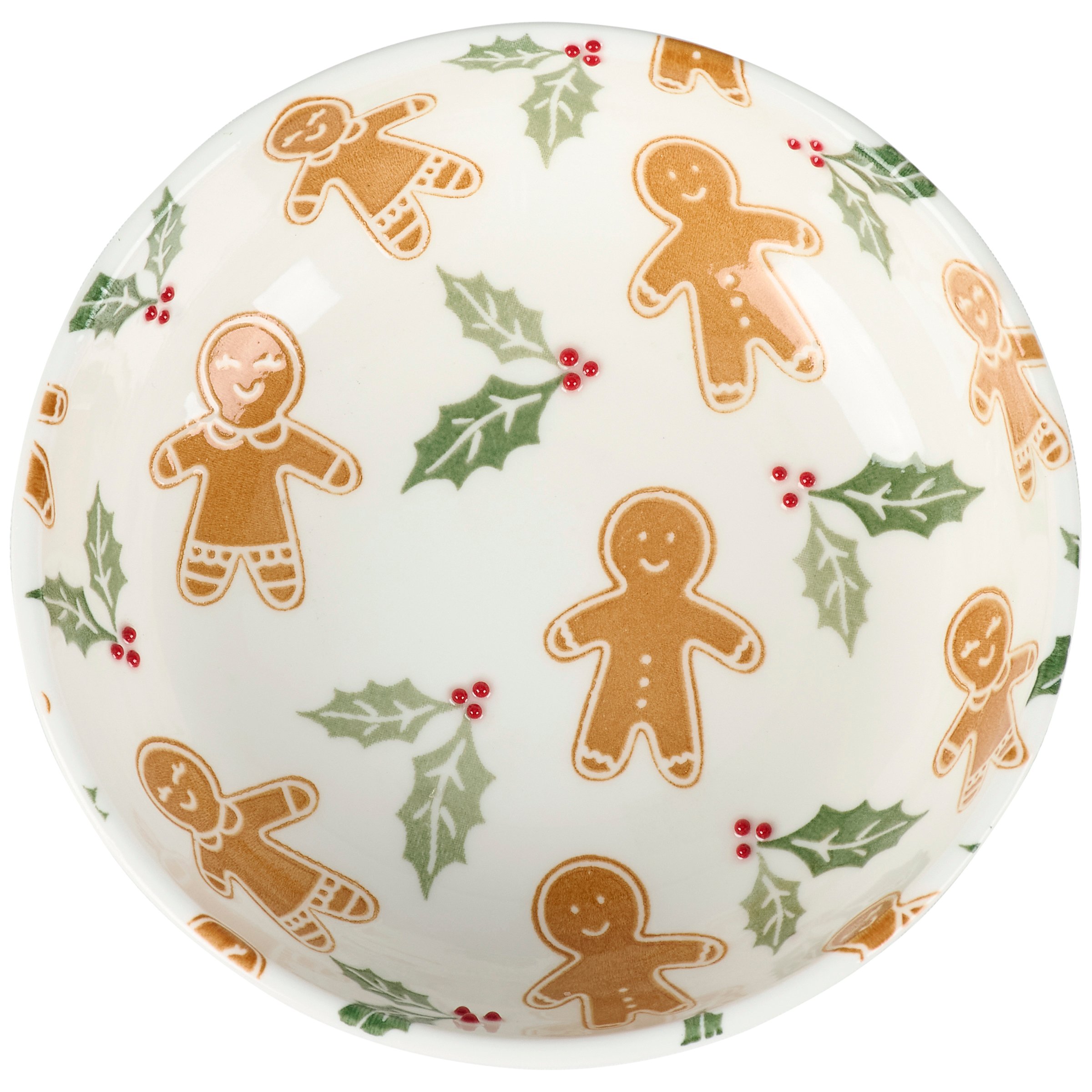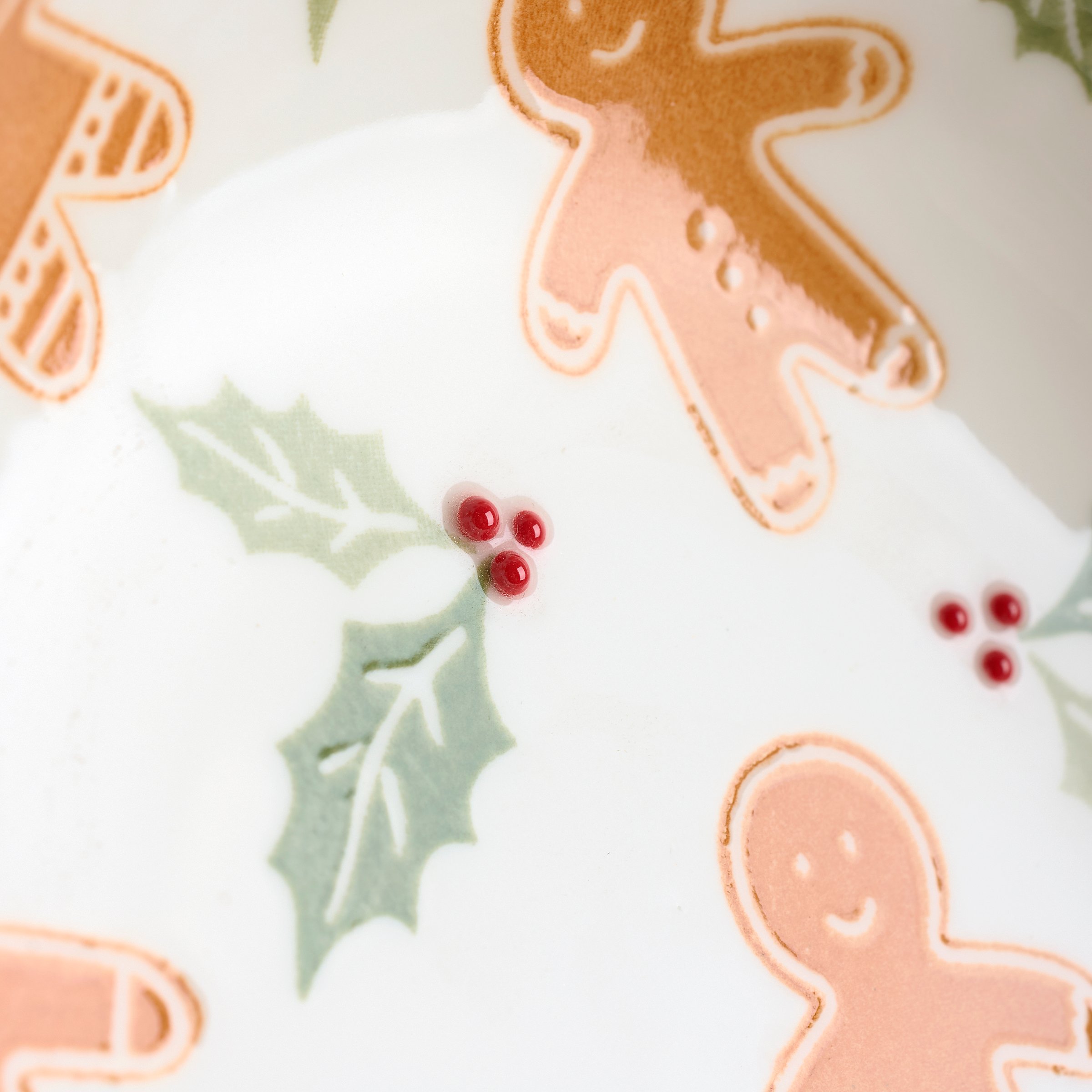 A durable ceramic bowl from our Gingerbread Collection featuring a ribbed texture on the outside with a gingerbread man and holly pattern on the inside of the bowl. Our Gingerbread Men bowl is conveniently microwave, oven, dishwasher, and food safe for easy use. A piece of seasonal dishware perfect for gingerbread themed tablescapes.