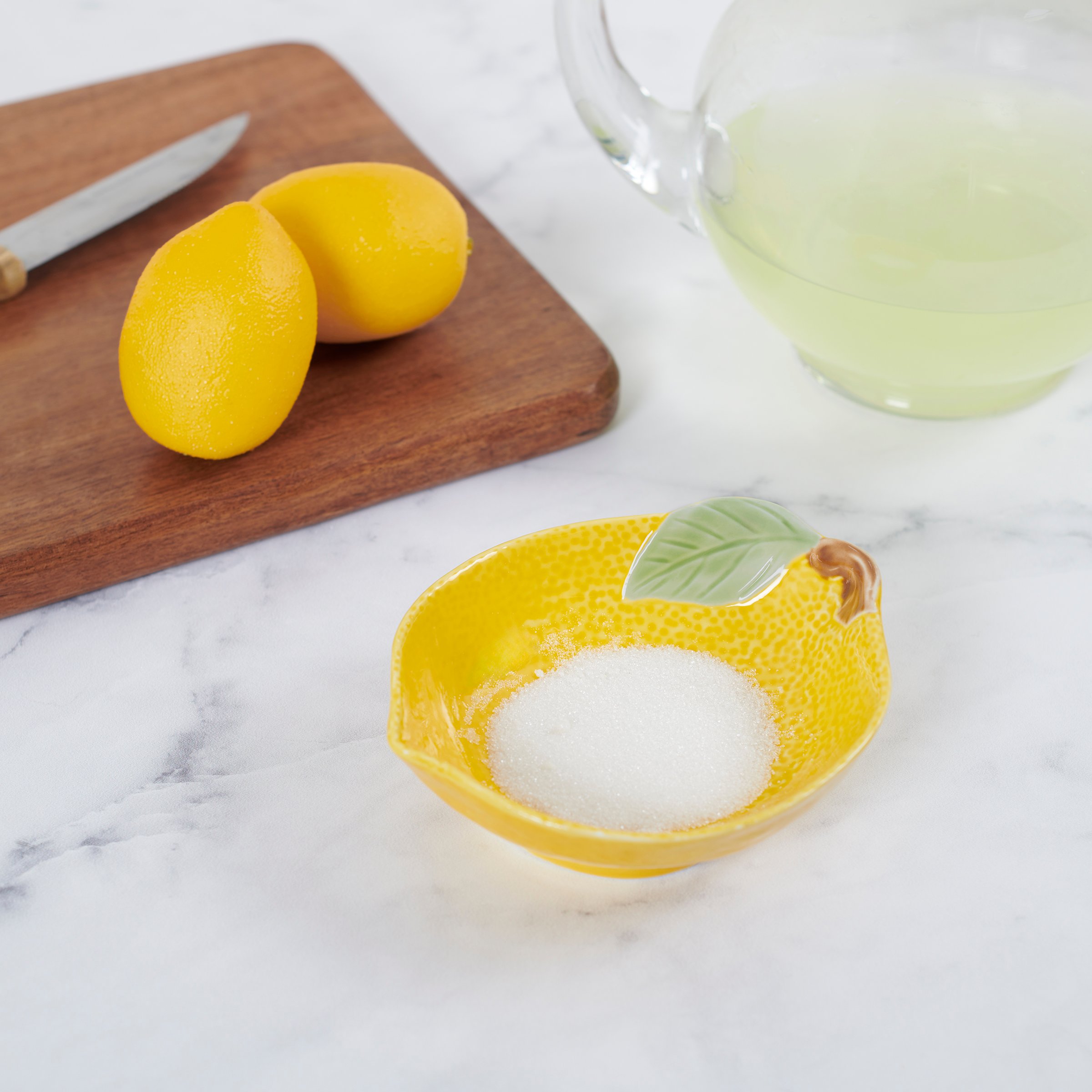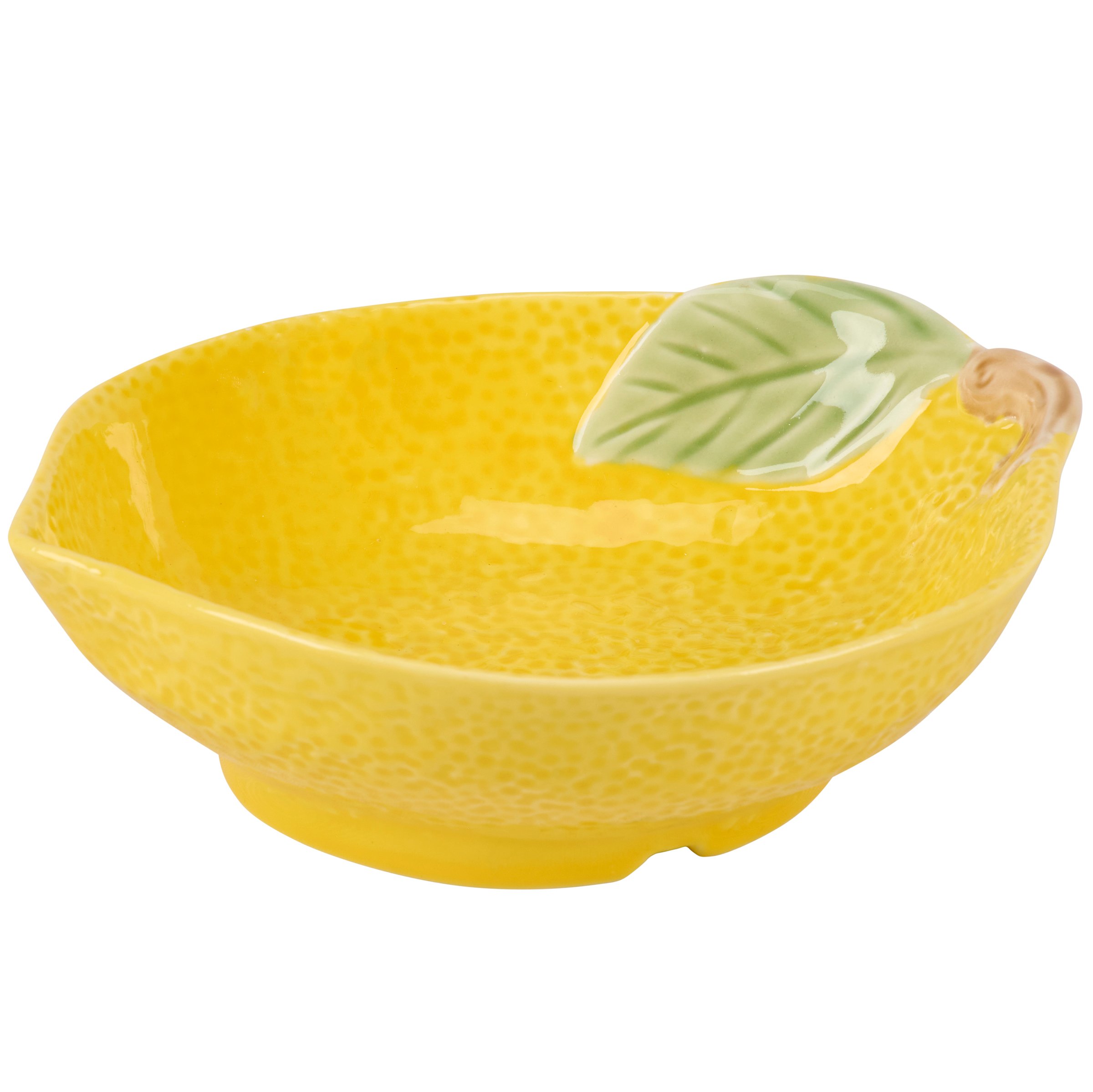 A durable stoneware bowl from our Garden Collection displaying a lemon inspired design with textured glaze finish and sculpted leaf details to resemble the features of a lemon. Our Lemon bowl is conveniently microwave, oven, dishwasher, and food safe for easy use. A piece of fun dishware perfect for lemon-themed tablescapes.