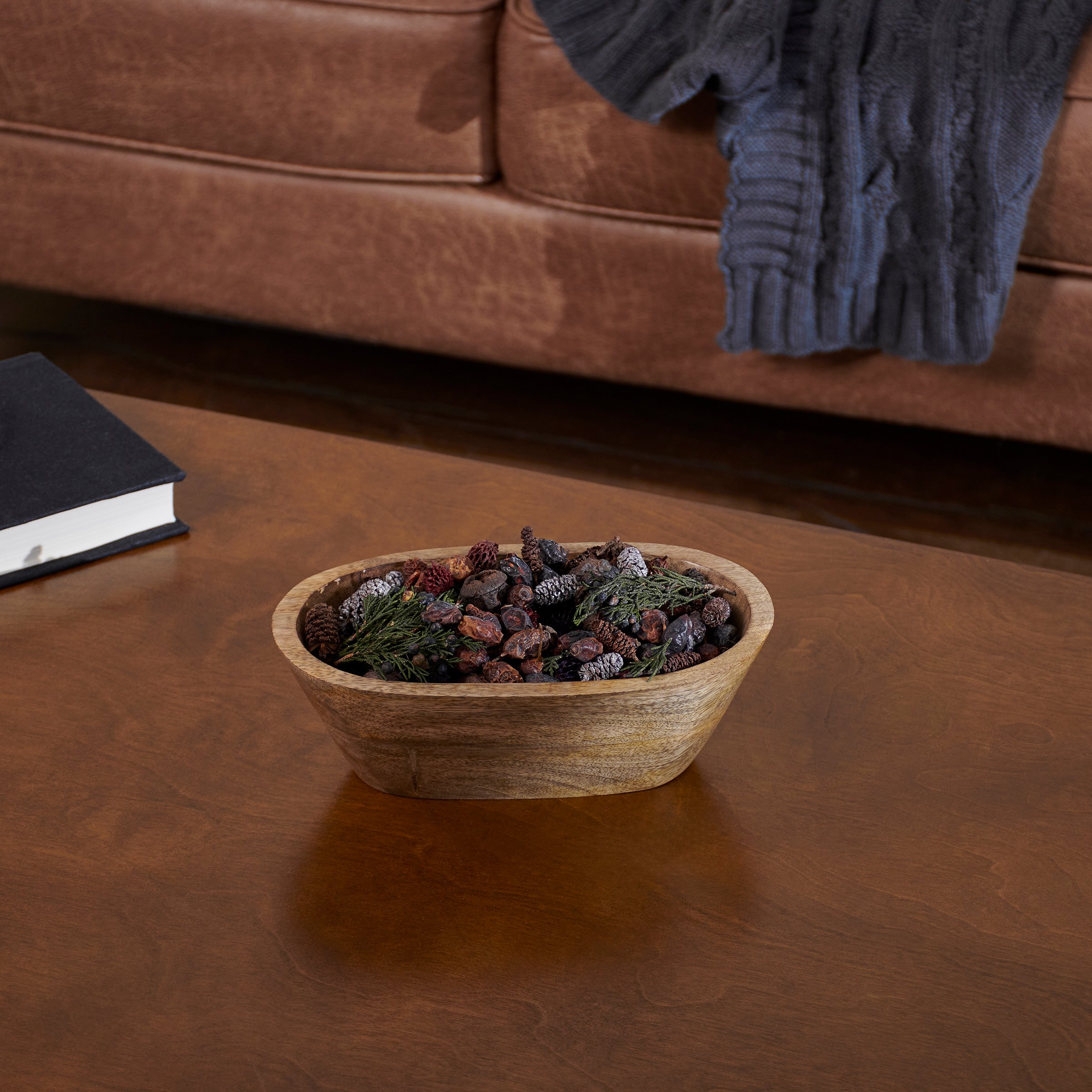 A durable wooden bowl from our Farmhouse Collection displaying an oval shape in a natural wood style. Our oval wooden bowl coordinates well with a rustic theme and is food safe so it can be used as tableware or with home décor displays. Wipe clean with damp cloth.