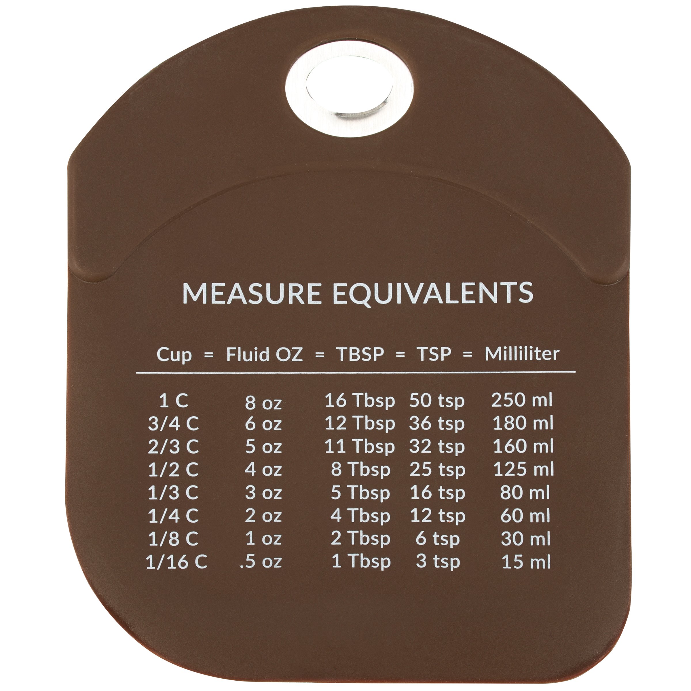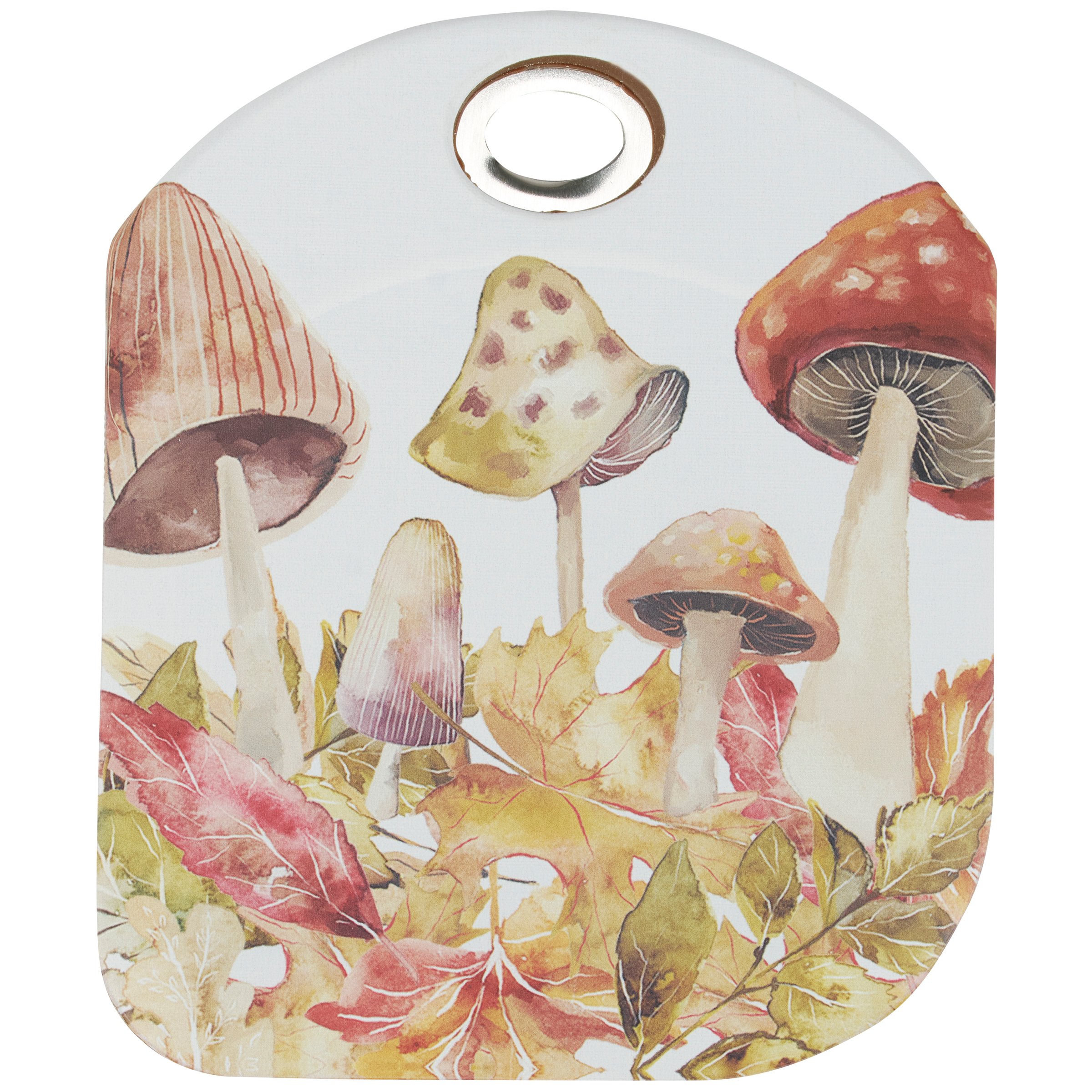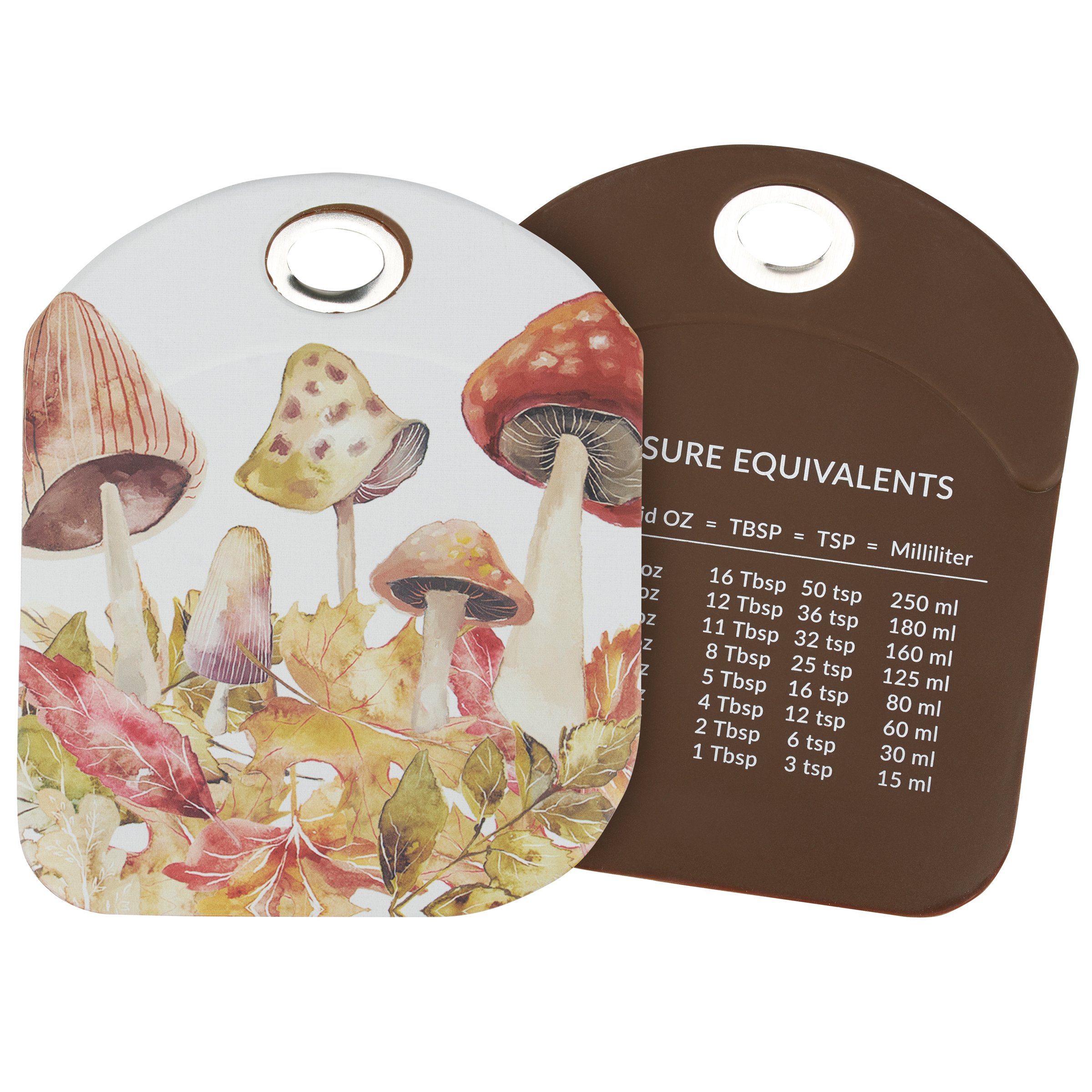 A double-sided silicone bowl scraper from our Fall & Harvest Collection displaying a fall scene of autumn leaves and mushrooms. Autumn leaves design is replicated from original art hand painted in a unique watercolor style. Our Harvest Leaves bowl scraper features a sturdy stainless steel handle and convenient measurement equivalents on the back for easier baking. Silicone bowl scraper is hand wash only. A seasonal kitchen accessory great for fall gifting.