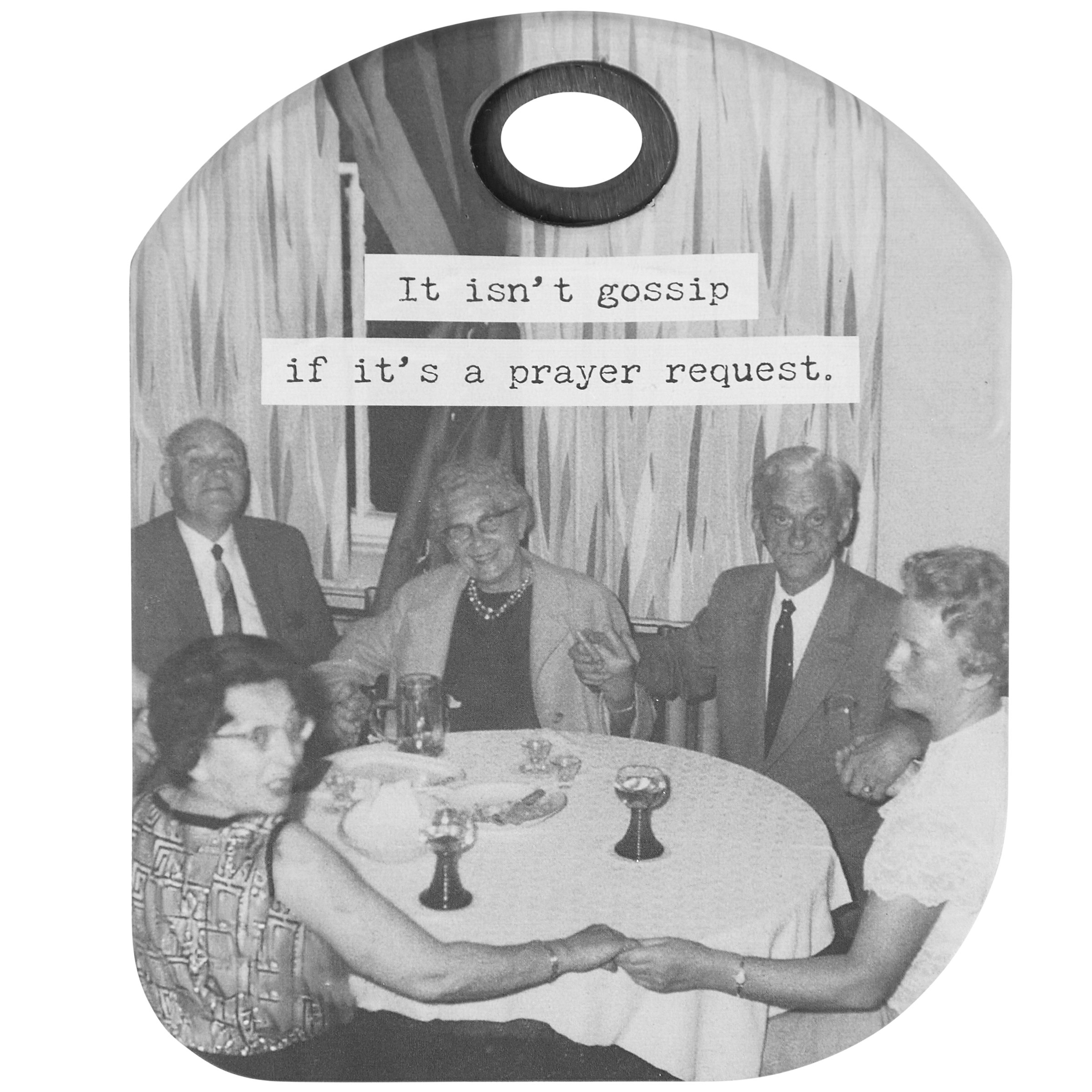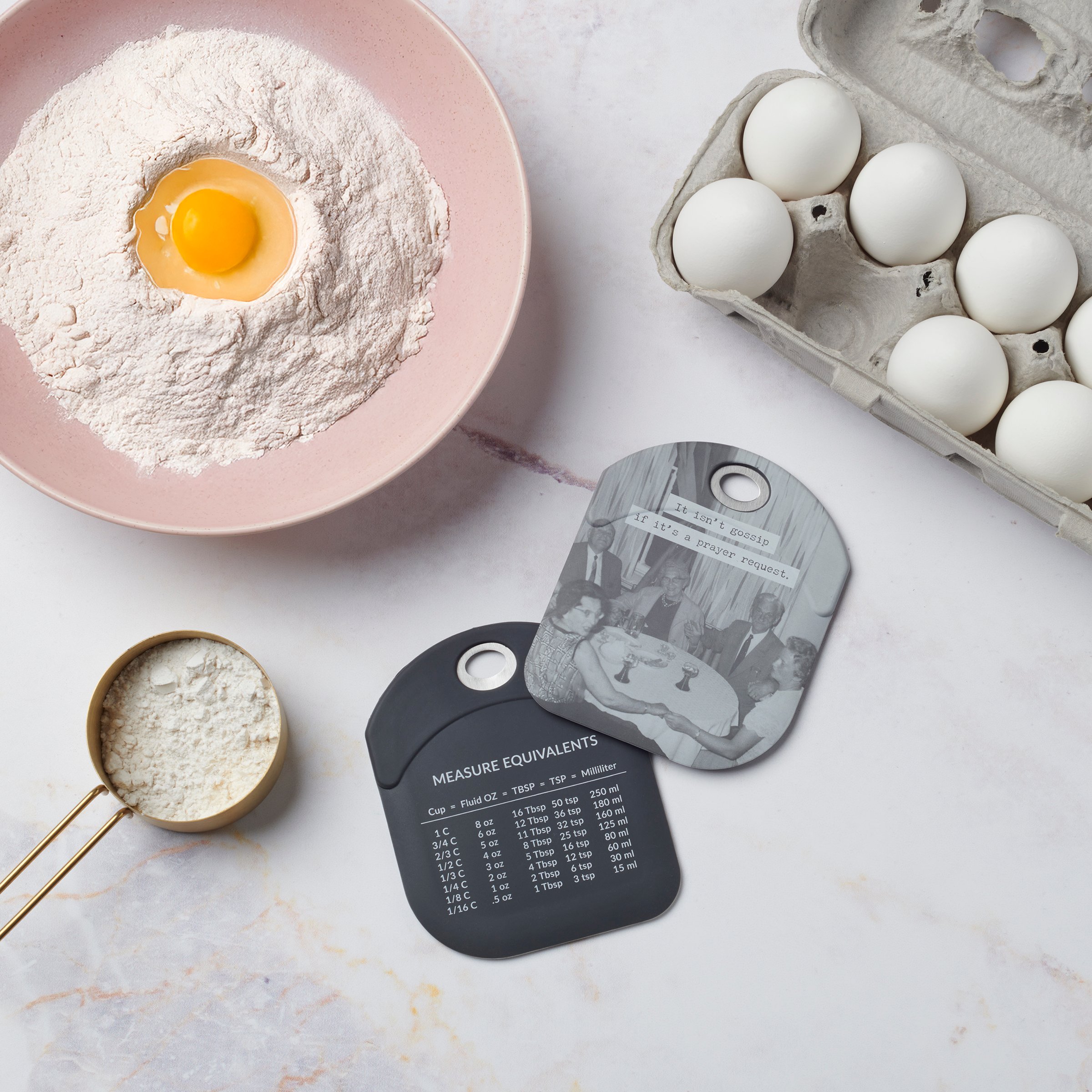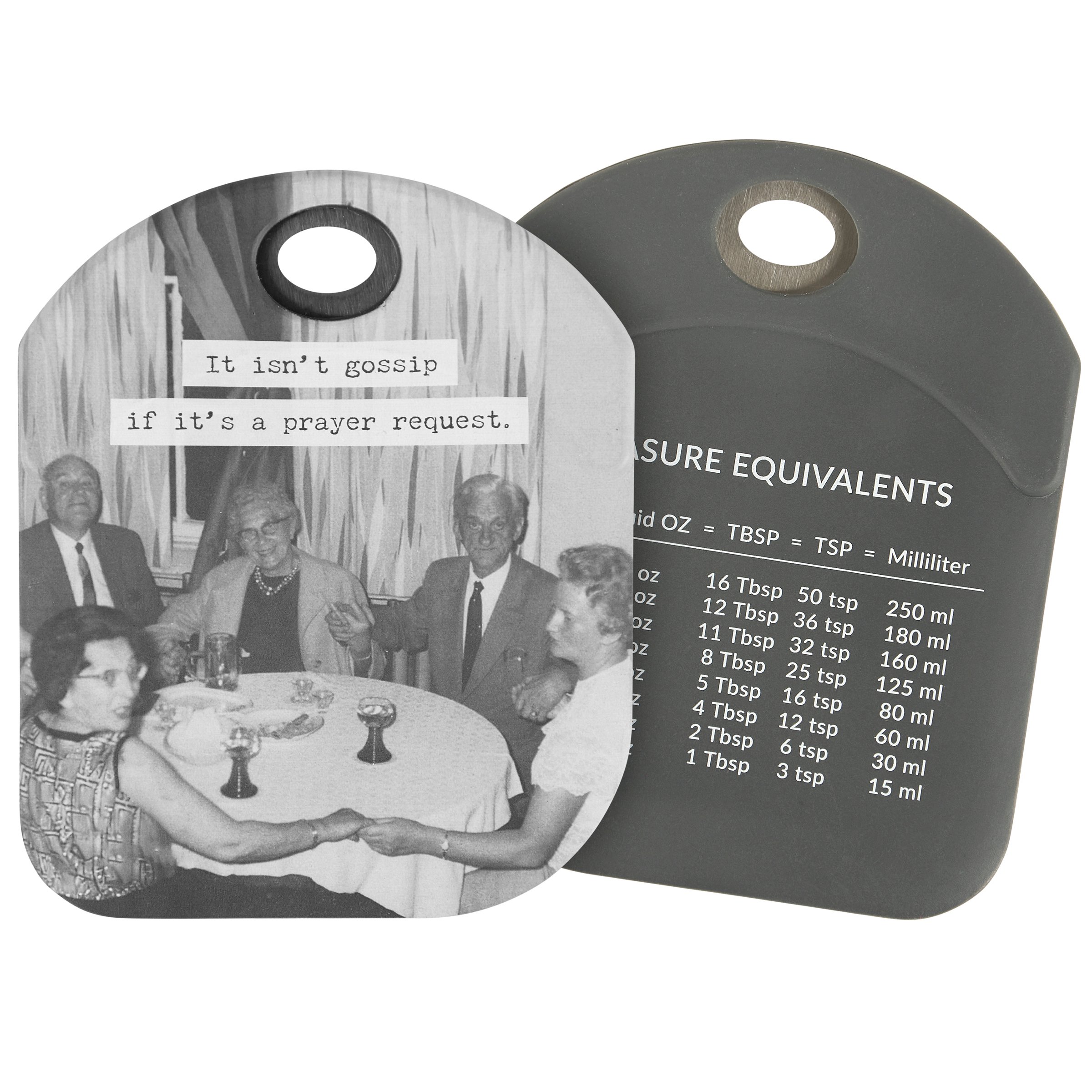 A double-sided silicone bowl scraper from our Trash Talk By Annie Collection displaying a vintage black and white photograph complemented with a humorous sentiment that reads "It Isn't Gossip If It's A Prayer Request." Our It Isn't Gossip bowl scraper features a sturdy stainless steel handle and convenient measurement equivalents on the back for easier baking. Silicone bowl scraper is hand wash only. A fun retro style kitchen accessory great for gifting.