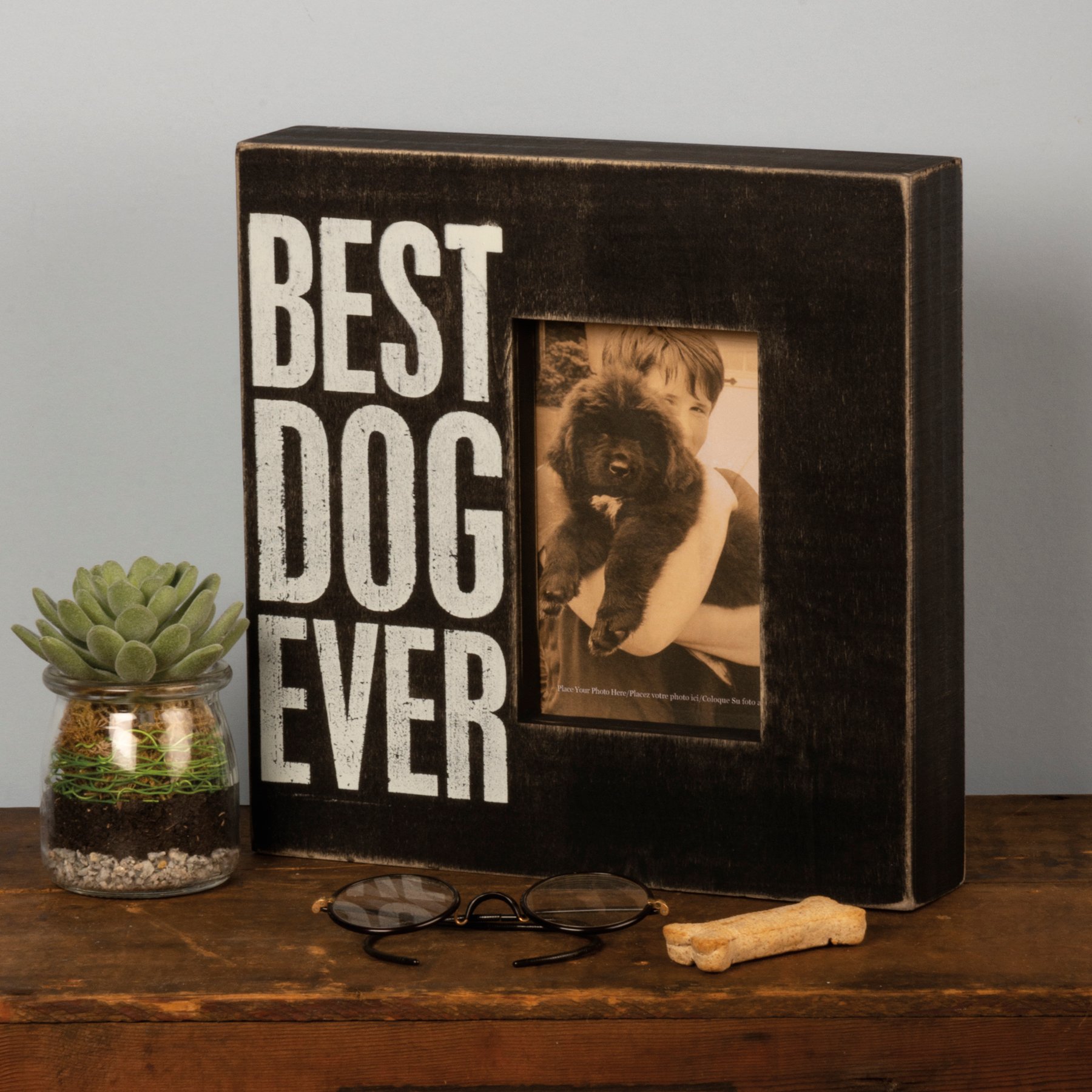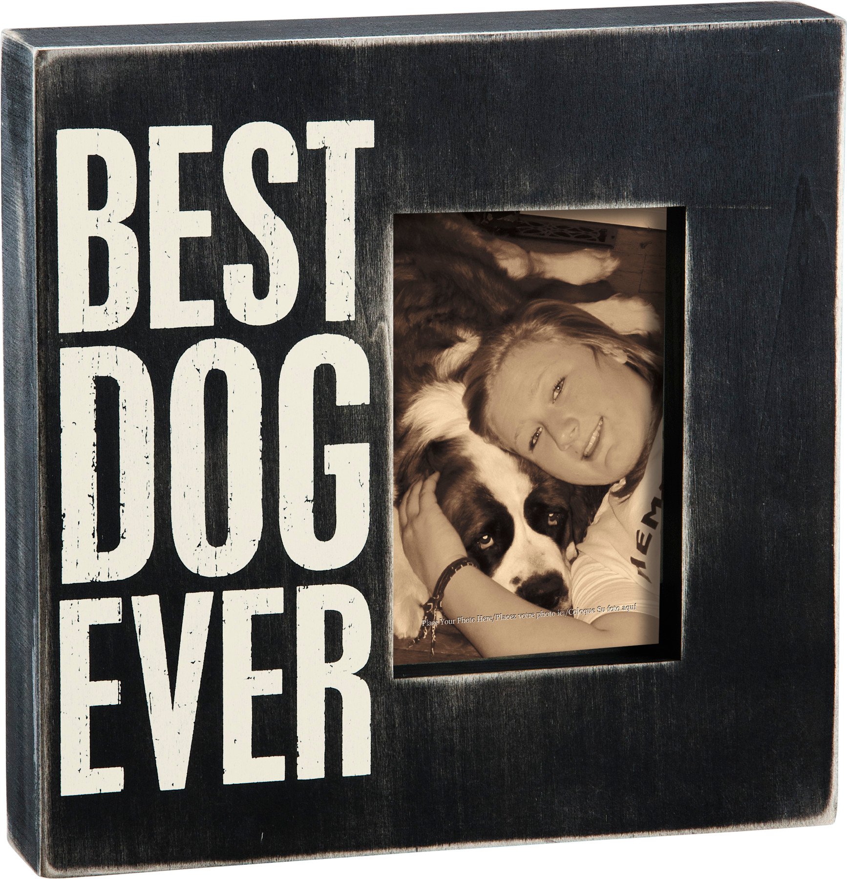 A picture frame from our best-selling Pet Collection in a classic black and white box sign style displaying a heartwarming pet inspired sentiment that reads "Best Dog Ever." Box frame features distressed details with coordinating black color on the sides and back. Photo frame fits a 4 inch x 6 inch photo and can easily be replaced via clips on back. Our Best Dog Ever box frame is easy to hang for display or can free-stand alone on a flat surface. A rustic pet-themed gift perfect for displaying favorite memories as everyday home décor.
