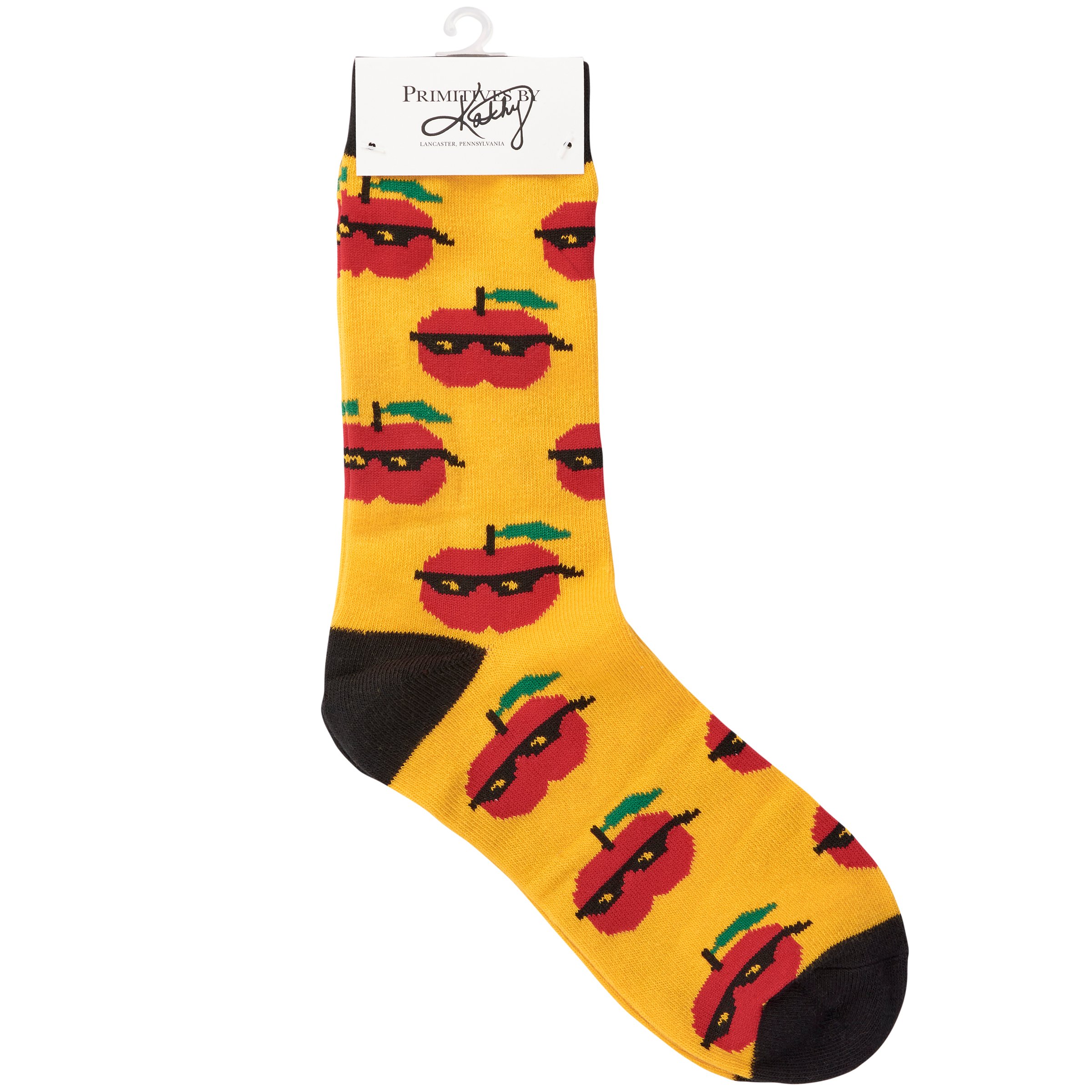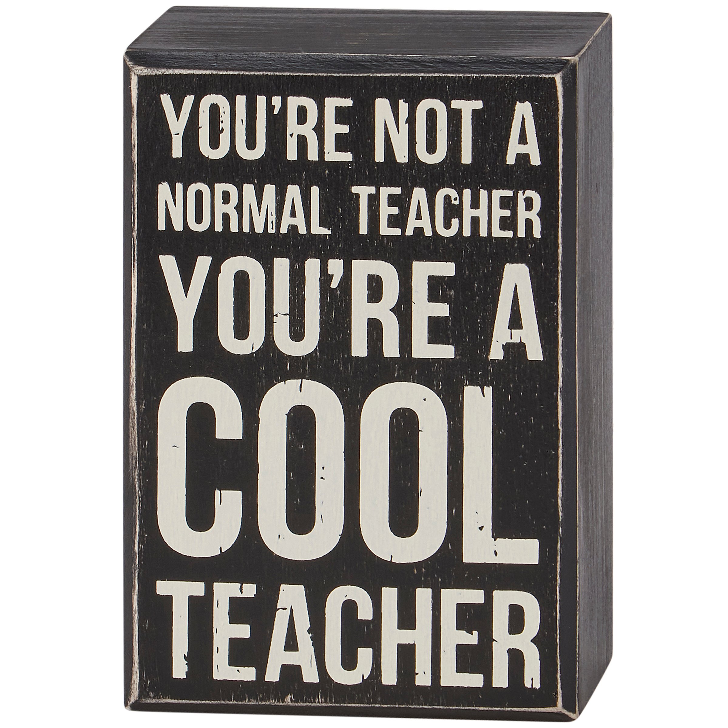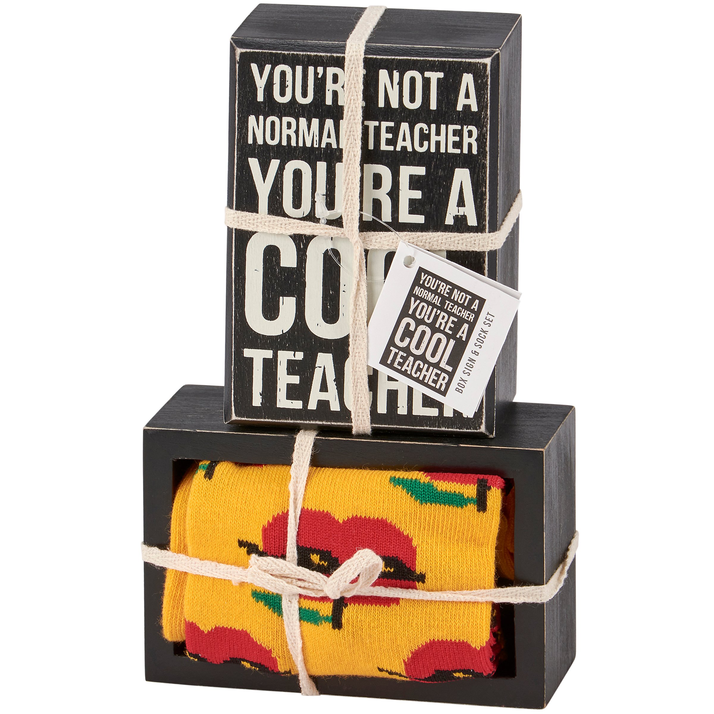 A fun giftable set from our Teacher Collection including a box sign and a colorful pair of socks. Box sign displays a classic black and white box sign design with a fun teacher inspired sentiment that reads "You're Not A Normal Teacher - You're A Cool Teacher." Teacher box sign features distressed details and is easy to hang or can free-stand alone. Colorfully printed socks display a fun pattern of apples wearing sunglasses made with machine-washable cotton, nylon, and spandex material for a one size fits most design. Teacher socks are neatly rolled inside box sign, secured with tied cotton tape ribbon, and include a hang tag displaying full sock design. Our Cool Teacher box sign & sock set is a fun teacher gift perfect for everyday expression in the classroom.