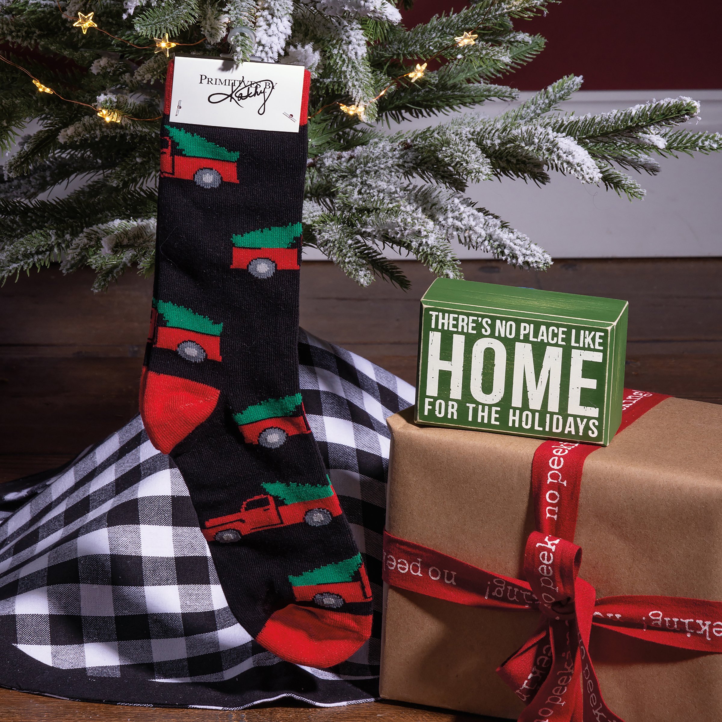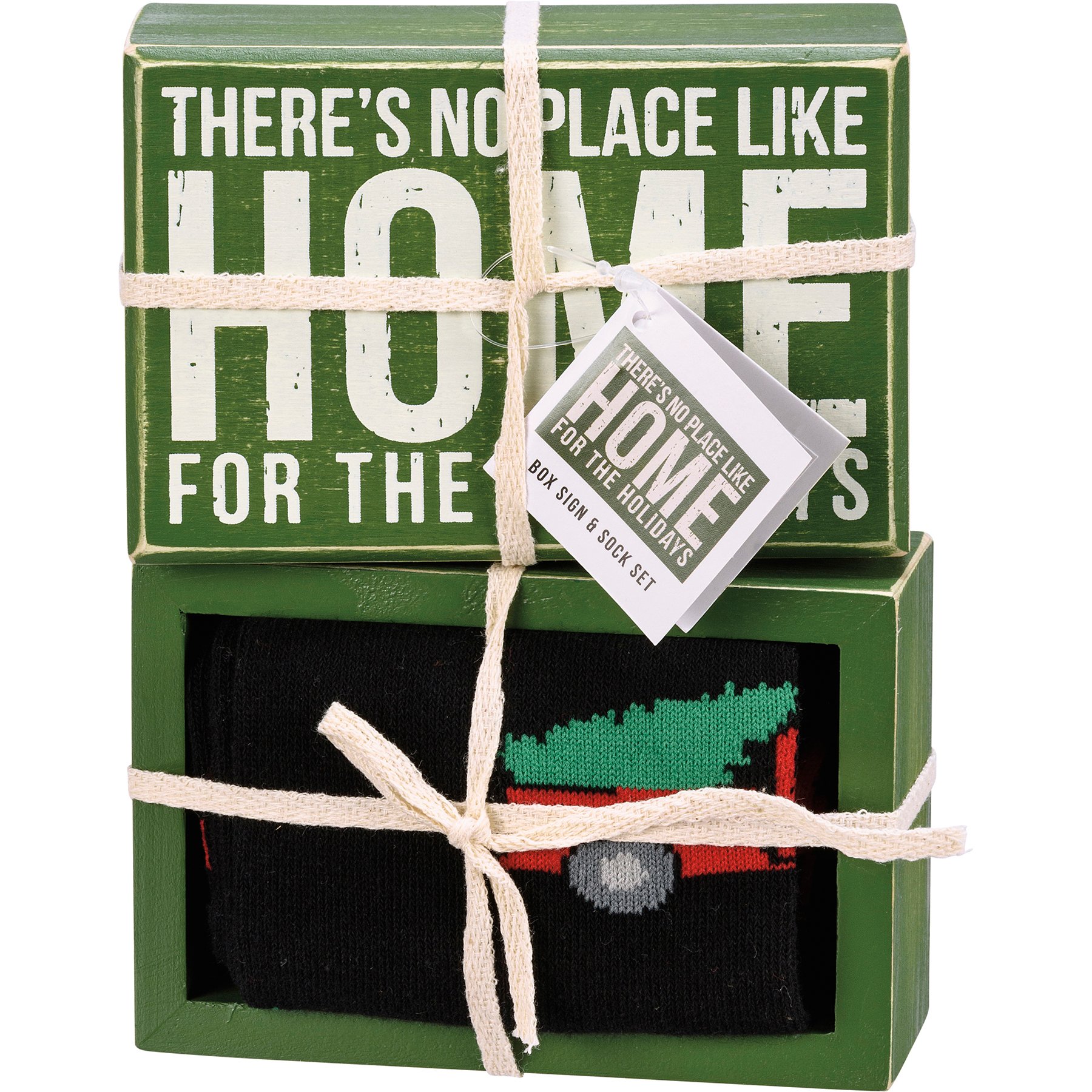 A perfectly giftable set including a box sign with "There's No Place Like Home For The Holidays" sentiment and a pair of socks featuring coordinating designs. Socks are cotton, nylon, and spandex and are machine-washable. One size fits most. Box sign is easy to hang or can free-stand alone. Socks come neatly rolled inside box sign and secured with tied cotton tape ribbon.