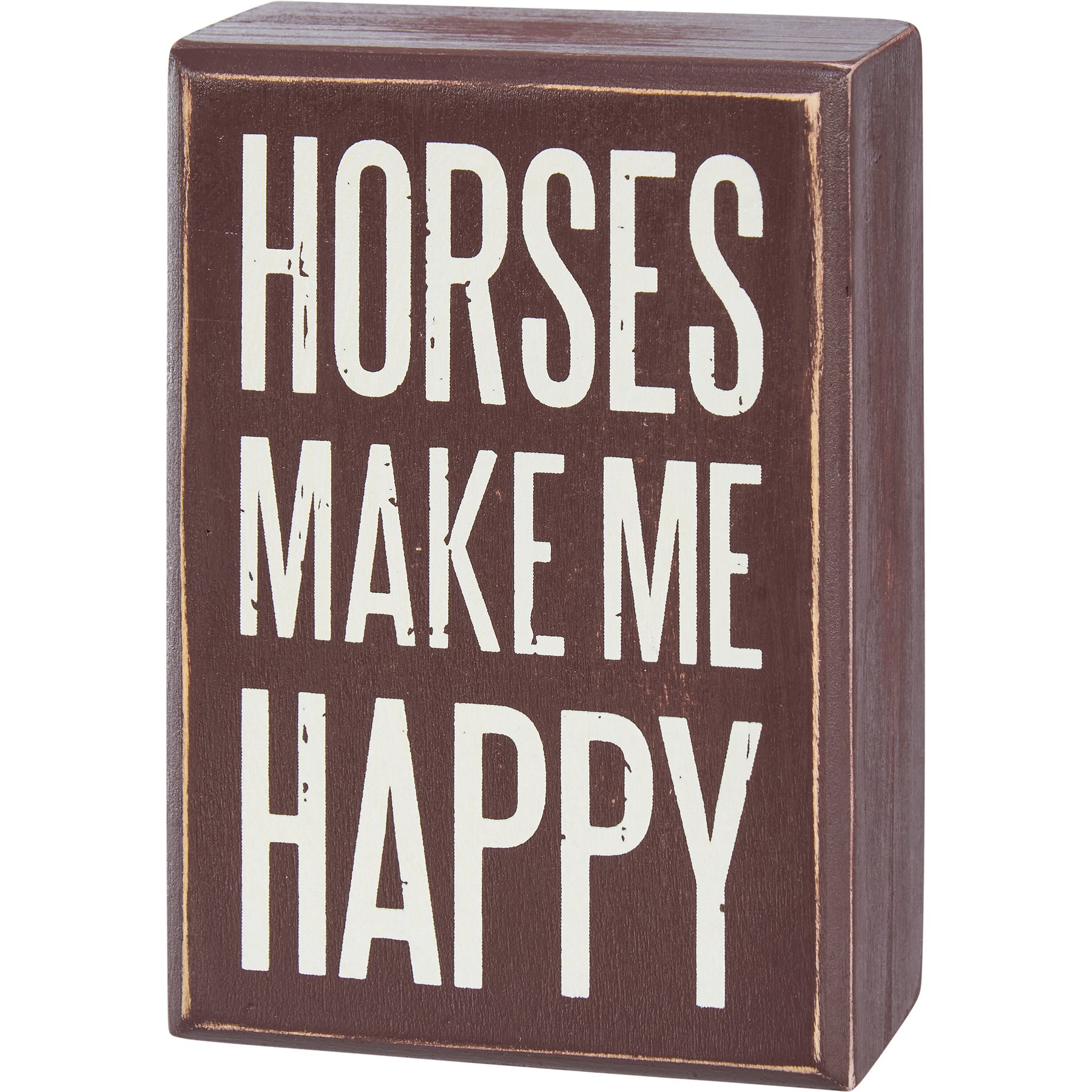 A perfectly giftable set from our Box Signs Collection including a box sign and a colorful pair of socks. Box sign displays a brown color with a "Horses Make Me Happy" sentiment in a classic box sign style. Design features distressed details and brown color on sides and back. Colorfully printed socks display coordinating horse designs on blue background and feature machine-washable cotton, nylon, and spandex material. One size fits most. Our Horses Make Me Happy box sign & sock set is easy to hang or can free-stand alone. Socks come neatly rolled inside box sign, secured with tied cotton tape ribbon, and include hang tag displaying full design.