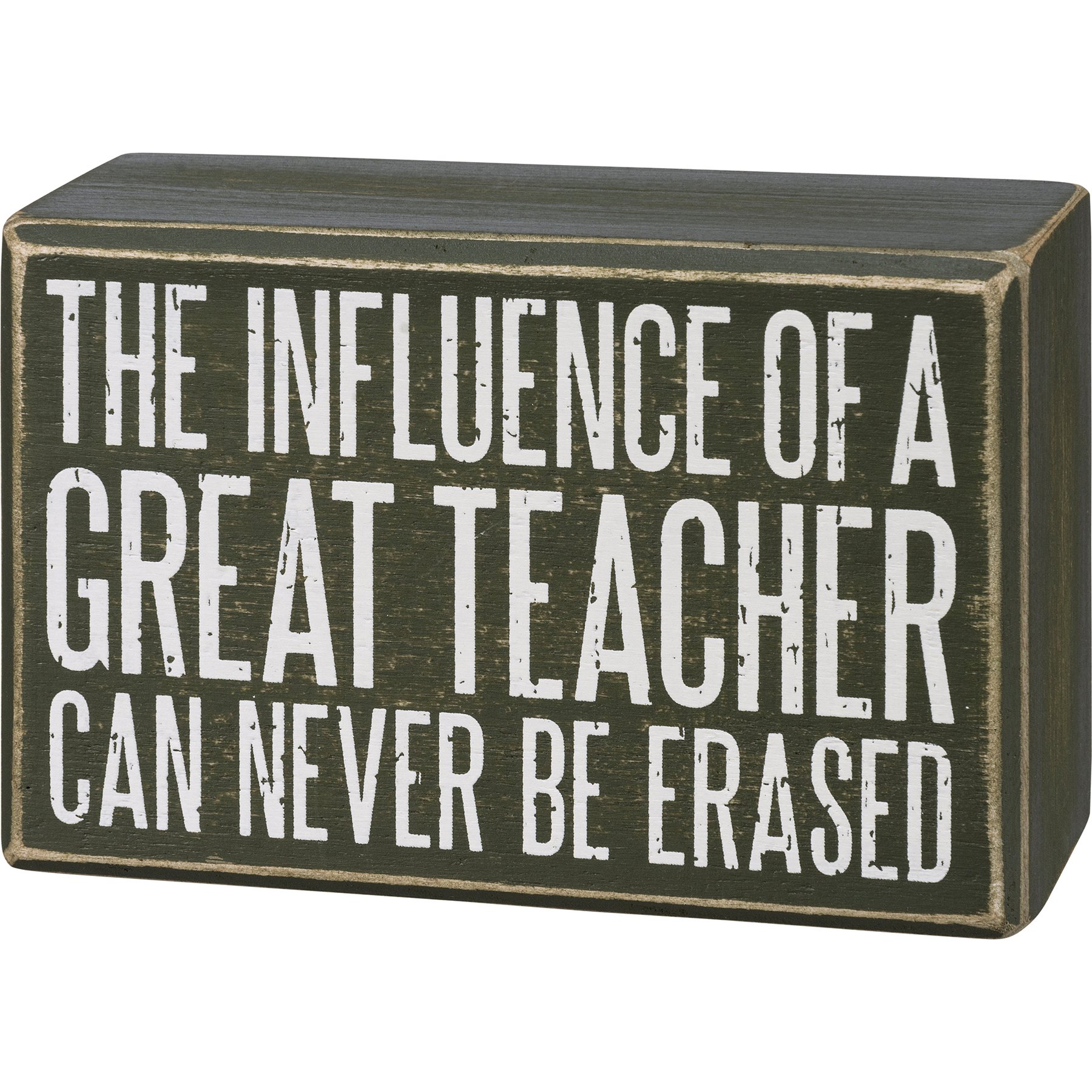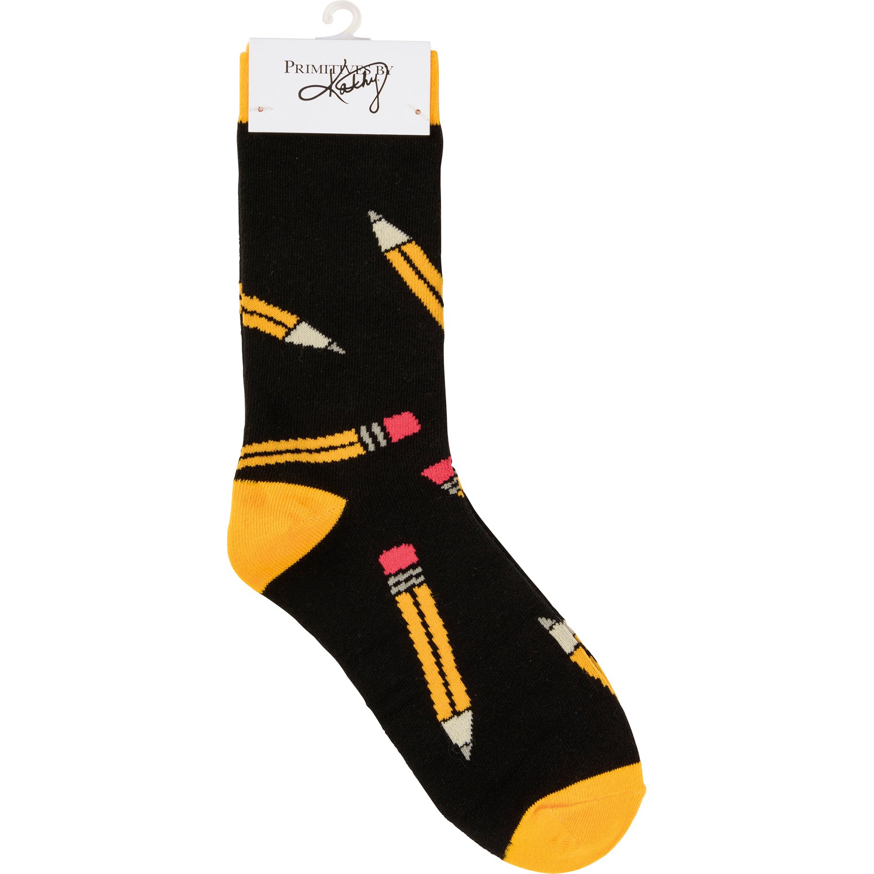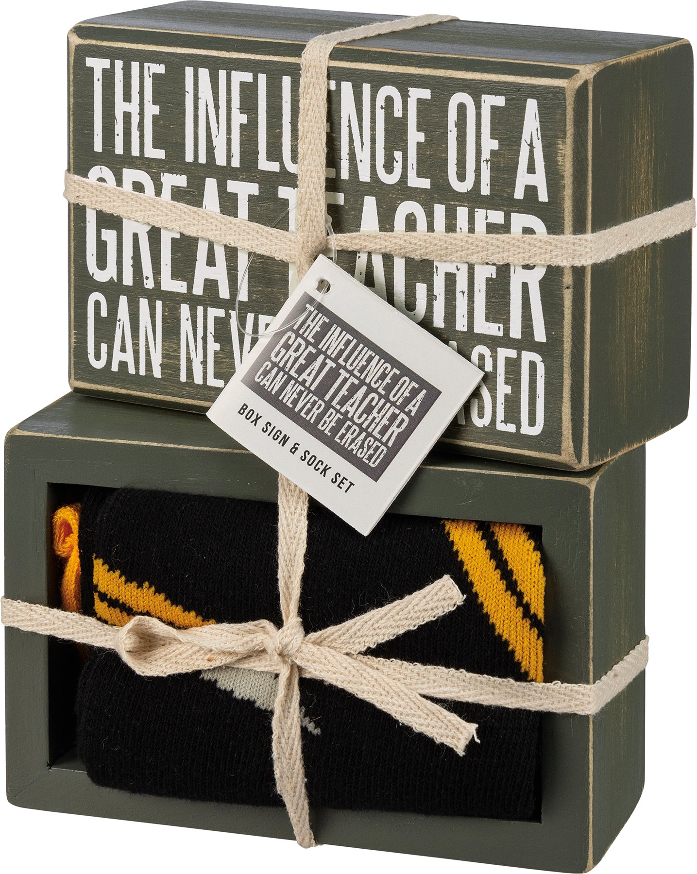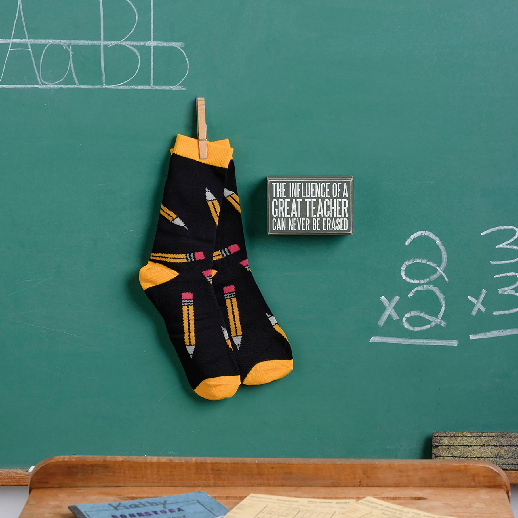 A perfectly giftable set including a box sign featuring a "The Influence Of A Great Teacher Can Never Be Erased" sentiment and a pair of socks with complementing pencil designs. Socks are cotton, nylon, and spandex and are machine-washable. One size fits most. Box sign is easy to hang or can free-stand alone. Socks come neatly rolled inside box sign and secured with tied cotton tape ribbon.