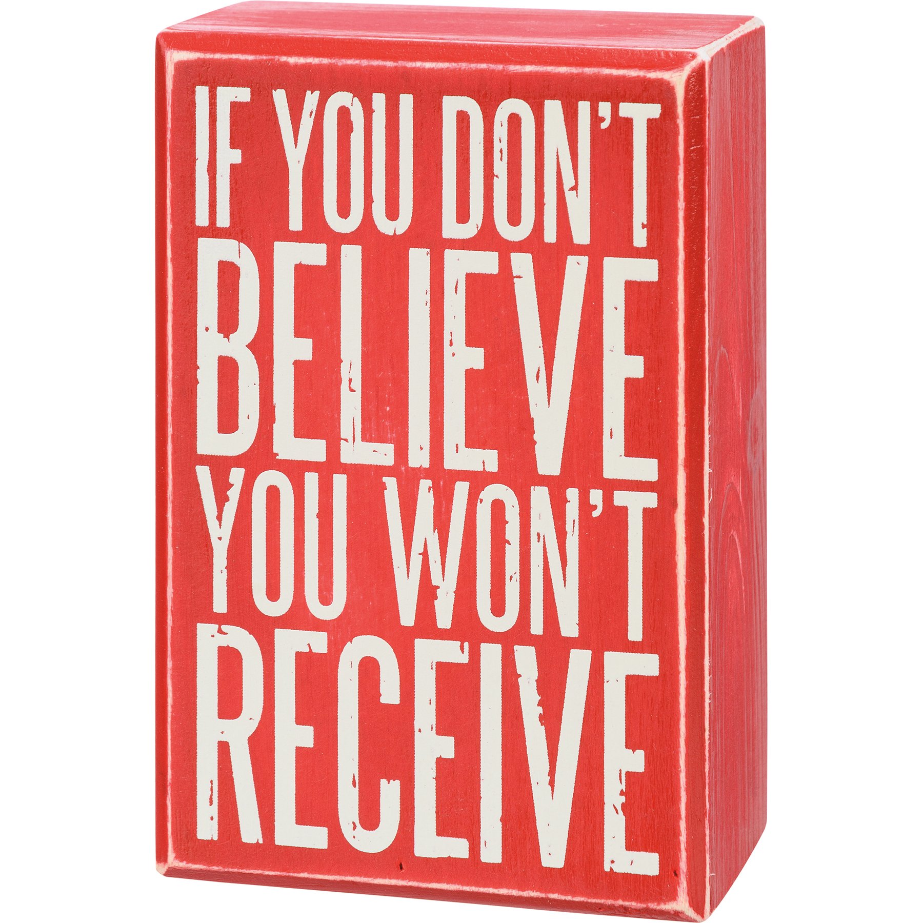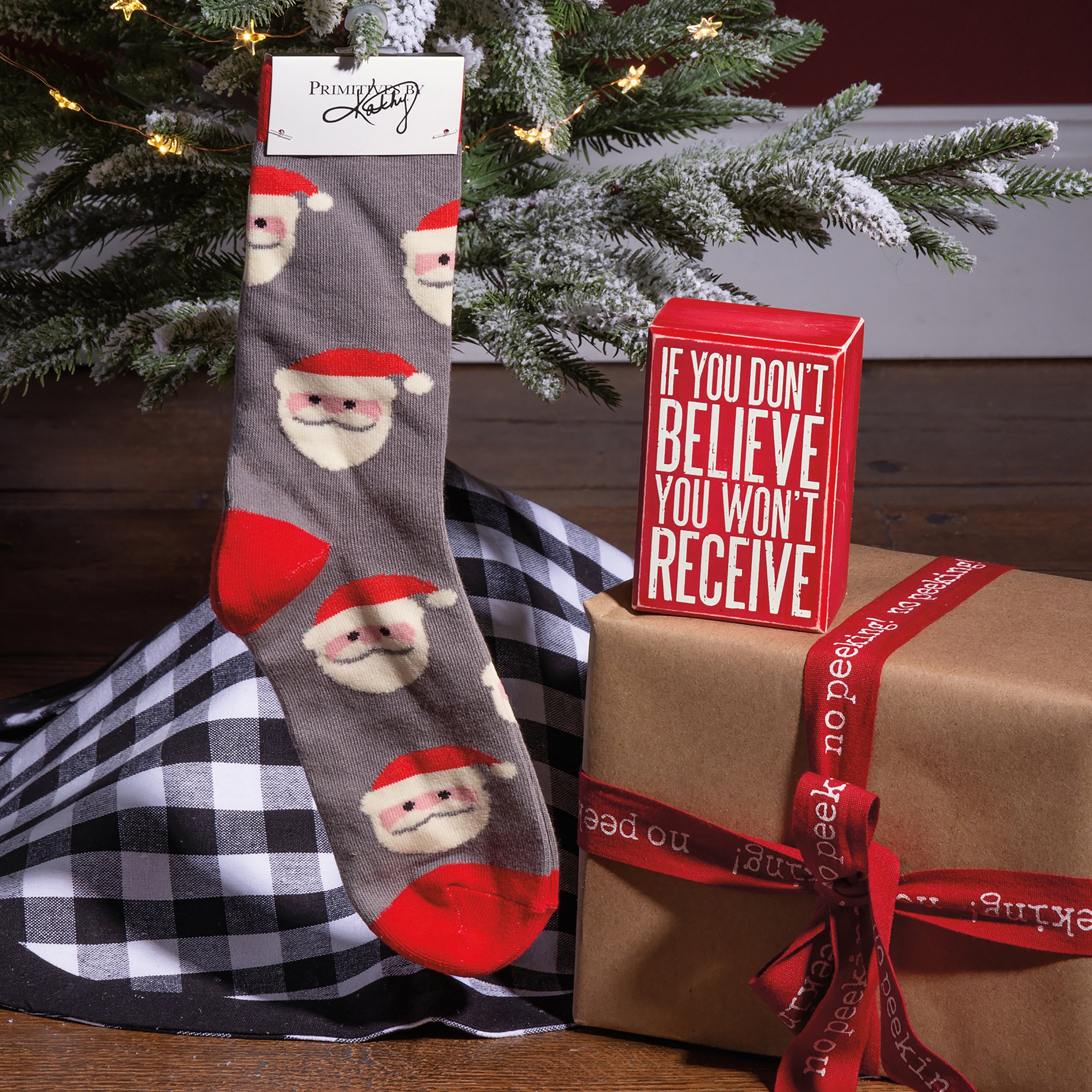 A perfectly giftable set including a box sign with "If You Don't Believe You Won't Receive" sentiment and a pair of socks featuring coordinating designs. Socks are cotton, nylon, and spandex and are machine-washable. One size fits most. Box sign is easy to hang or can free-stand alone. Socks come neatly rolled inside box sign and secured with tied cotton tape ribbon.