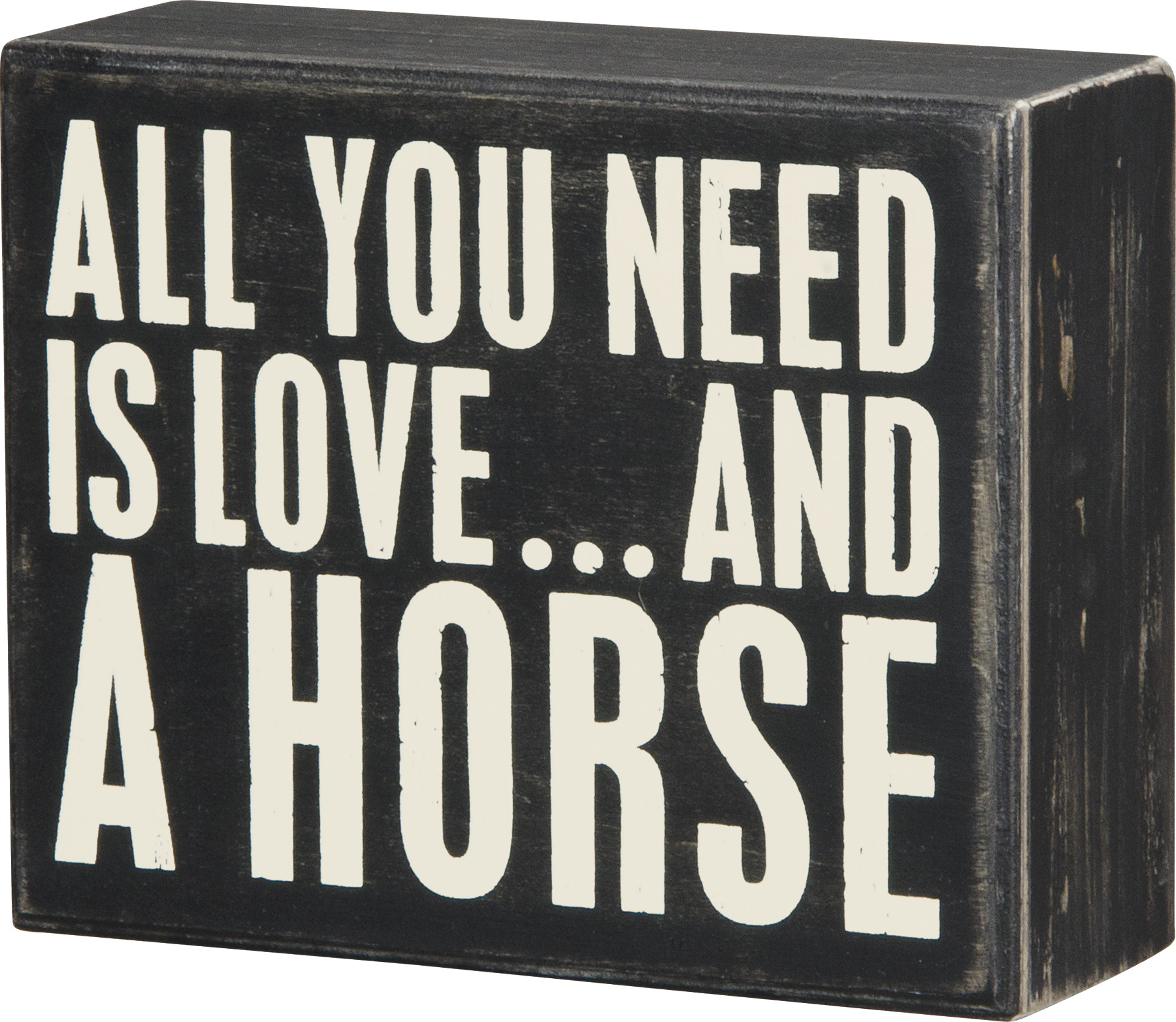 A classic black and white wooden box sign featuring a distressed "All You Need Is Love⦠And A Horse" sentiment. Easy to hang or can free-stand alone.