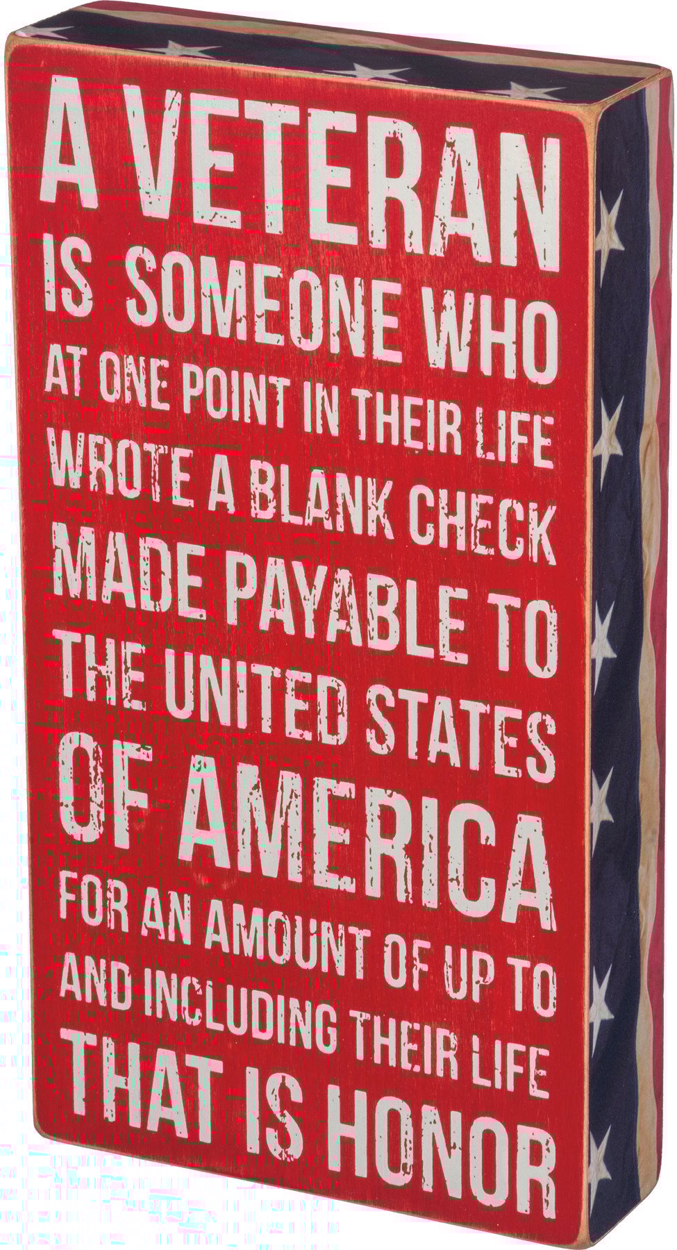 A red, white, and blue wooden box sign featuring a distressed "A Veteran Is Someone Who At One Point In Their Life Wrote A Blank Check Made Payable To The United States Of America For An Amount Of Up To And Including Their Life - That Is Honor" sentiment with stars and stripes trim designs. This veterans sign is easy to hang or can free-stand alone.