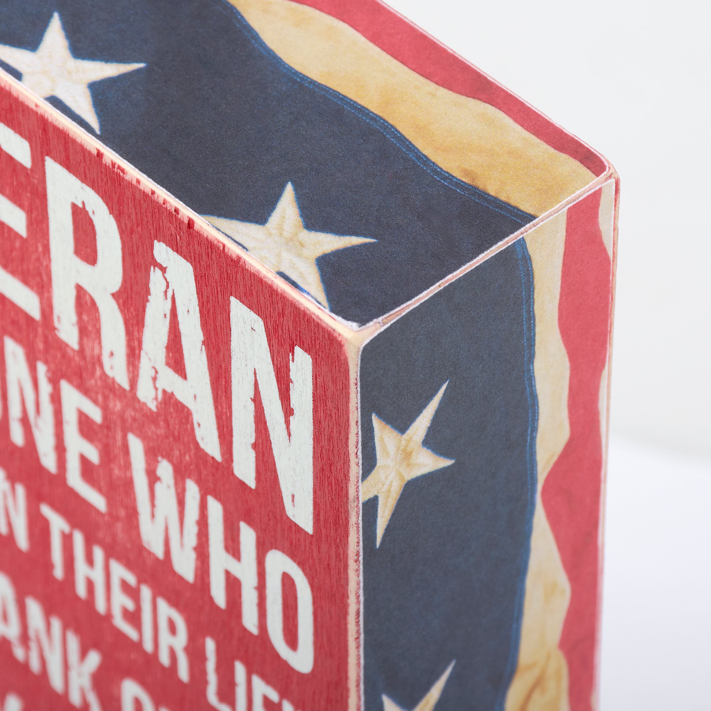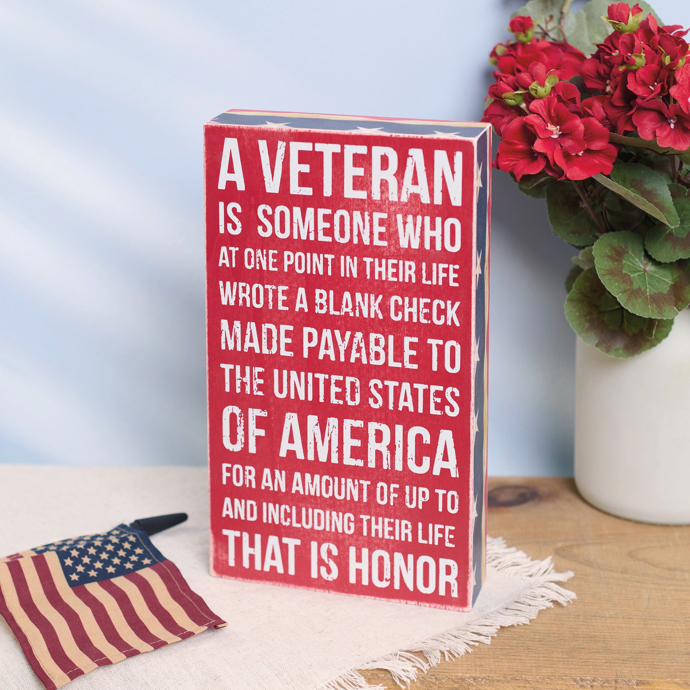 A red, white, and blue wooden box sign featuring a distressed "A Veteran Is Someone Who At One Point In Their Life Wrote A Blank Check Made Payable To The United States Of America For An Amount Of Up To And Including Their Life - That Is Honor" sentiment with stars and stripes trim designs. This veterans sign is easy to hang or can free-stand alone.