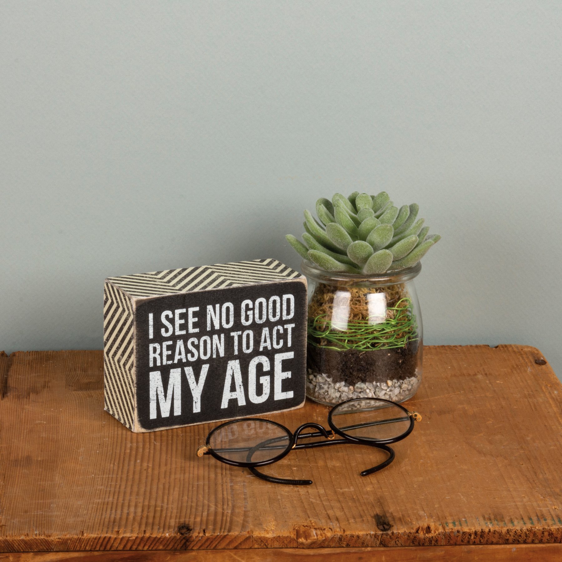 A classic black and white wooden box sign featuring a distressed "I See No Good Reason To Act My Age" sentiment with zigzag trim designs. Easy to hang or can free-stand alone.