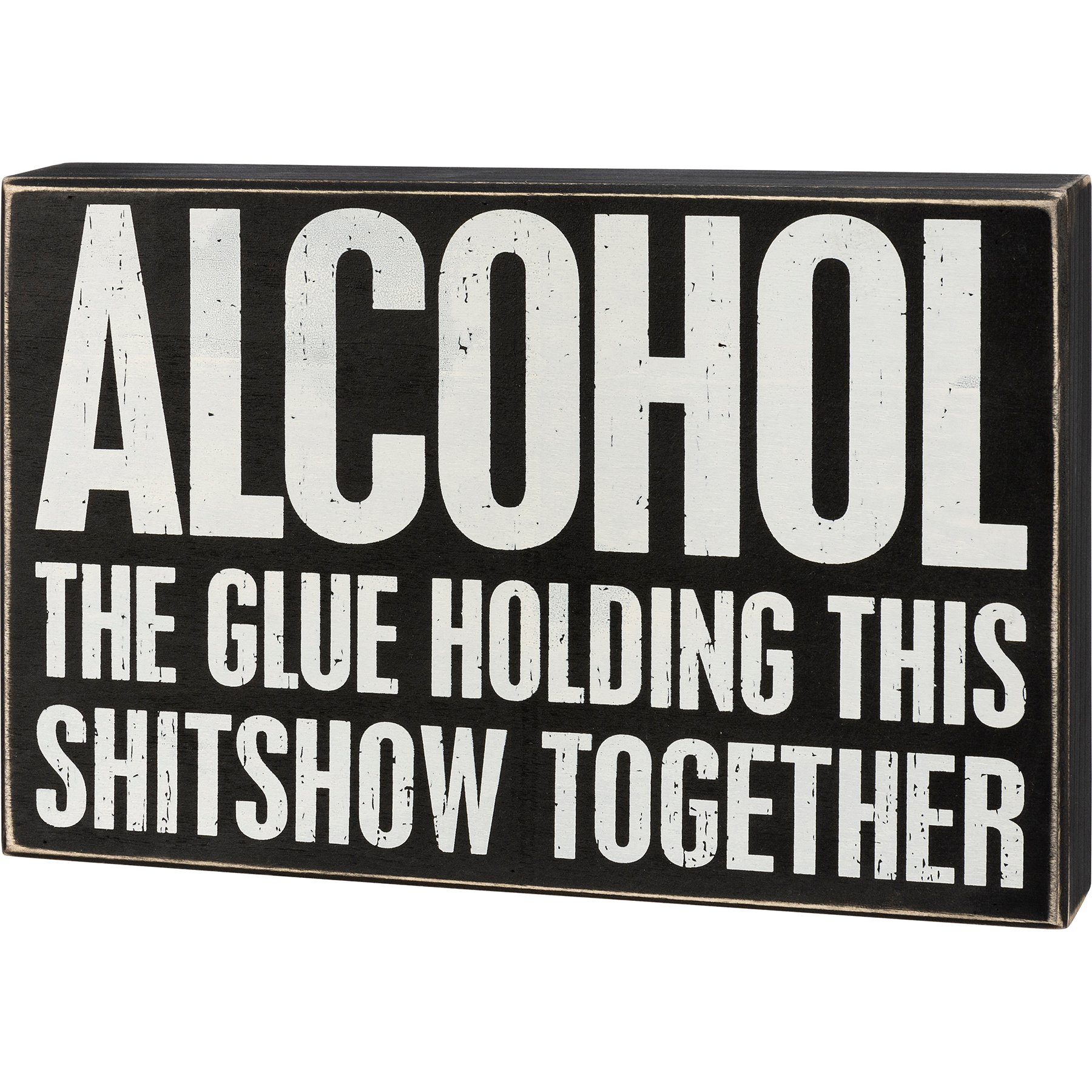 A classic black and white wooden box sign featuring a distressed "Alcohol The Glue Holding This Shitshow Together" sentiment. Easy to hang or can free-stand alone.