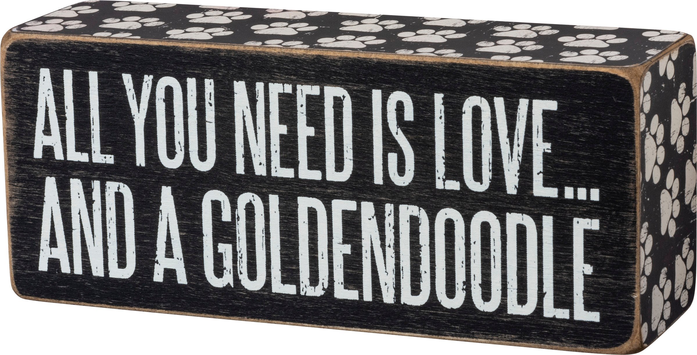 A classic black and white wooden box sign displaying a fun pet inspired sentiment that reads "All You Need Is Love... And A Goldendoodle." Pet box sign features distressed details with a coordinating paw print pattern on the sides. Our Goldendoodle sign is easy to hang or can free-stand alone. A fun pet-themed gift that can be easily displayed in any home or work space.