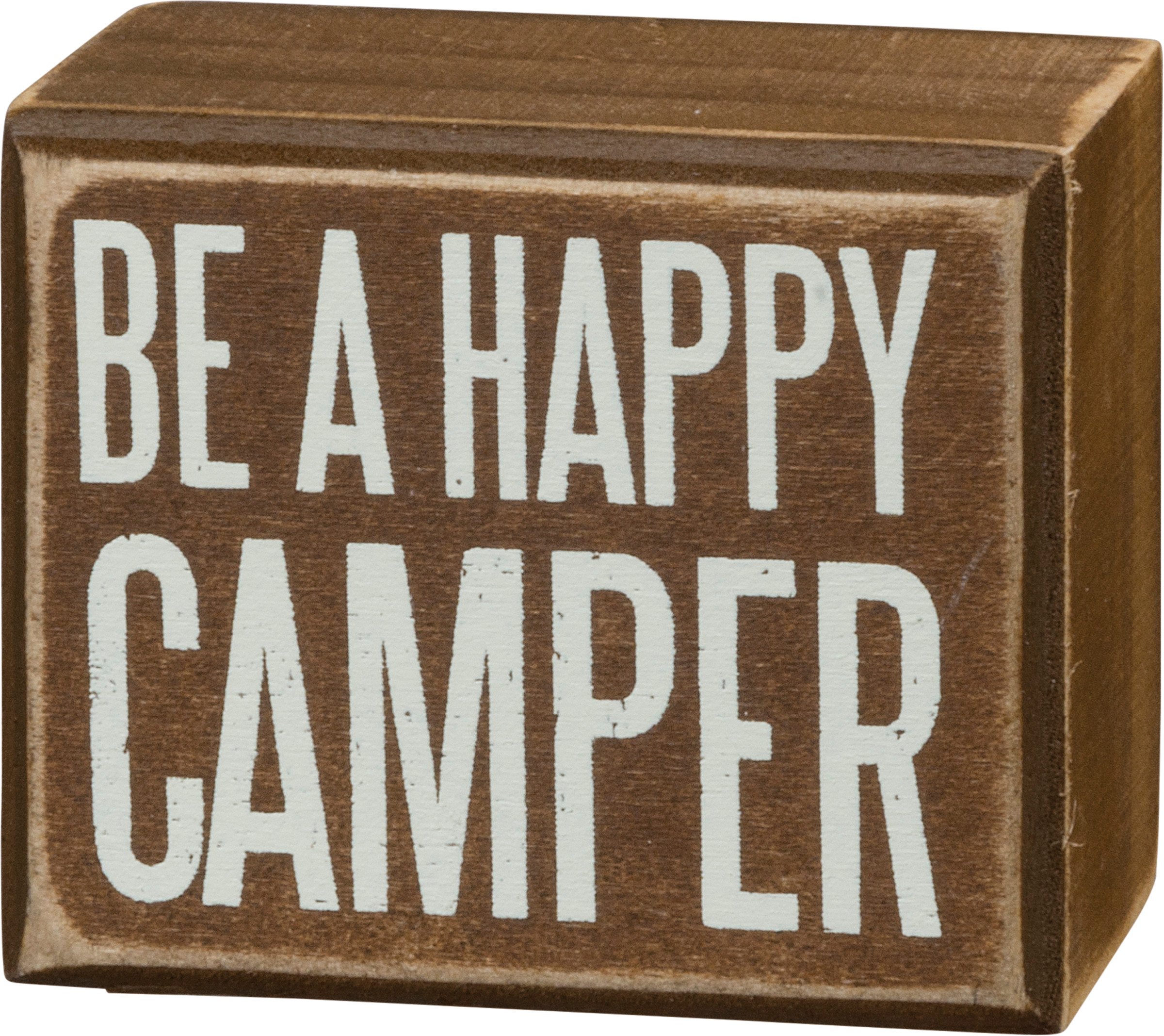 A wooden box sign featuring a distressed "Be A Happy Camper" sentiment that complements well with existing decor. Easy to hang or can free-stand alone.