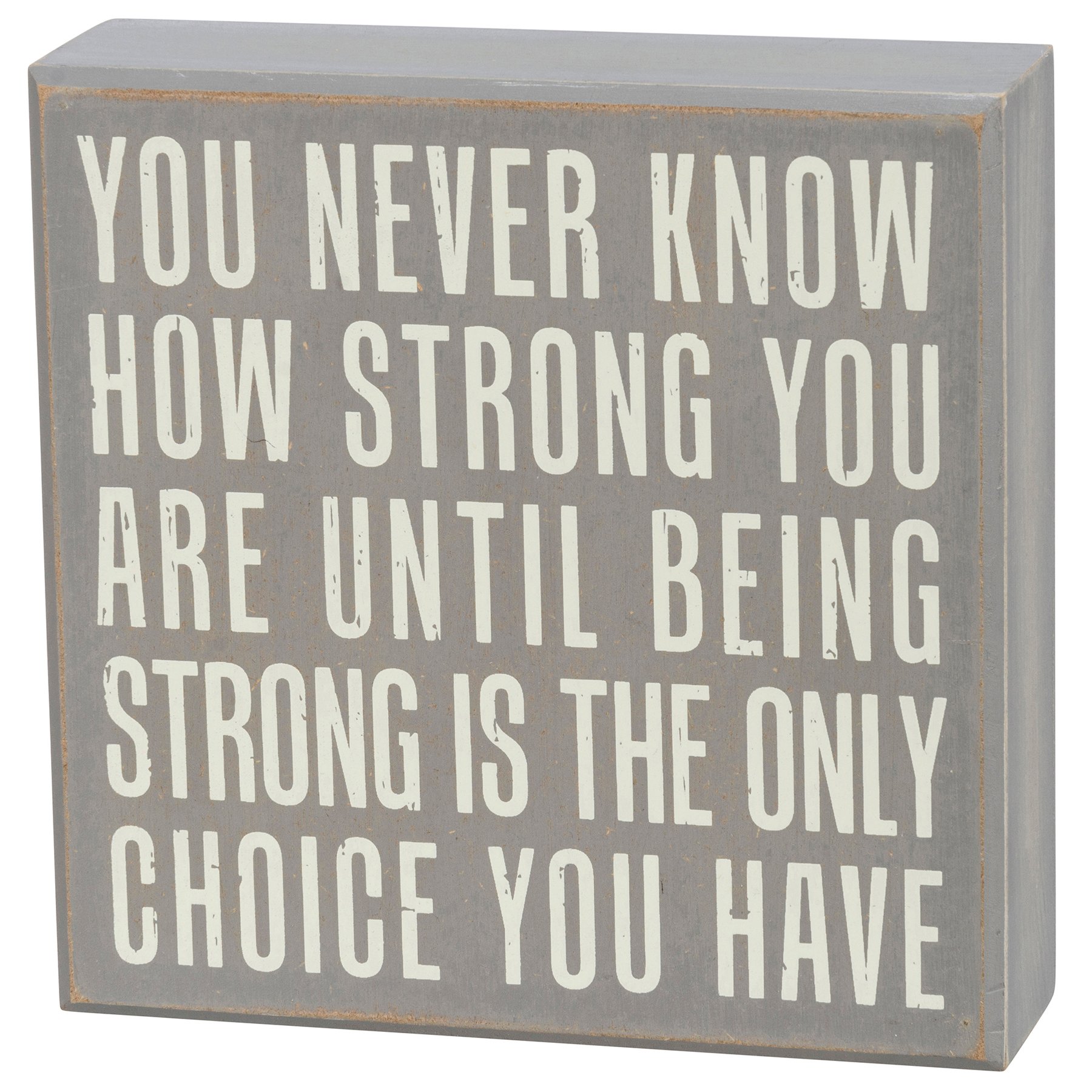 A classic gray and white wooden box sign featuring a distressed "You Never Know How Strong You Are Until Being Strong Is The Only Choice You Have" sentiment. Easy to hang or can free-stand alone. Last chance item sold at 60% off bulk discount – online only. Case minimum order required.