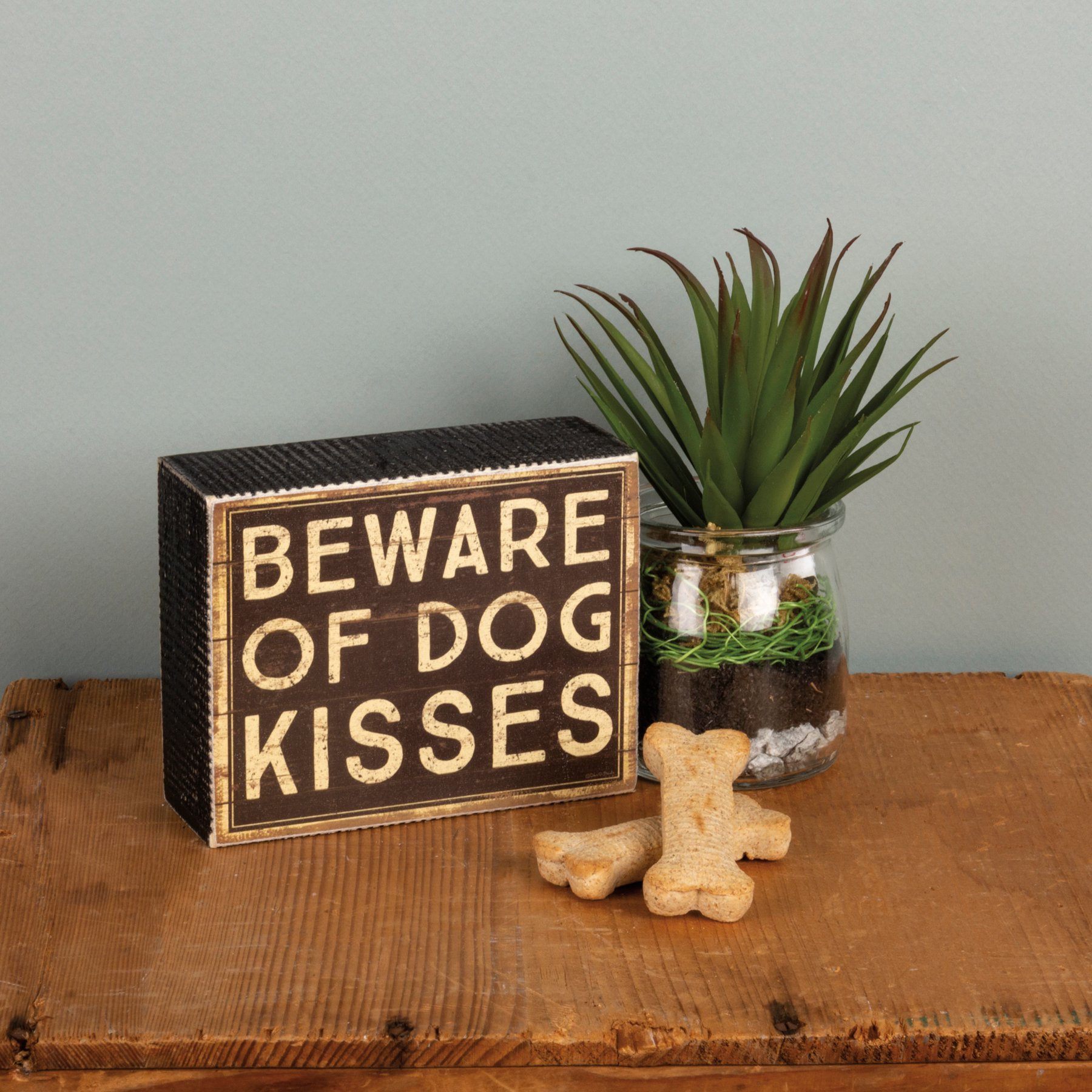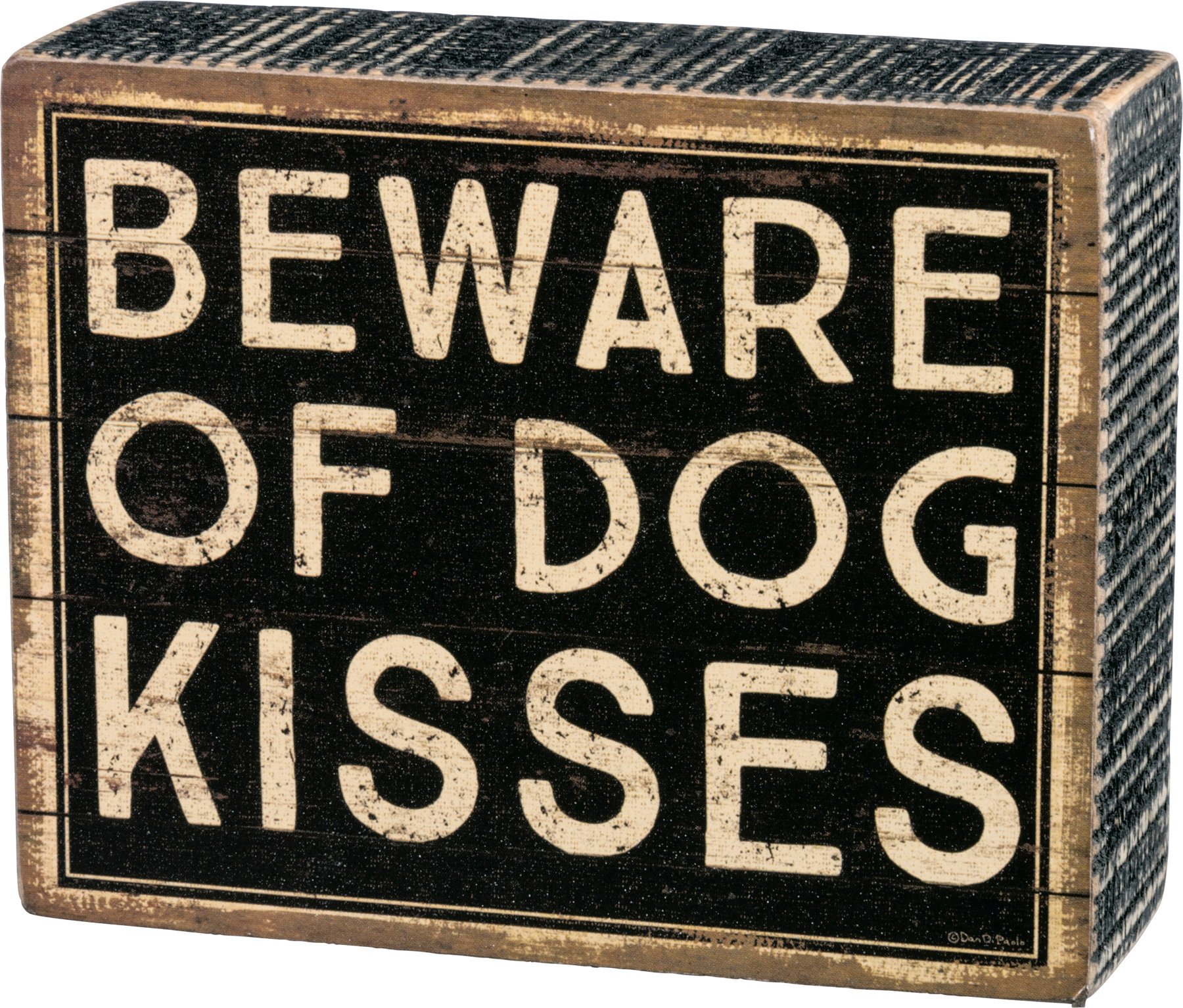 A classic black and white wooden box sign from our Pet Collection displaying a rustic design with a fun pet inspired sentiment that reads "Beware Of Dog Kisses." Funny pet box sign features distressed details with coordinating black color on sides and back. Our Beware of Dog Kisses sign is easy to hang or can free-stand alone. A fun pet-themed gift that can be easily displayed in any home or work space.