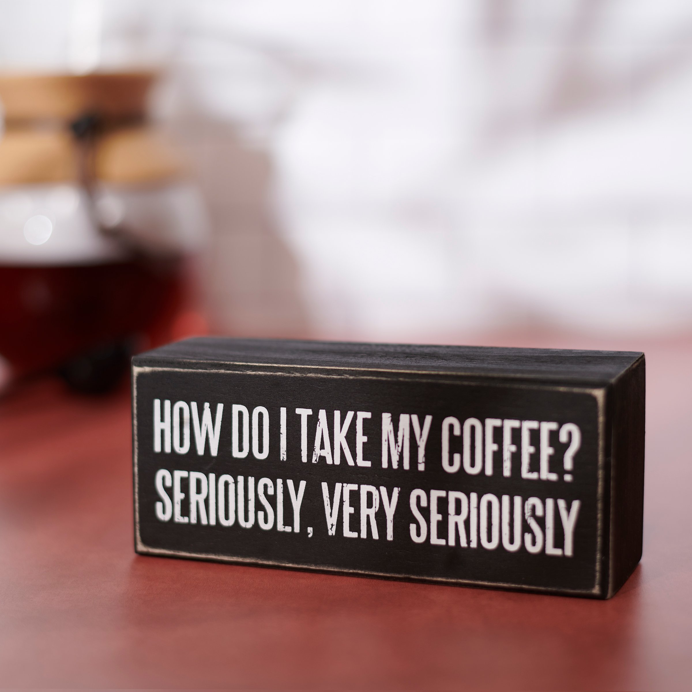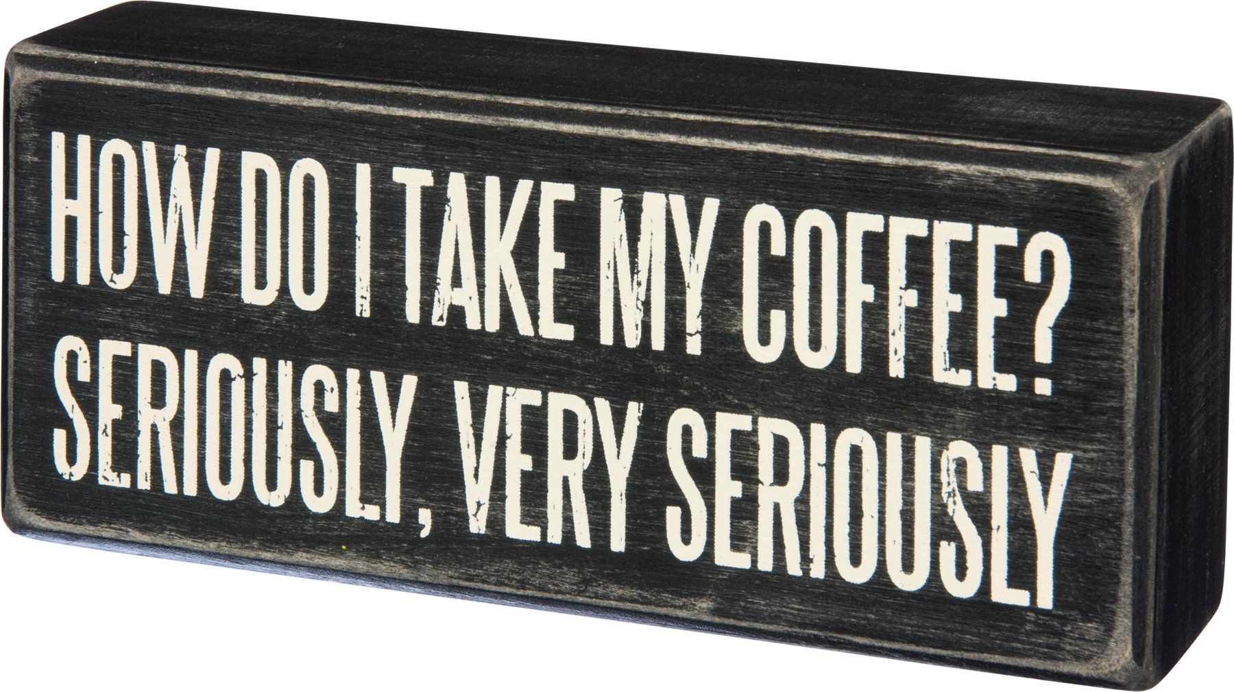 A classic black and white wooden box sign featuring a distressed "How Do I Take My Coffee? Seriously, Very Seriously" sentiment. Easy to hang or can free-stand alone.