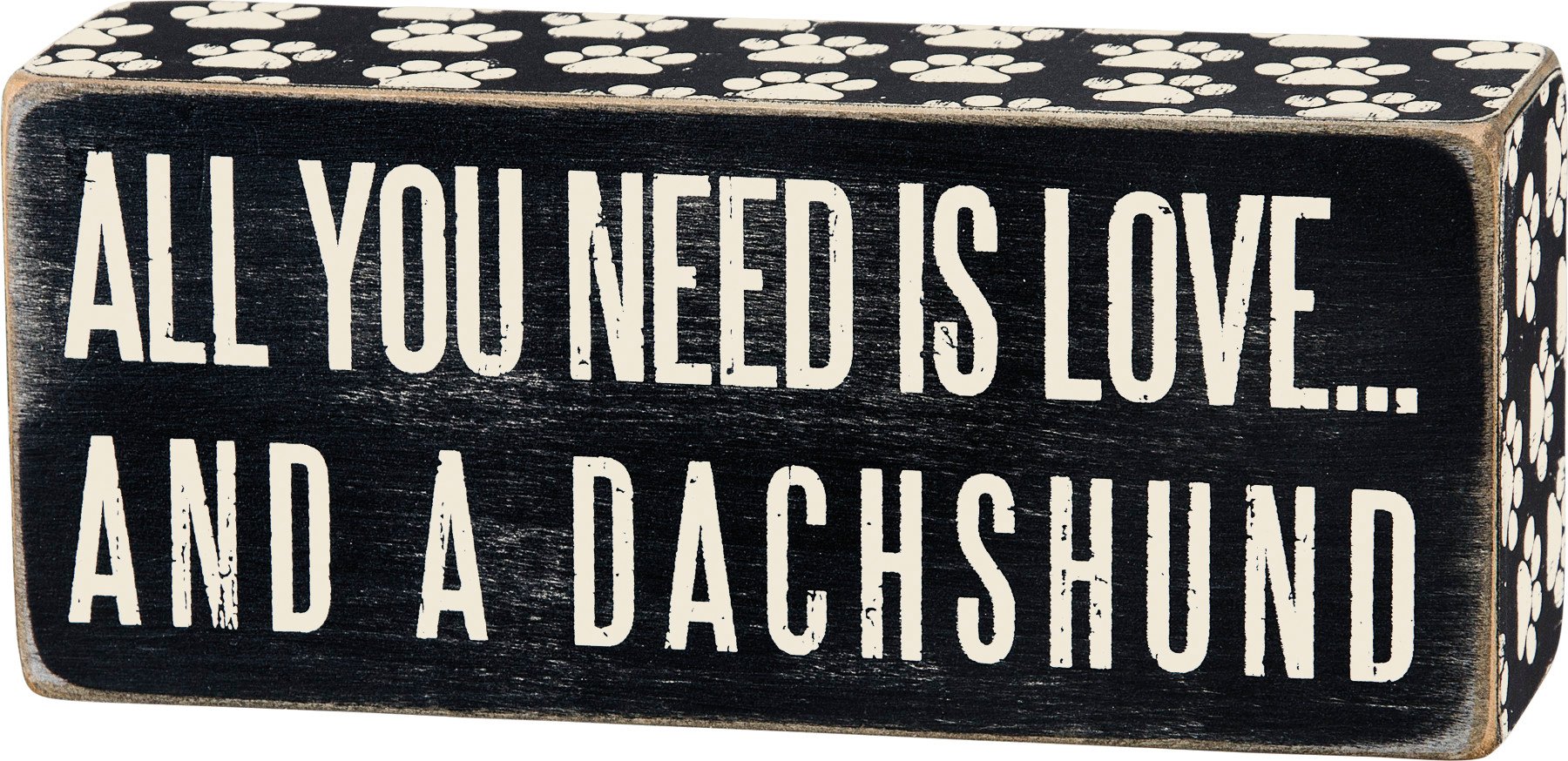 A classic black and white wooden box sign from our best-selling Pet Collection displaying a fun pet inspired sentiment that reads "All You Need Is Love... And A Dachshund." Pet box sign features distressed details with a coordinating paw print pattern on the sides. Our Dachshund sign is easy to hang or can free-stand alone. A fun pet-themed gift that can be easily displayed in any home or work space.