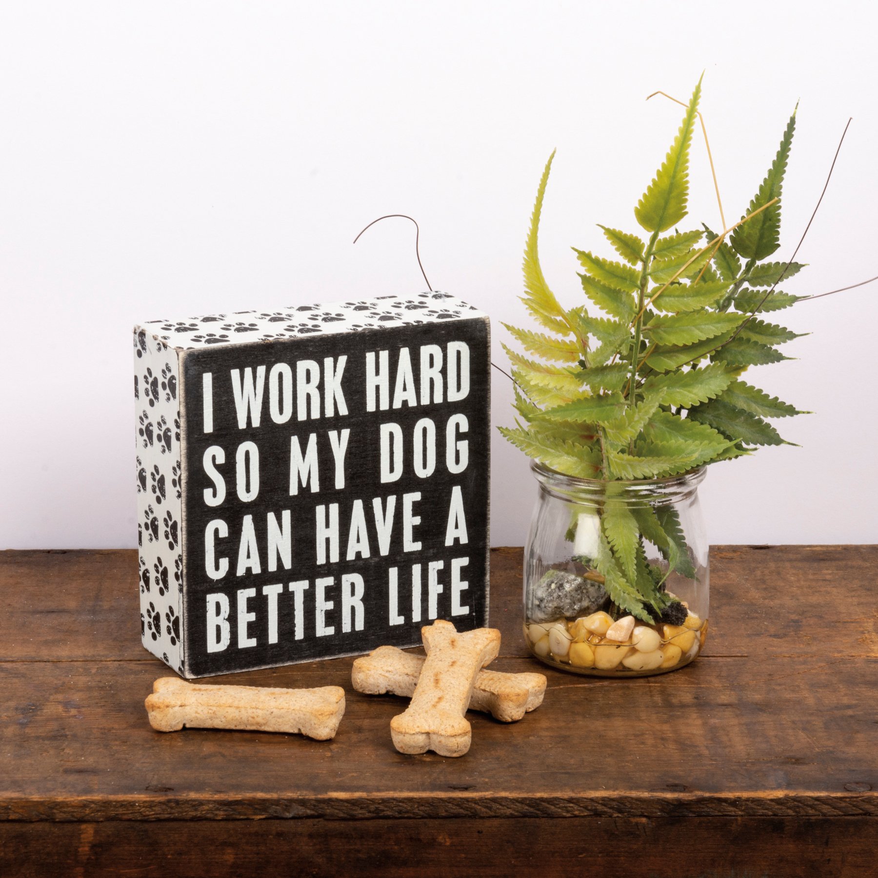 A classic black and white wooden box sign featuring a distressed "I Work Hard So My Dog Can Have A Better Life" sentiment with paw print trim designs. Our Dog Better Life box sign is easy to hang or can free-stand alone.