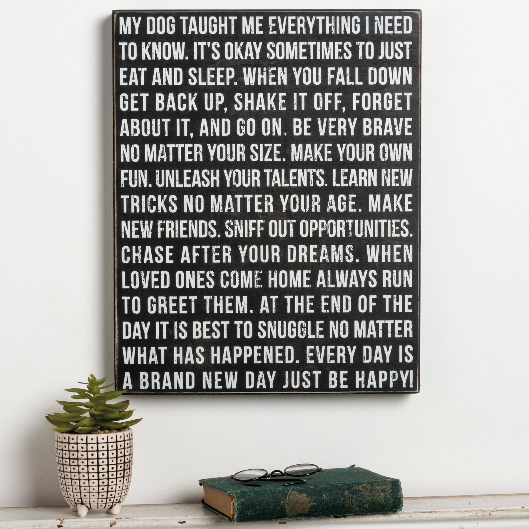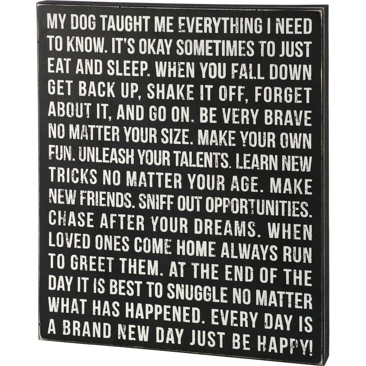 A classic black and white wooden box sign featuring a fun dog inspired sentiment that reads "My Dog Taught Me Everything I Need To Know. It's Okay Sometimes To Just Eat And Sleep. When You Fall Down Get Back Up, Shake It Off, Forget About It, And Go On. Be Very Brave No Matter Your Size. Make Your Own Fun. Unleash Your Talents. Learn New Tricks No Matter Your Age. Make New Friends. Sniff Out Opportunities. Chase After Your Dreams. When Loved Ones Come Home Always Run To Greet Them. At The End Of The Day It Is Best To Snuggle No Matter What Has Happened. Every Day Is A Brand New Day Just Be Happy!" Funny pet box sign features distressed details with coordinating black color on sides and back. Our Dog Taught Me sign is easy to hang for display. A fun pet-themed gift that can be displayed as a statement piece.
