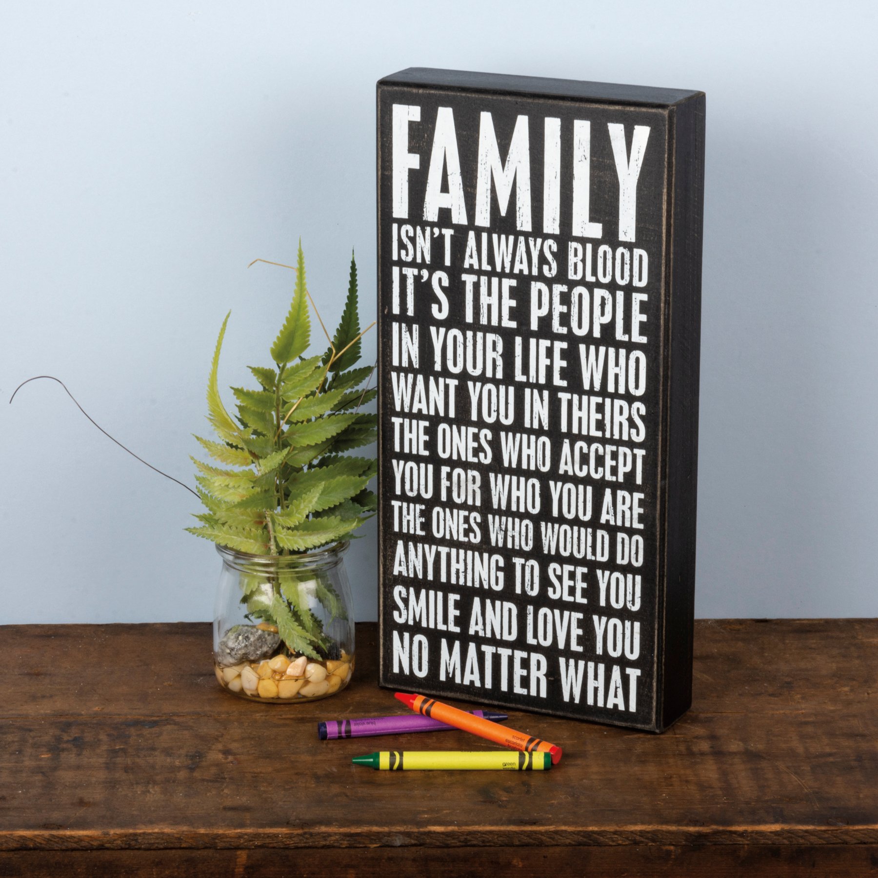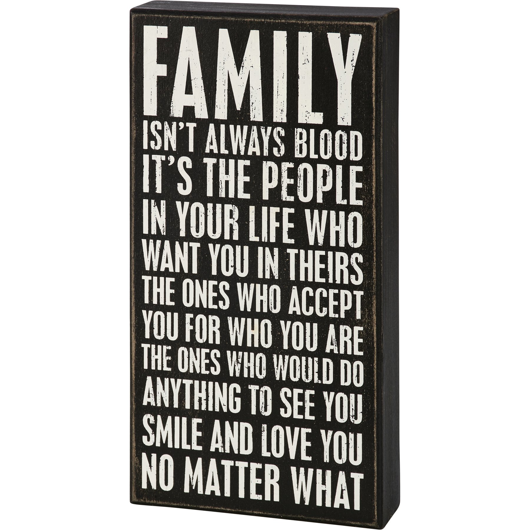 A classic black and white wooden box sign featuring a distressed "Family Isn't Always Blood - It's The People In Your Life Who Want You In Theirs - The Ones Who Accept You For Who You Are - The Ones Who Would Do Anything To See You Smile And Love You No Matter What" sentiment. Easy to hang or can free-stand alone.