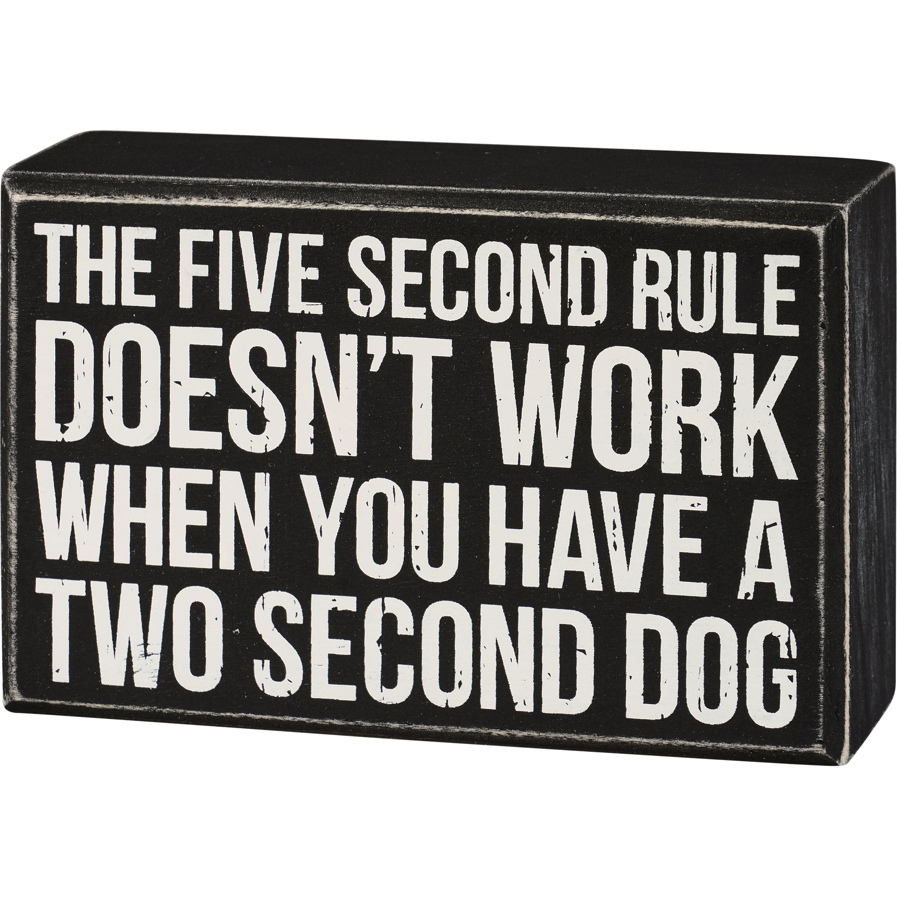 A classic black and white wooden box sign from our Pet Collection displaying a fun pet inspired sentiment that reads "The Five Second Rule Doesn't Work When You Have A Two Second Dog." Funny pet box sign features distressed details with coordinating black color on sides and back. Our Five Second Rule Doesn't Work sign is easy to hang or can free-stand alone. A fun pet-themed gift that can be easily displayed in any home or work space.