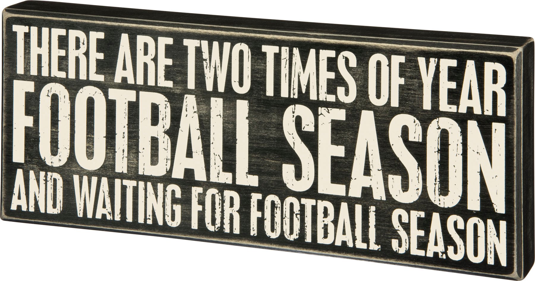 A classic black and white wooden box sign featuring a distressed "There Are Two Times Of Year - Football Season And Waiting For Football Season" sentiment with zigzag trim designs. Easy to hang or can free-stand alone. Not eligible for discounting.
