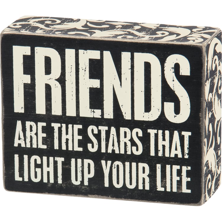 A classic black and white wooden box sign featuring a distressed "Friends Are The Stars That Light Up Your Life" sentiment with floral trim designs. Easy to hang or can free-stand alone.