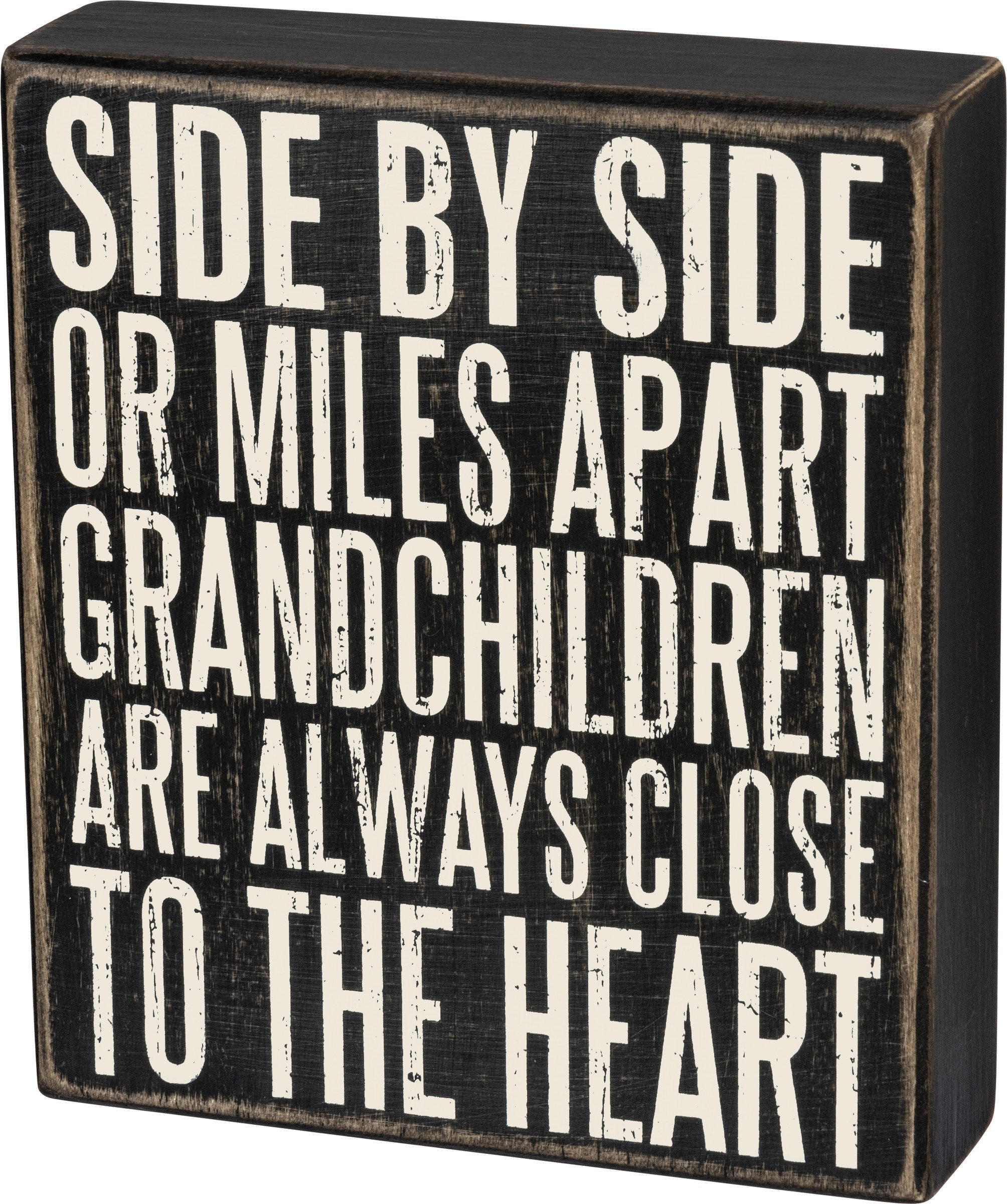 A classic black and white wooden box sign featuring a distressed "Side By Side Or Miles Apart - Grandchildren Are Always Close To The Heart" sentiment. Easy to hang or can free-stand alone.