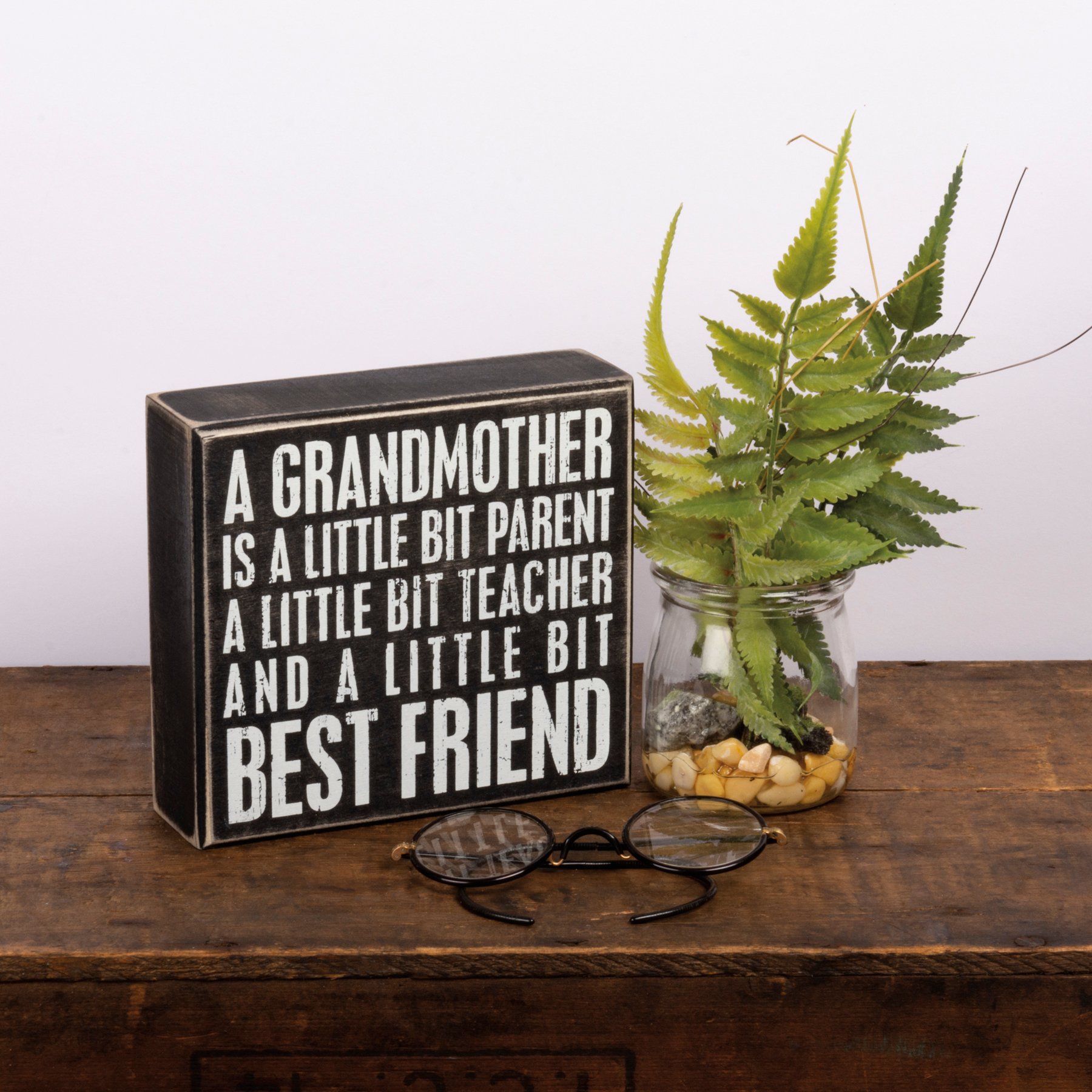 A classic black and white wooden box sign featuring a distressed "A Grandmother Is A Little Bit Parent - A Little Bit Teacher - And A Little Bit Best Friend" sentiment. Easy to hang or can free-stand alone.