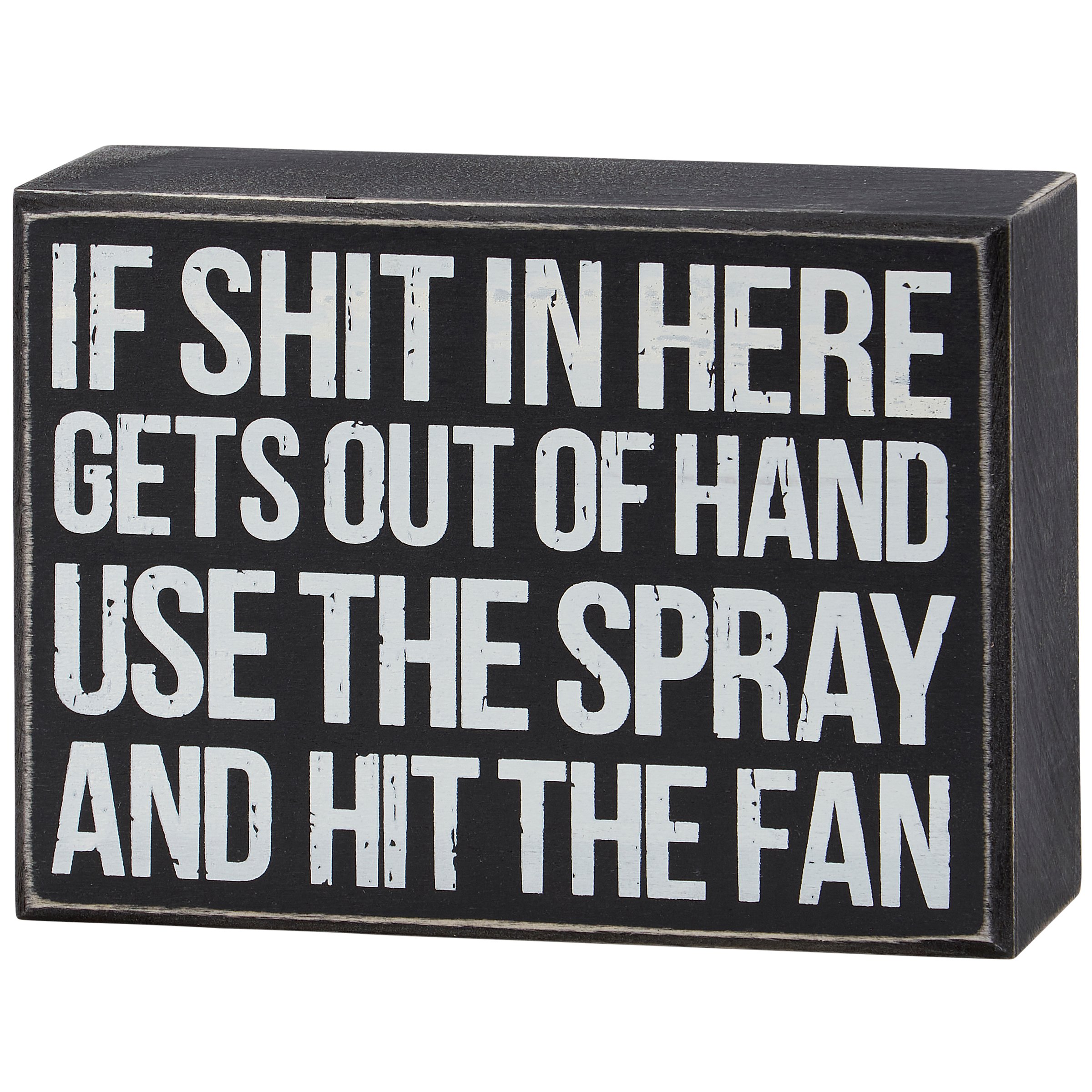 A classic black and white wooden box sign from our Box Sign Collection displaying a fun bathroom inspired sentiment that reads "If Shit In Here Gets Out Of Hand Use The Spray And Hit The Fan." Funny bathroom box sign features distressed details with coordinating black color on sides and back. Our Hit The Fan box sign is easy to hang or can free-stand alone. A funny gift that can be easily displayed in any bathroom.