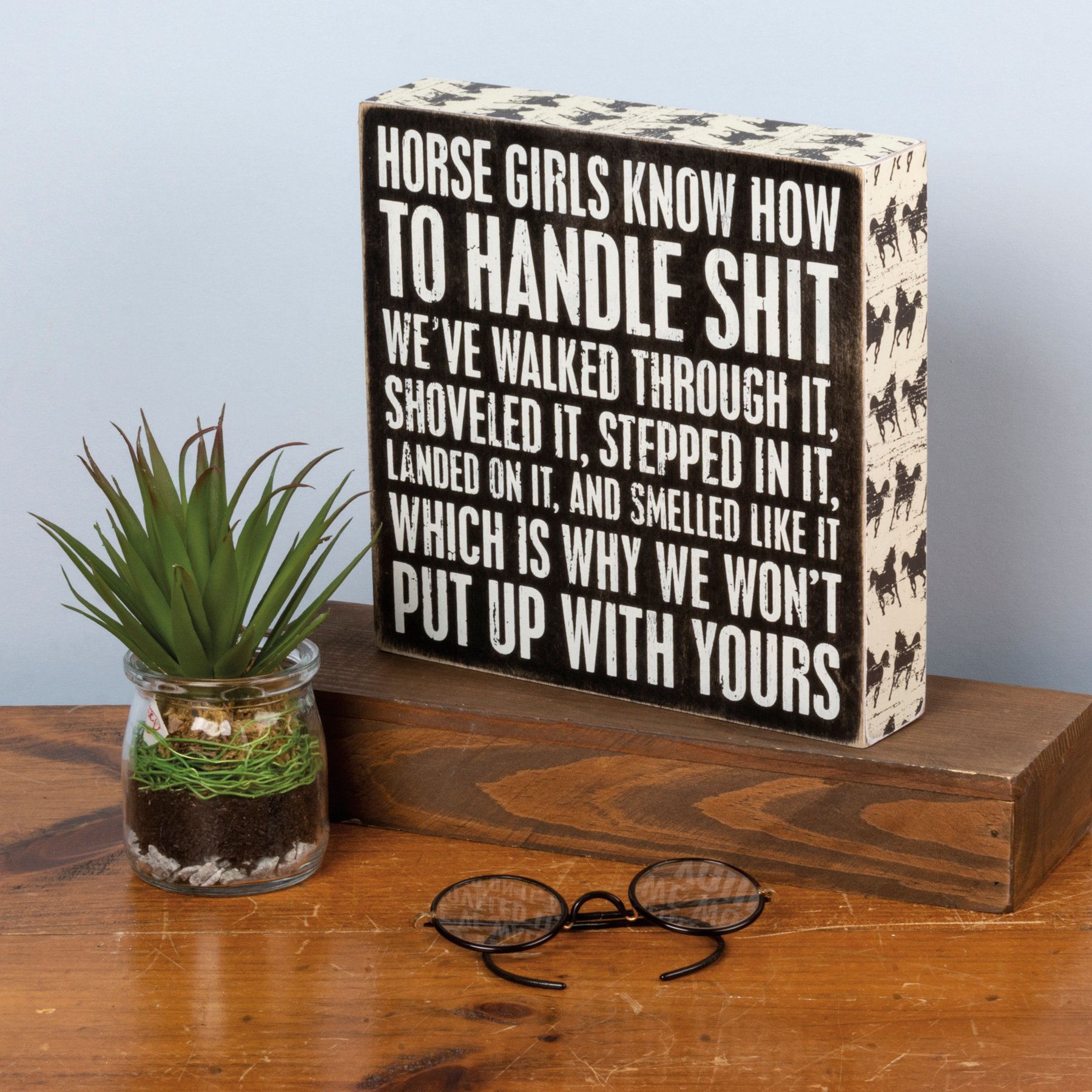 A classic black and white wooden box sign featuring a distressed "Horse Girls Know How To Handle Shit - We've Walked Through It, Shoveled It, Stepped In It, Landed On It, And Smelled Like It - Which Is Why We Don't Put Up With Yours" sentiment with horse print trim designs. Easy to hang or can free-stand alone.