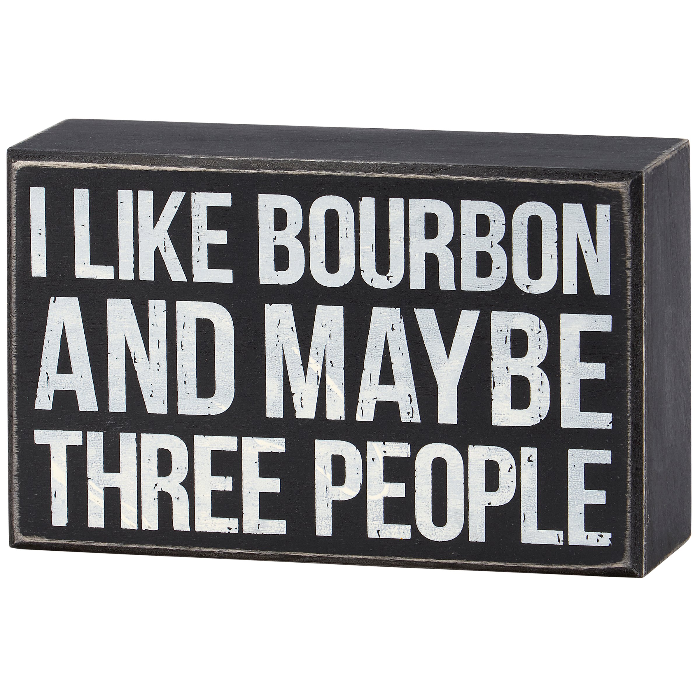 A classic black and white wooden box sign from our Box Sign Collection displaying a humorous alcohol inspired sentiment that reads "I Like Bourbon And Maybe Three People." Funny box sign features distressed details with coordinating black color on sides and back. Our I Like Bourbon box sign is easy to hang or can free-stand alone. A funny alcohol-themed gift that can be easily displayed in any home or work space.
