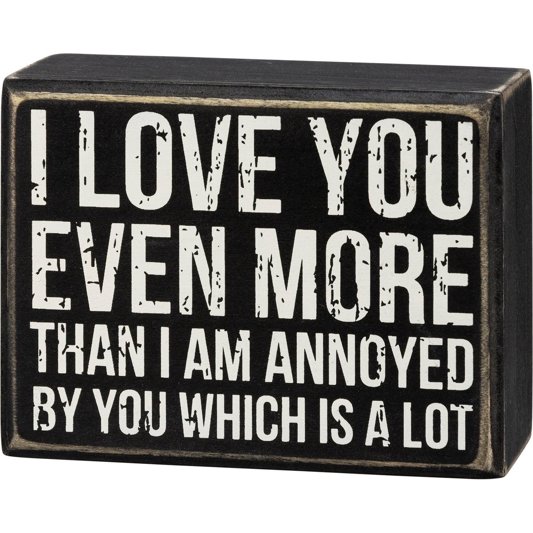 A classic wooden box sign featuring an "I Love You More Than I'm Annoyed By You Which Is A Lot" sentiment. Easy to hang or can free-stand alone.