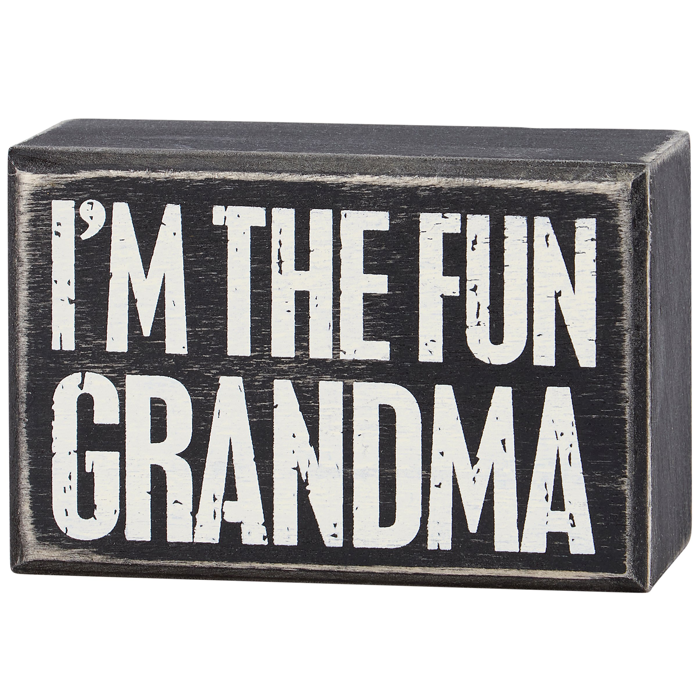 A classic black and white wooden box sign from our Mother's Day Collection displaying a fun grandma-themed sentiment that reads "I'm The Fun Grandma." Funny grandma box sign features distressed details with coordinating black color on sides and back. Our I'm The Fun Grandma box sign is easy to hang or can free-stand alone. A fun Mother's Day gift that can be easily displayed in any home or work space.