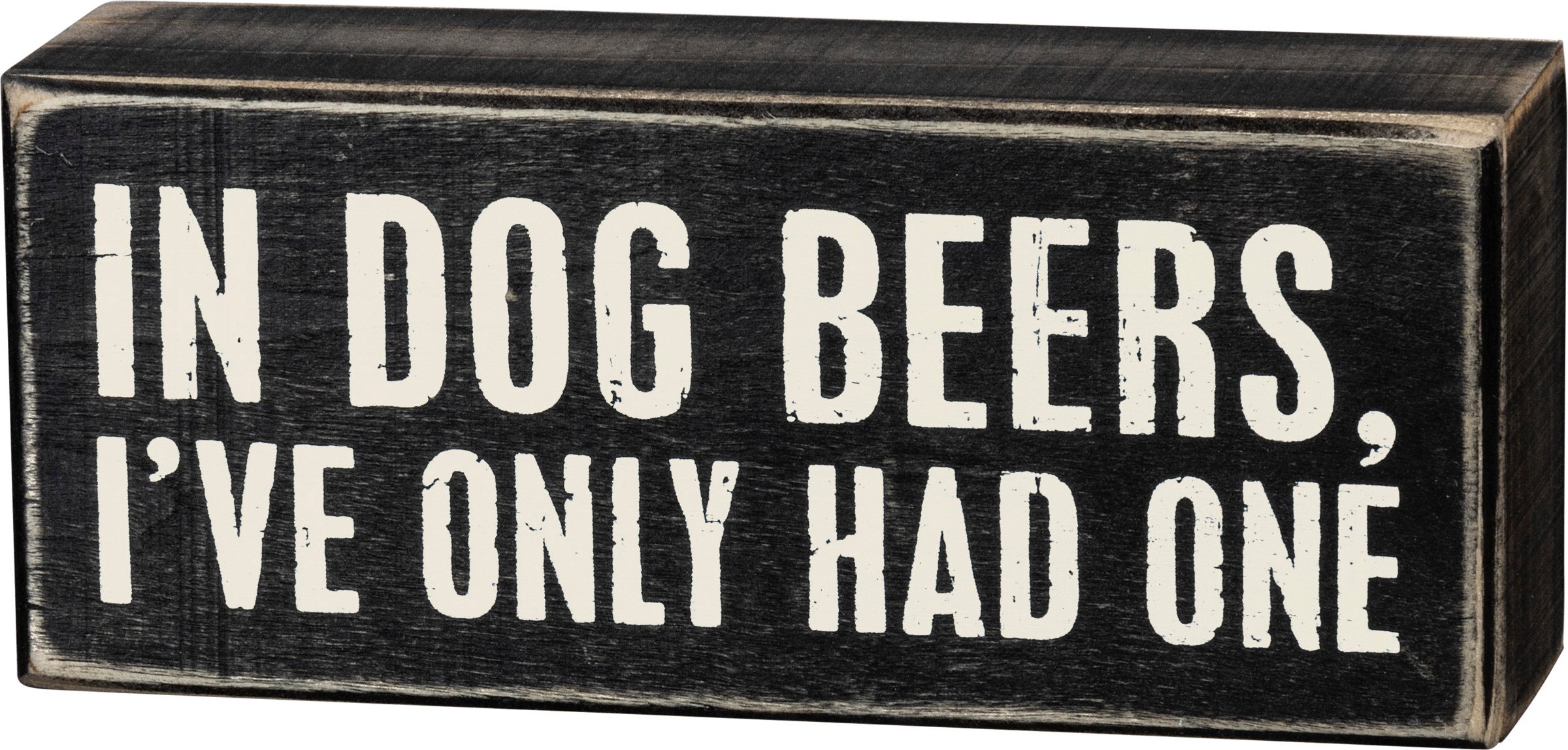 A classic black and white wooden box sign from our best-selling Pet Collection displaying a sarcastic pet inspired sentiment that reads "In Dog Beers, I've Only Had One." Funny pet box sign features distressed details with coordinating black color on sides and back. Our In Dog Beers sign is easy to hang or can free-stand alone. A fun pet-themed gift that can be easily displayed in any home or work space.