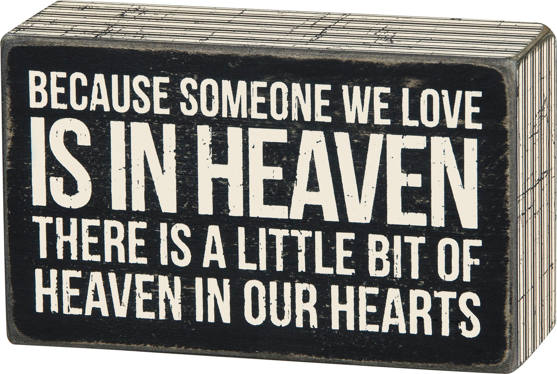 A classic black and white wooden box sign from our Bereavement Collection displaying a heartwarming inspirational sentiment that reads "Because Someone We Love Is In Heaven There Is A Little Bit Of Heaven In Our Hearts." This inspirational box sign features distressed details with a coordinating black and white stripe pattern on the sides. Our In Our Hearts box sign is easy to hang or can free-stand on a flat surface for display. An inspirational gift that can be easily displayed in any home or work space. Not eligible for discounting.