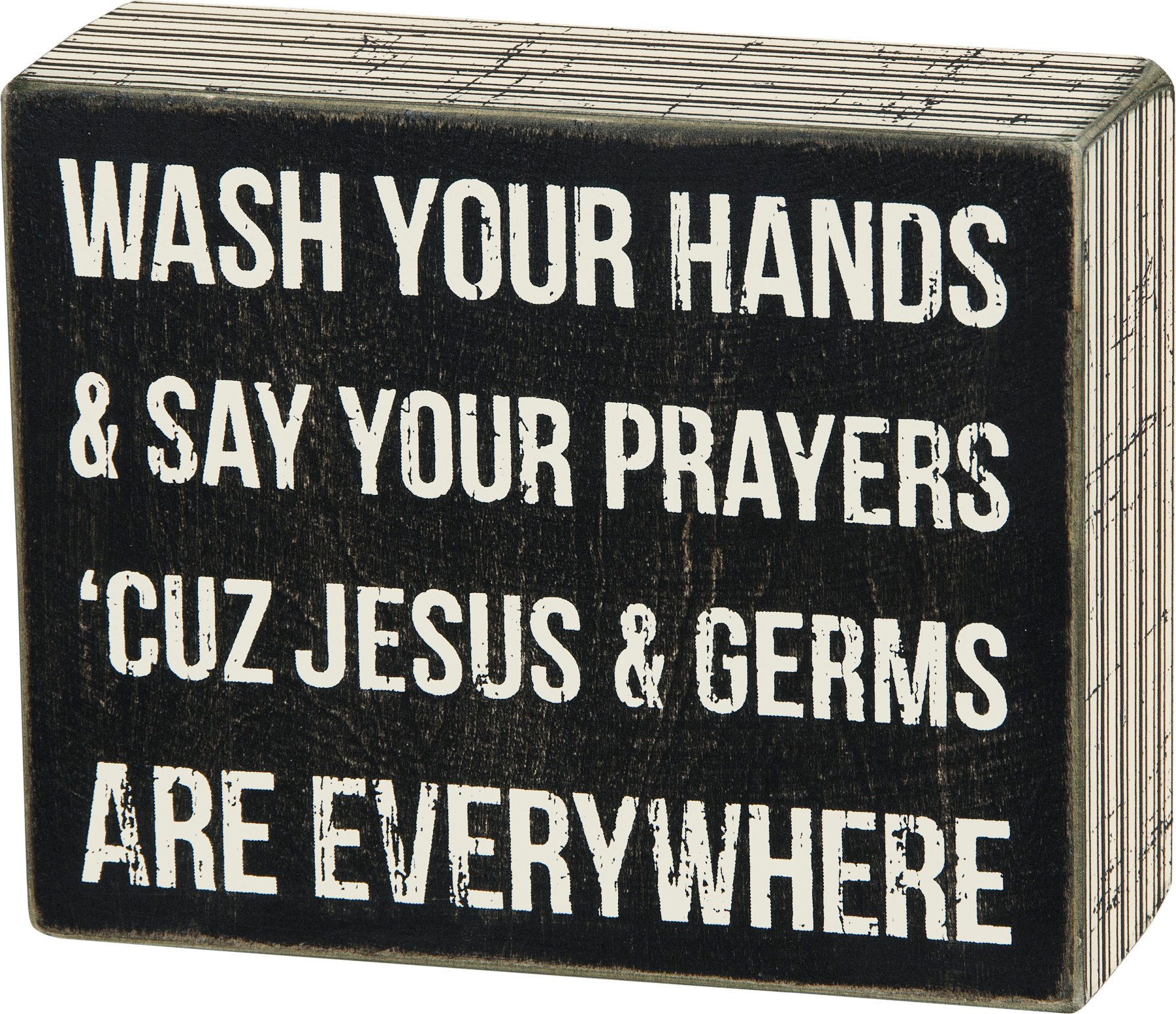 A classic black and white wooden box sign featuring a distressed "Wash Your Hands & Say Your Prayers 'Cuz Jesus & Germs Are Everywhere" sentiment with striped trim designs. Easy to hang or can free-stand alone. Not eligible for discounting.
