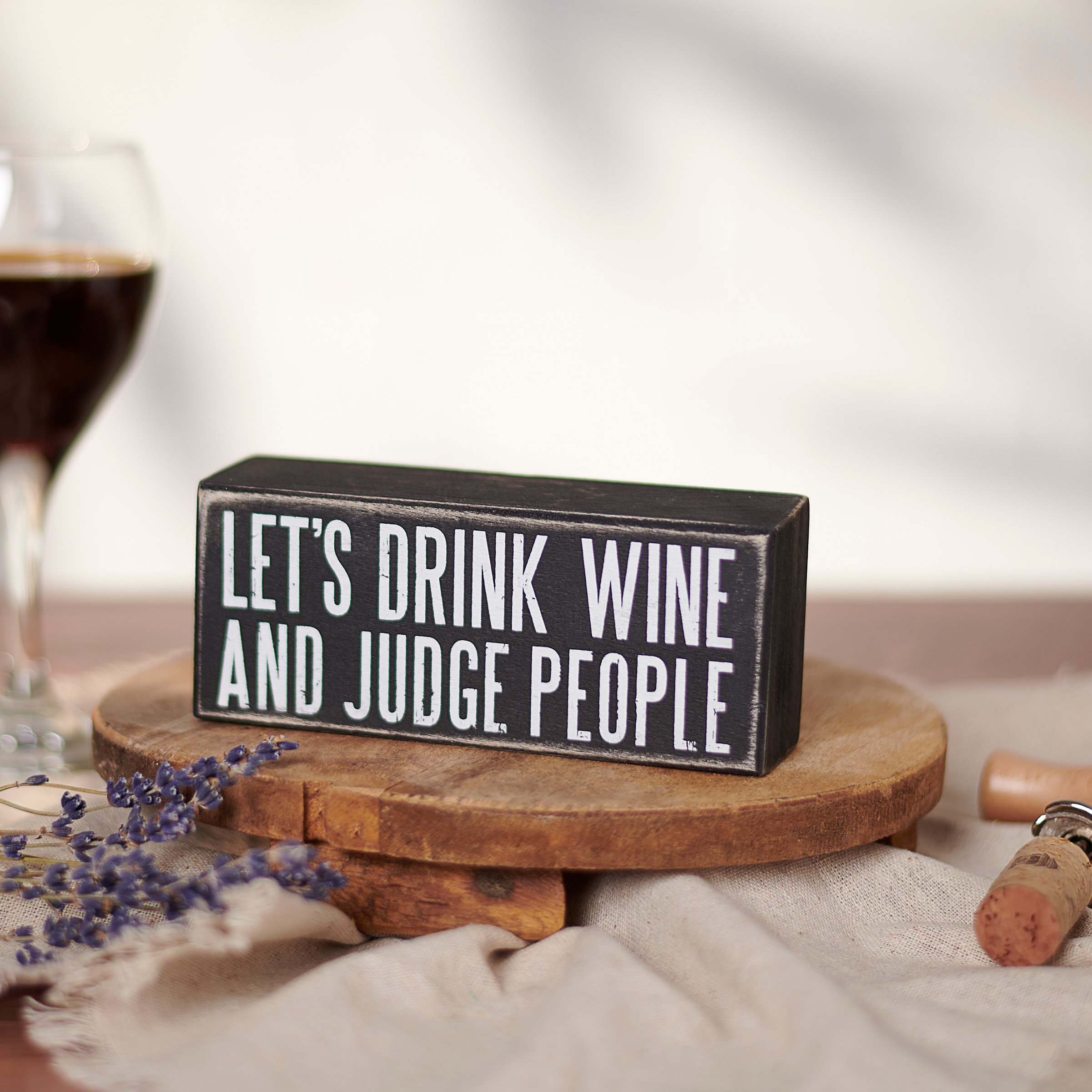 A classic black and white box sign featuring "Let's Drink Wine And Judge People" sentiment. Easy to hang or can free-stand alone.